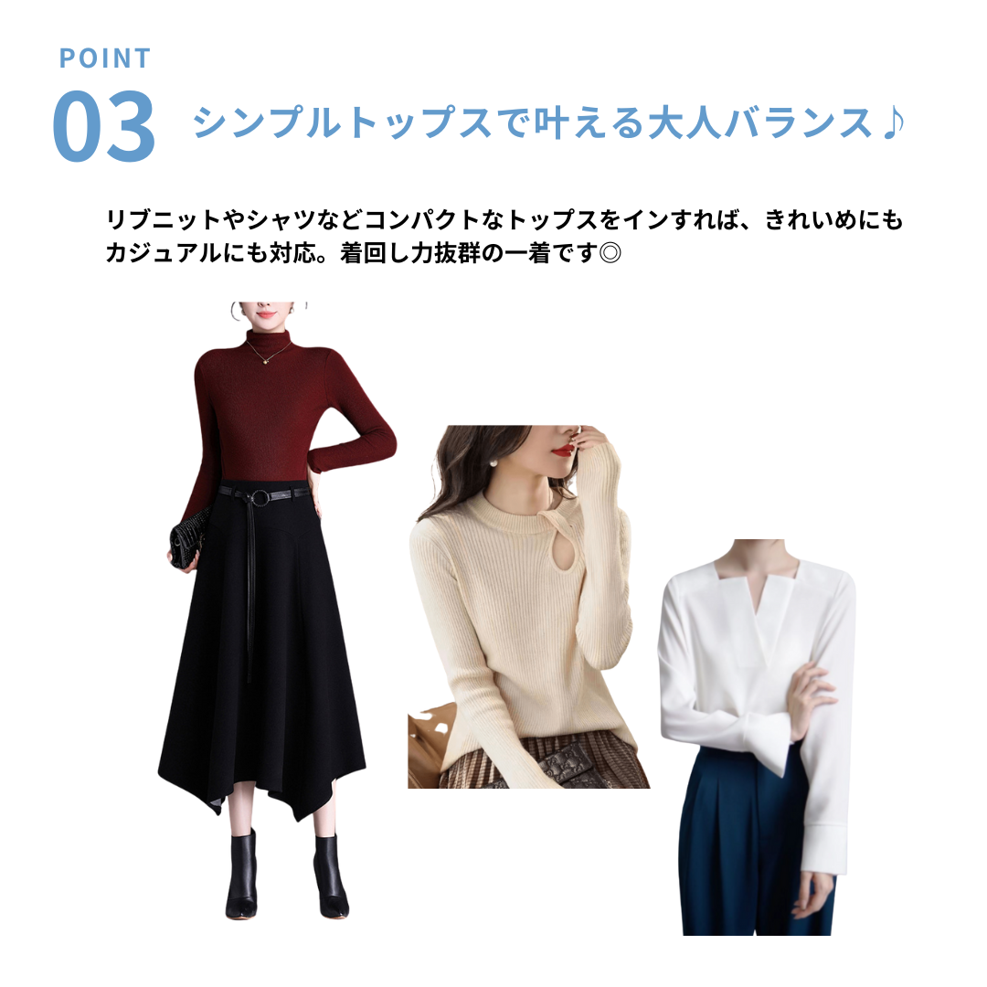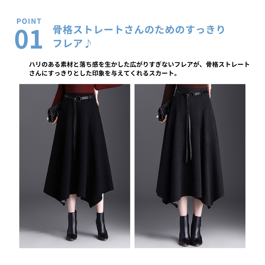 直線的なラインが得意な骨ストさんを、すっきりした印象に導くベルト付きロングフレアスカート。広がりを抑えたフレアシルエットで、腰まわりのボリュームを出しすぎず縦ラインを強調します。アシンメトリーな裾デザインが動きをプラスしながらも甘さを抑え、大人っぽいバランスに。ウエスト位置は高すぎず、付属ベルトで程よく引き締めることで脚長見えも叶います。