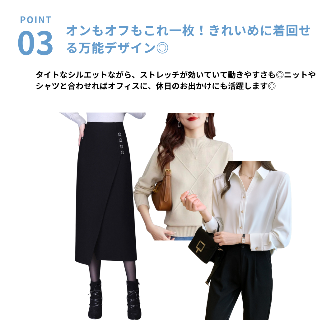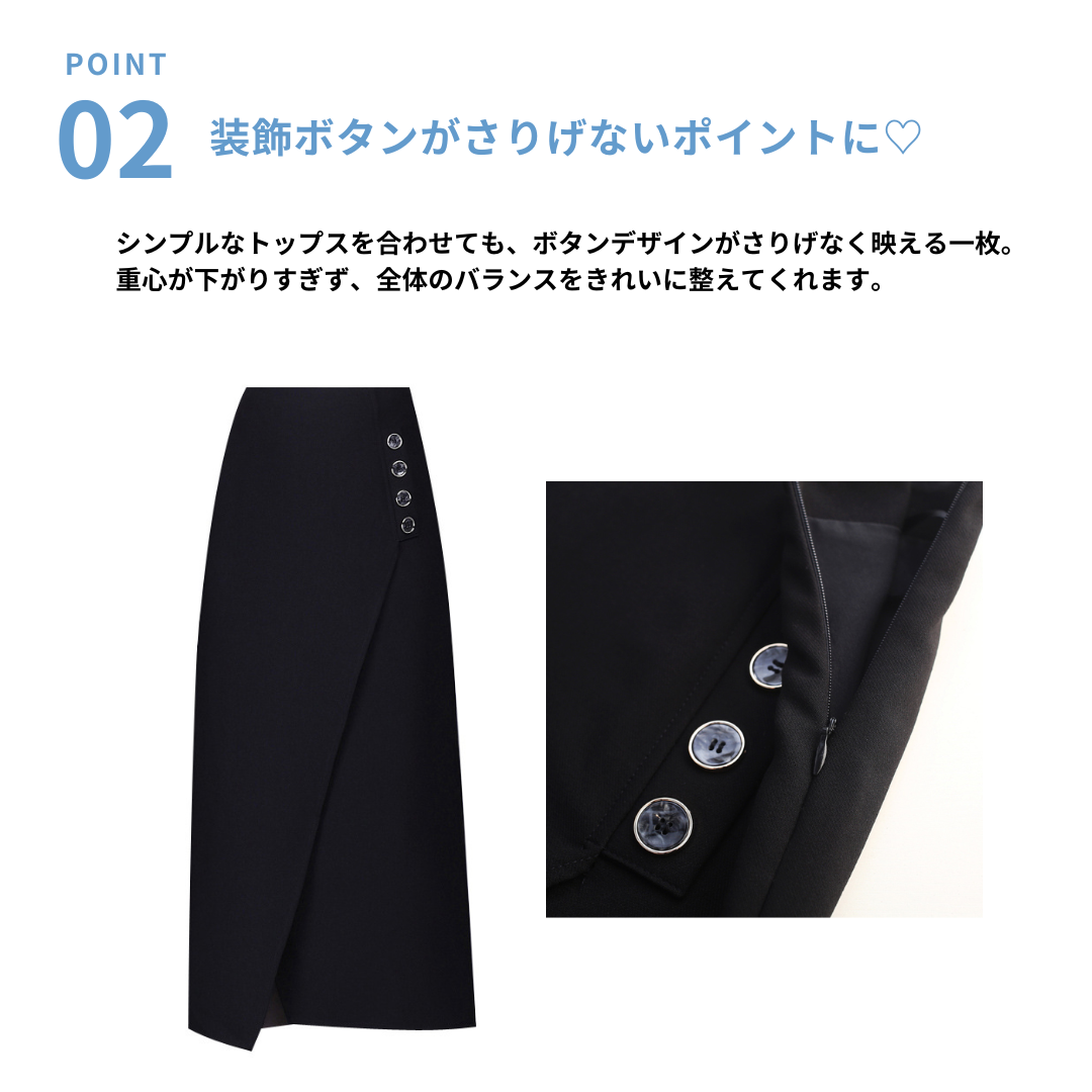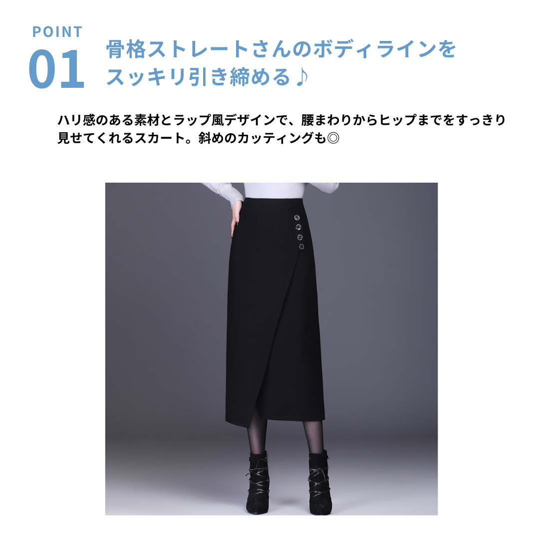 直線的な美シルエットが魅力のラップ風スカート。ハリ感のある生地と斜めのカッティングが、骨格ストレートさんにはボディラインの引き締め効果をもたらします。装飾ボタンがスタイリングにアクセントを添え、品よく洗練された印象に。オンオフ問わず活躍する一着です。