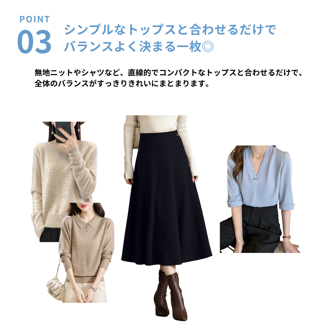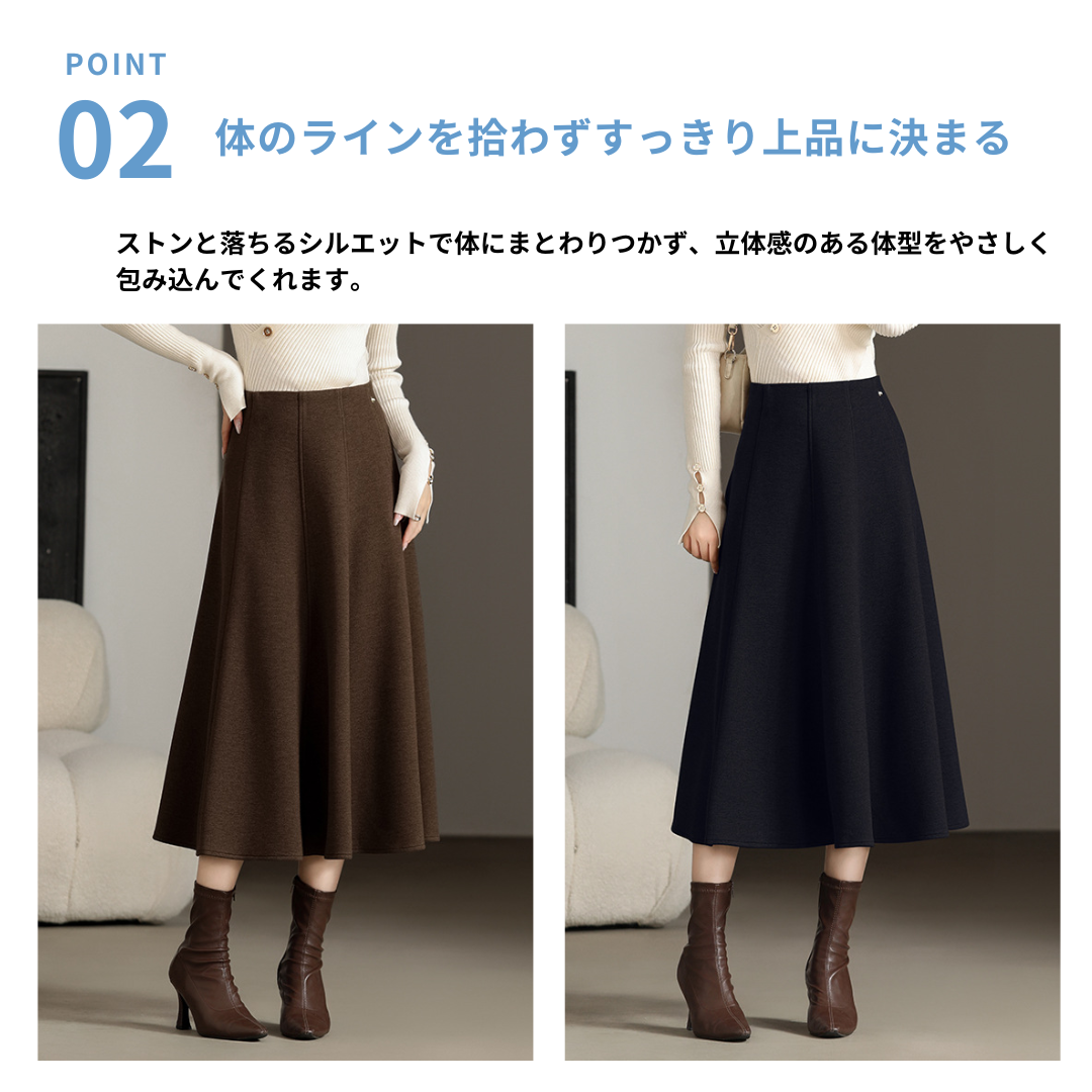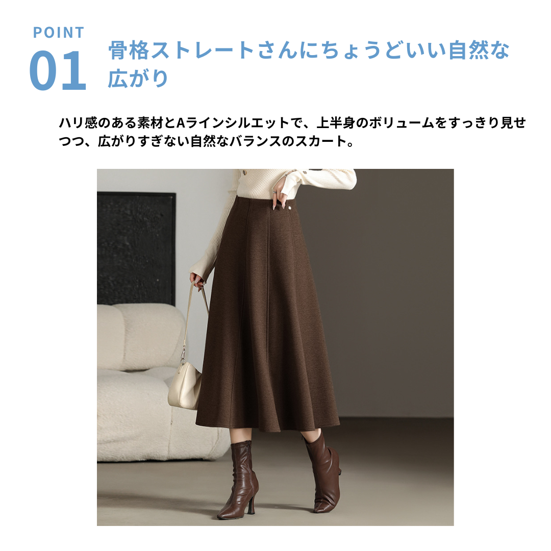 厚みのある上半身と腰位置が高めな骨ストさんにフィットする、フレアスカート。ウエストから裾にかけて自然に広がるシルエットが、下半身のボリュームを抑えつつ縦ラインを強調し、すっきりとした印象に仕上がります。ハリのある素材が体のラインを拾いにくく、上品さと美しさを両立。トップスはシンプルなニットやシャツと合わせると、バランスよく着こなせます。