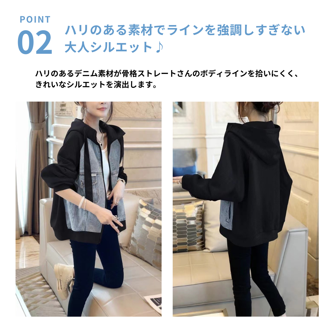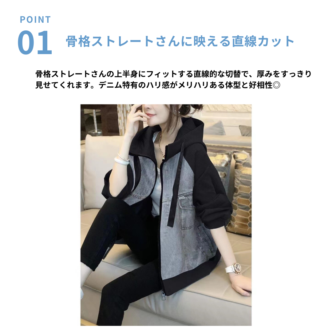 立体感のあるシルエットとハリのあるデニム素材が特徴のパーカージャケット。直線的でシンプルな切り替えデザインが、上半身の厚みをすっきり見せてスタイルアップ効果を発揮。すとんと落ちる程よいゆとり感で、リラックス感とシャープさを両立します。