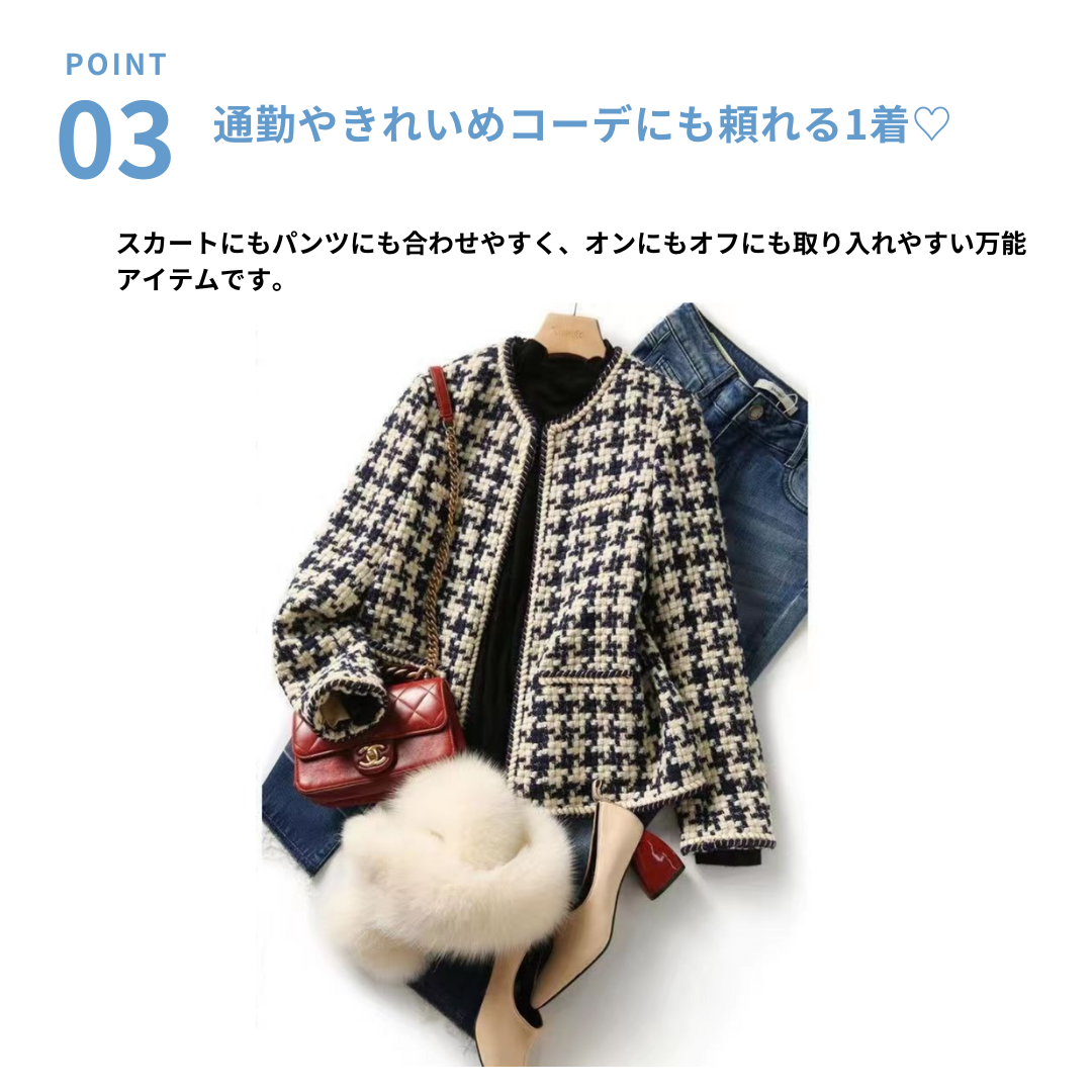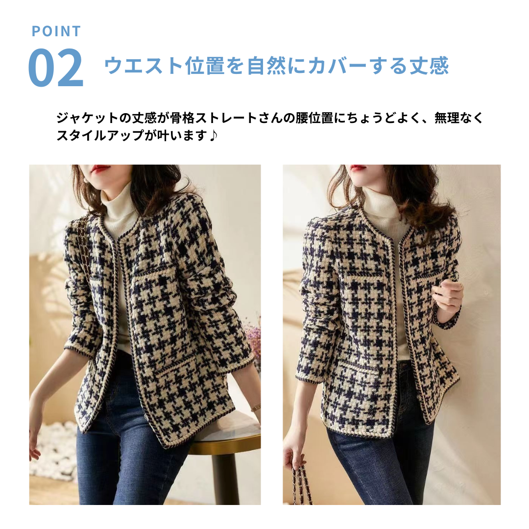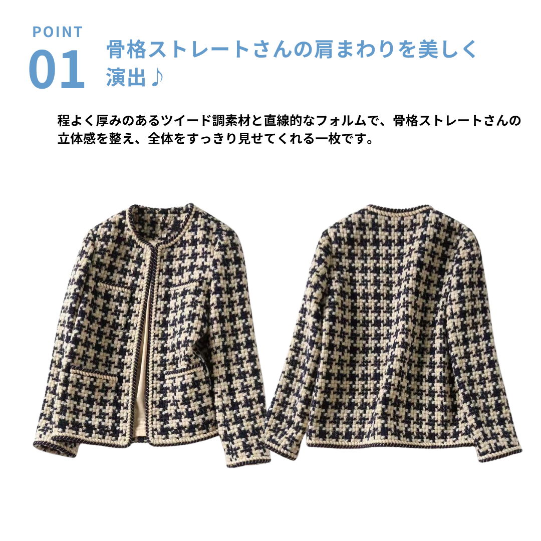 骨格ストレートさんにおすすめの、きちんと感と高級感を兼ね備えたツイード風ノーカラージャケット。程よいハリのある素材と直線的なシルエットが上半身の立体感を引き締め、洗練された印象に。ジャケットの丈も腰位置に自然にフィットし、スタイルアップ効果も抜群です。