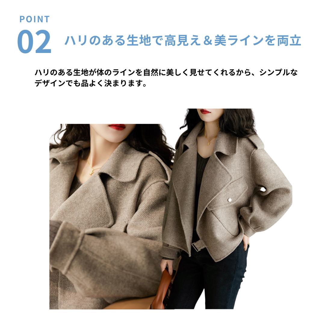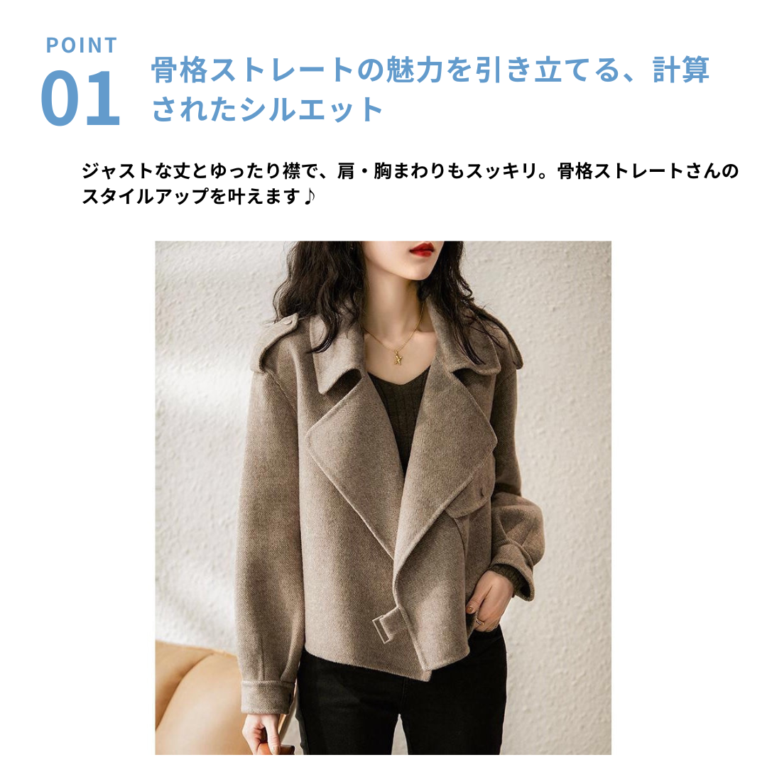 しっかりとした骨格を美しく見せる、骨格ストレートさんおすすめのジャケット。ハリのある生地と直線的なカッティングが、身体のラインを整え、洗練された印象に。大きめの襟とジャストな着丈がスタイルアップを叶える、大人のきれいめカジュアルにぴったりな1枚です。