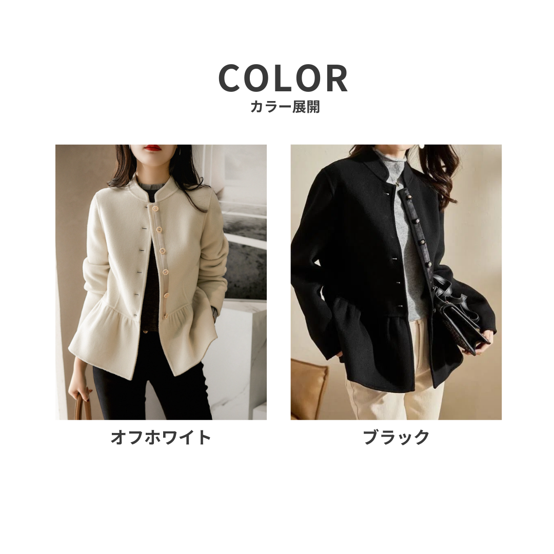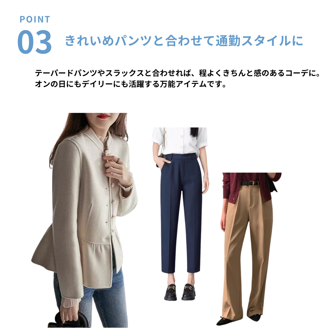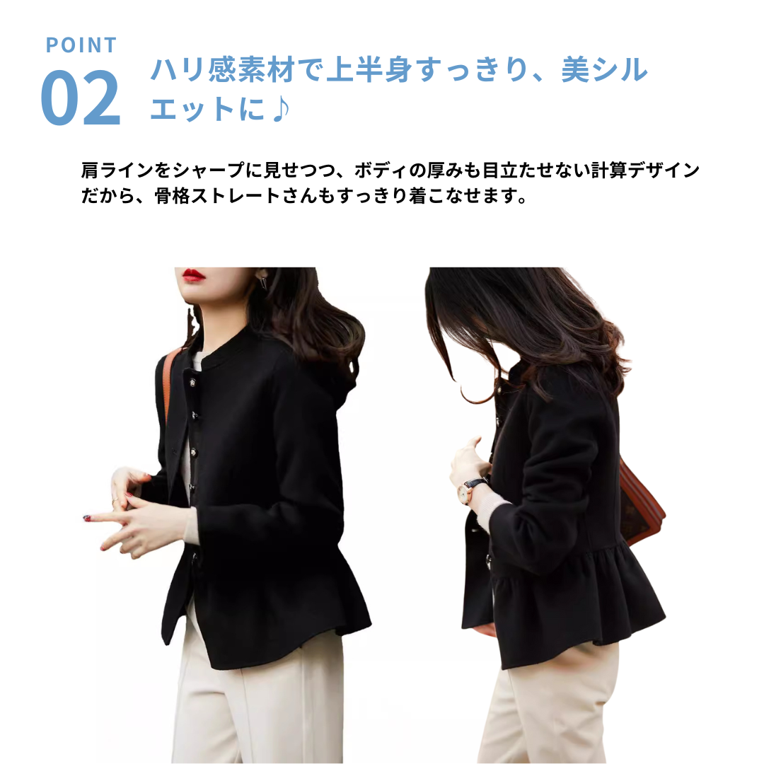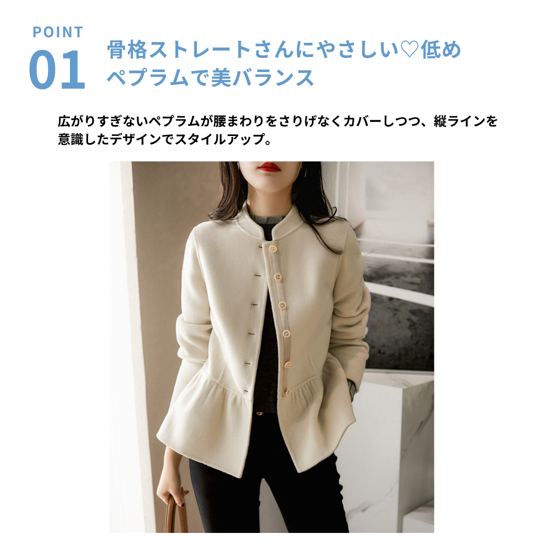 上半身に立体感が出やすいストレートさんを、すっきり端正に見せるスタンドカラーペプラムジャケット。直線的な肩ラインと程よくハリのある素材が、体の厚みを拾いにくくきれいなシルエットをキープ。広がりも控えめなペプラムでウエストまわりを自然に整えつつ、甘さを抑えた大人バランスに仕上がります。パンツ合わせでももたつかず、通勤からきれいめシーンまで活躍する一着です。