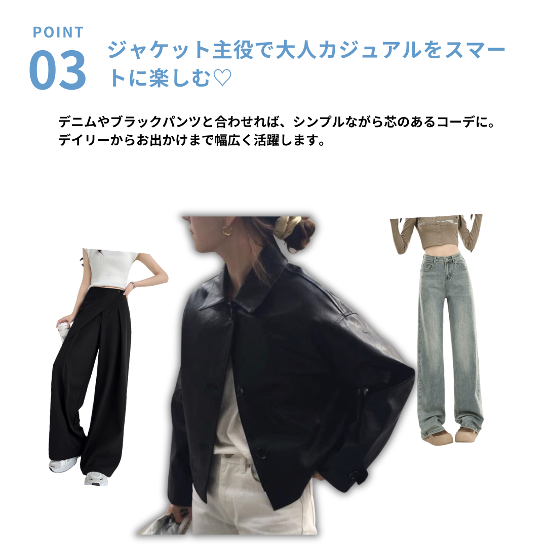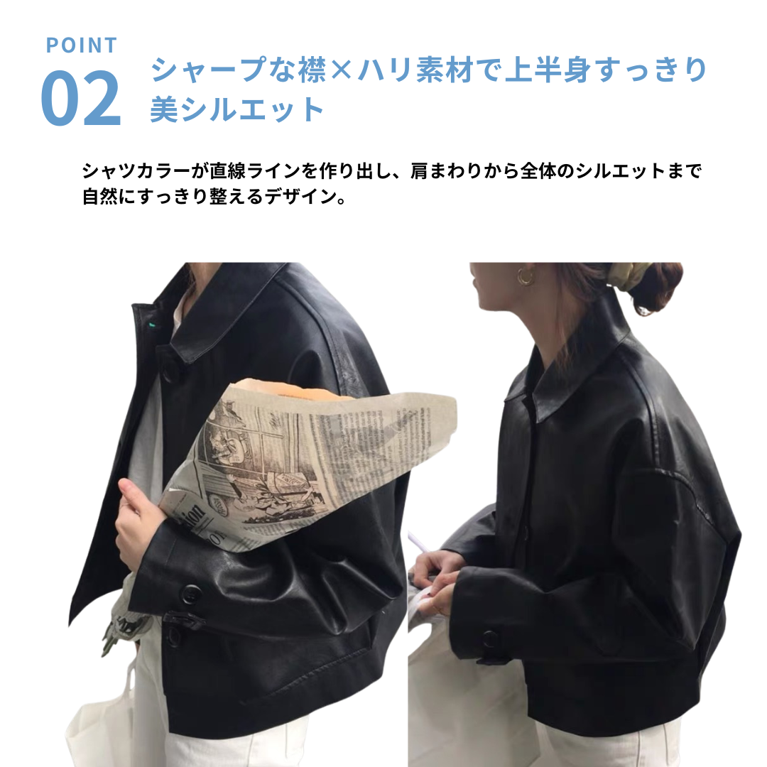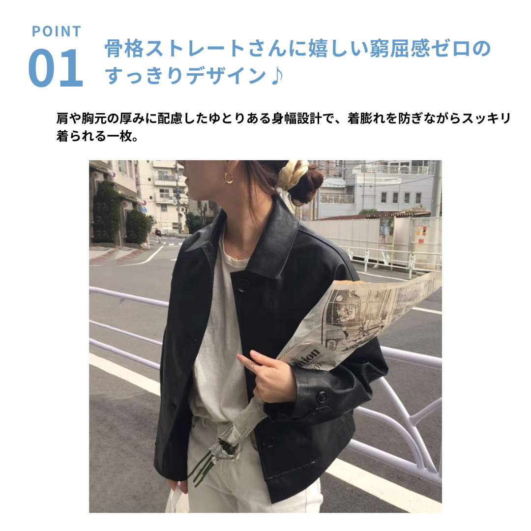 上半身に厚みが出やすい骨ストさんの悩みに寄り添う、シャツカラーのPUレザージャケット。直線的な襟デザインと程よいハリ感のある素材が、体の立体感を強調せず、全体をすっきりと整えます。身幅に余裕を持たせることで窮屈さや着膨れ感を回避。羽織るだけでコーデに芯が生まれ、骨格ストレートさんが得意な「シンプルで洗練された印象」を叶えます。