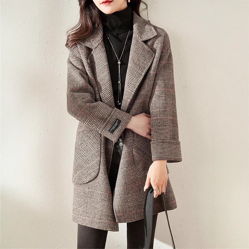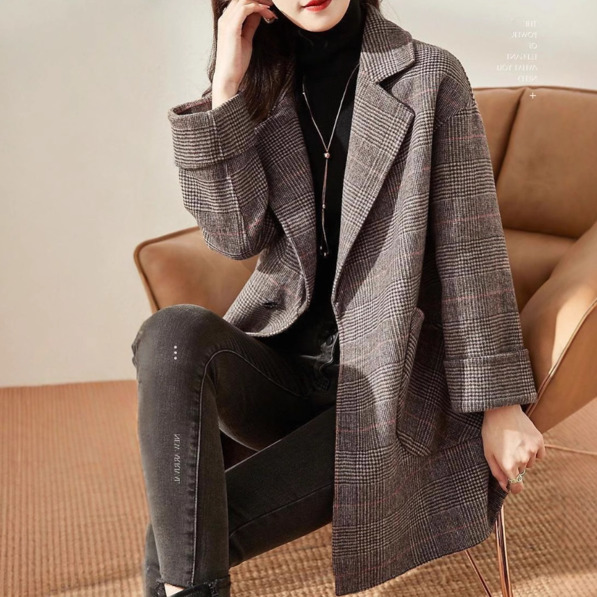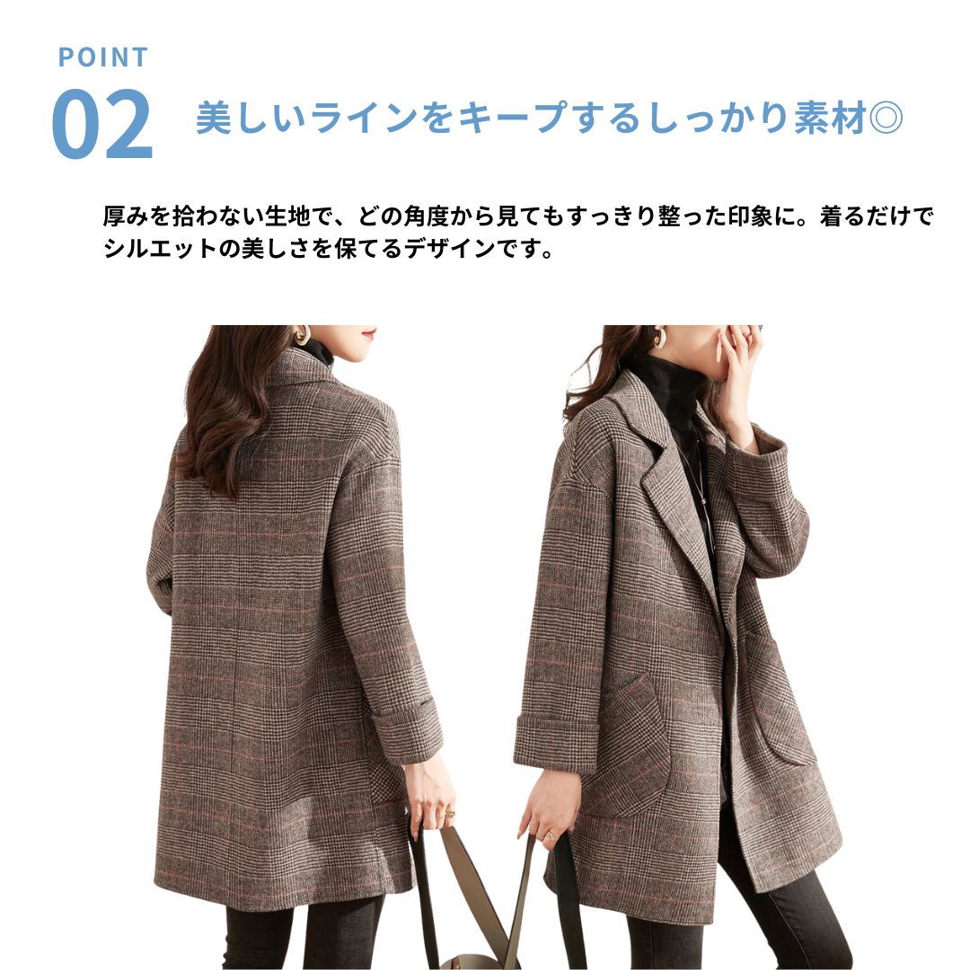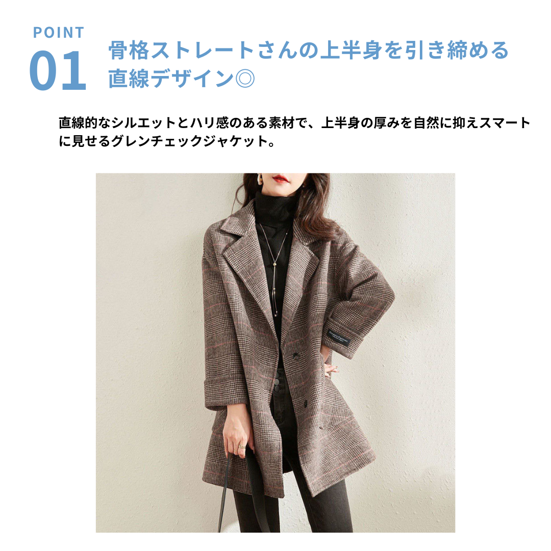 直線的でハリのあるグレンチェック柄のテーラードコートは、骨格ストレートさんの上半身の立体感を引き締め、美しく整ったシルエットに。身体の厚みを拾わないしっかりした生地感と直線的なデザインがスタイルアップ効果を発揮します。シンプルなパンツスタイルにも合わせやすく、オンにもオフにも活躍する一枚です。