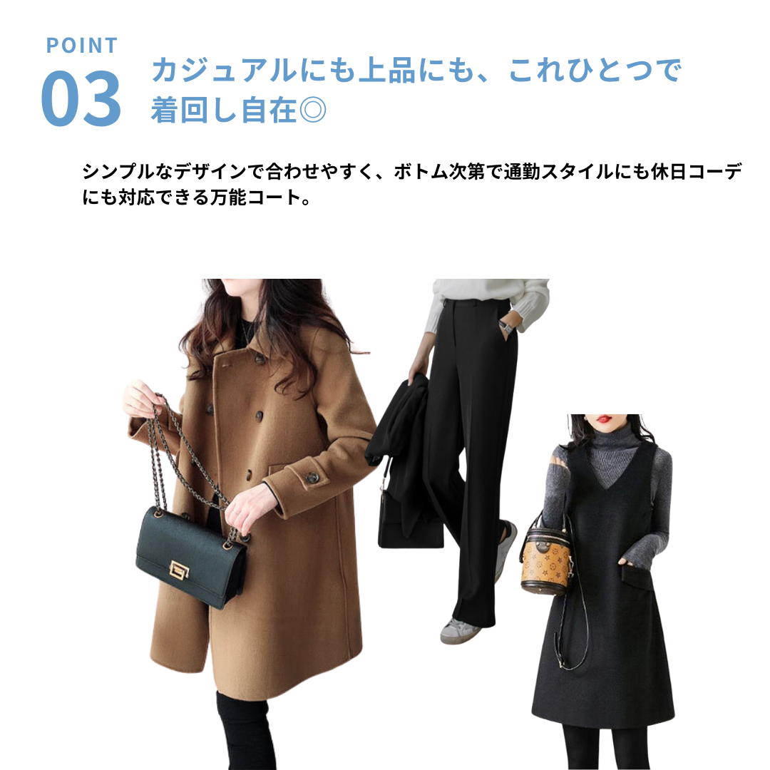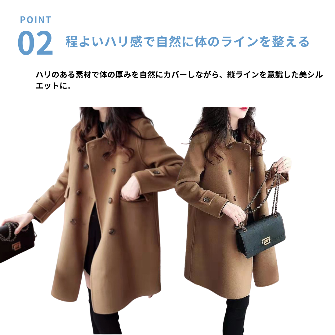 直線的なシルエットで、骨格ストレートさんの凛としたボディラインを美しく見せるコート。身体の厚みを拾いすぎず、自然にカバーしてくれる設計。程よい張り感が体のラインを整え、洗練された印象に仕上げてくれます。