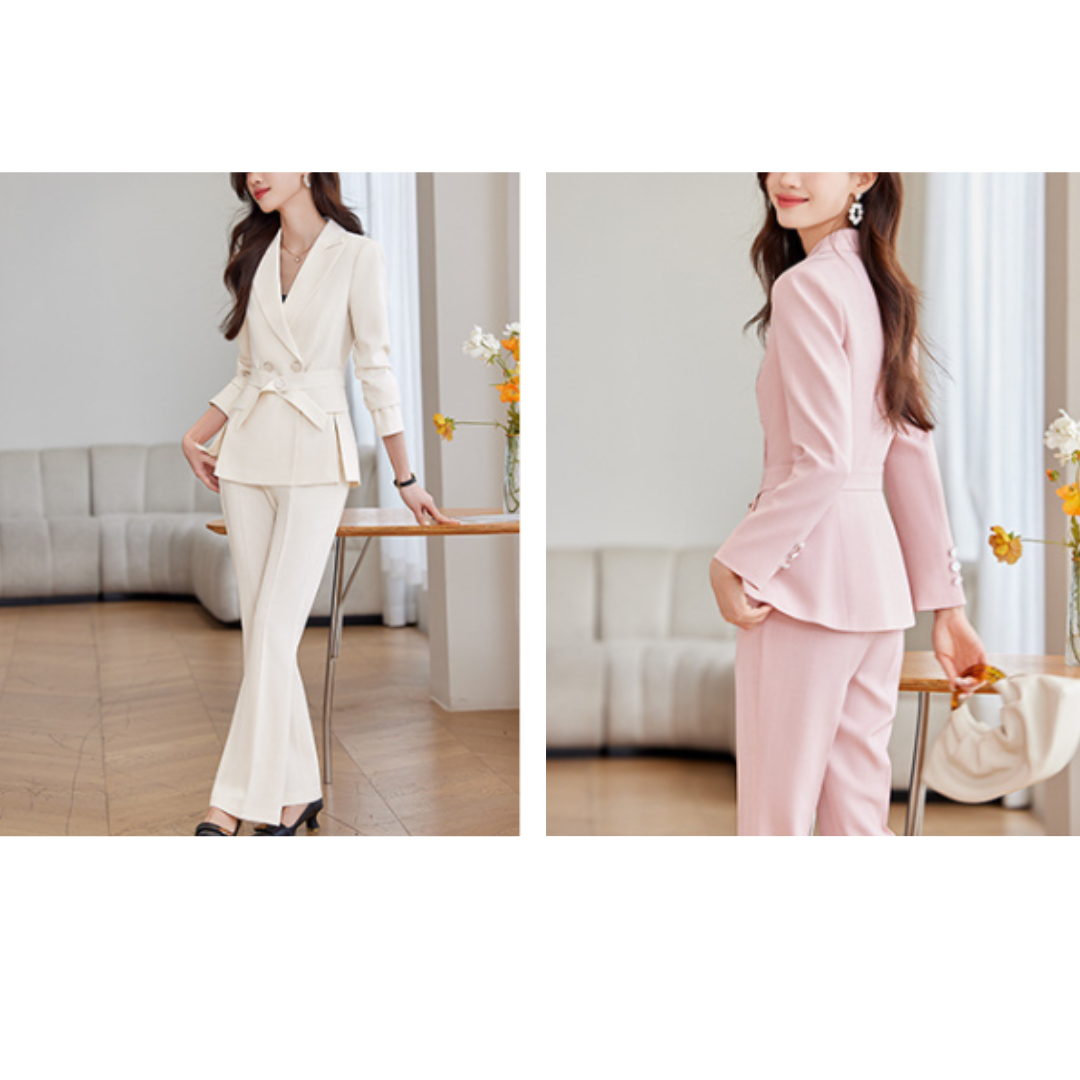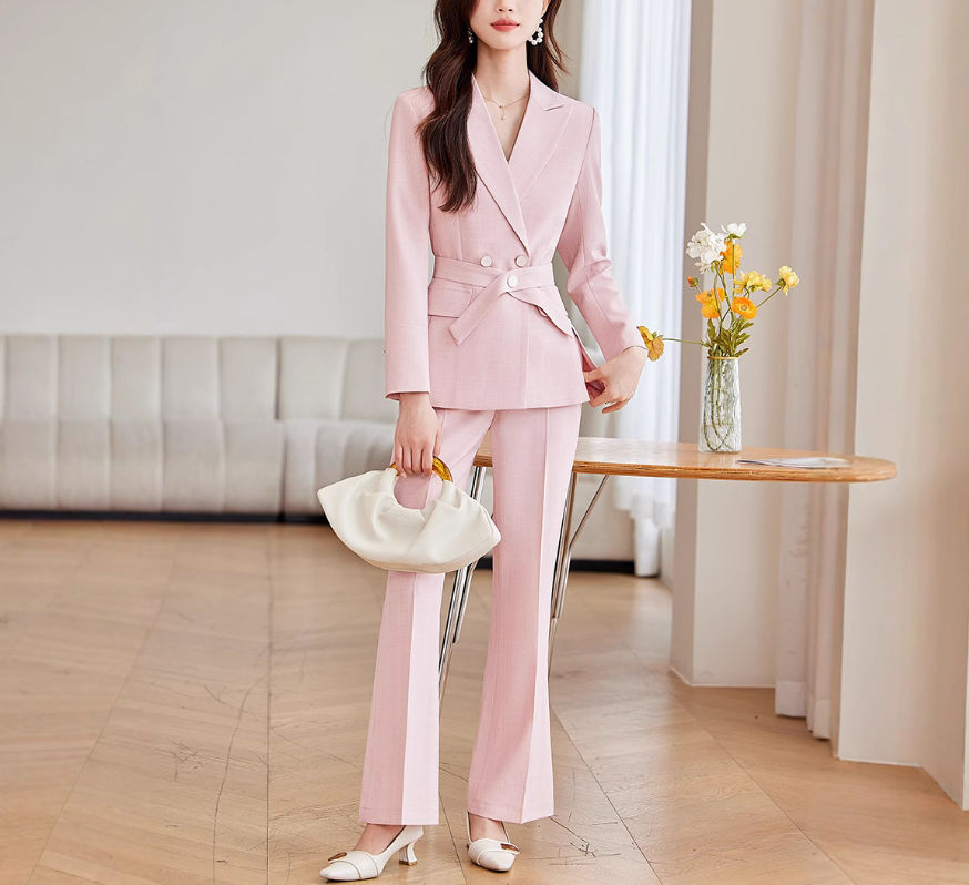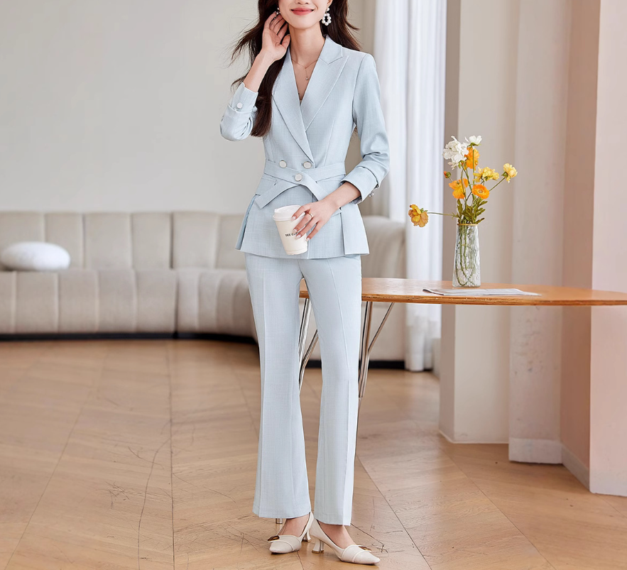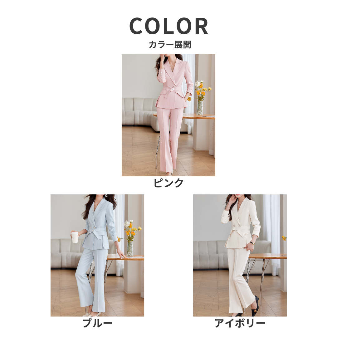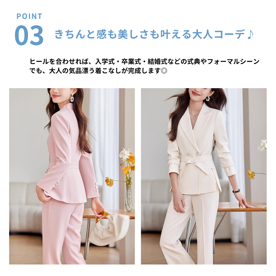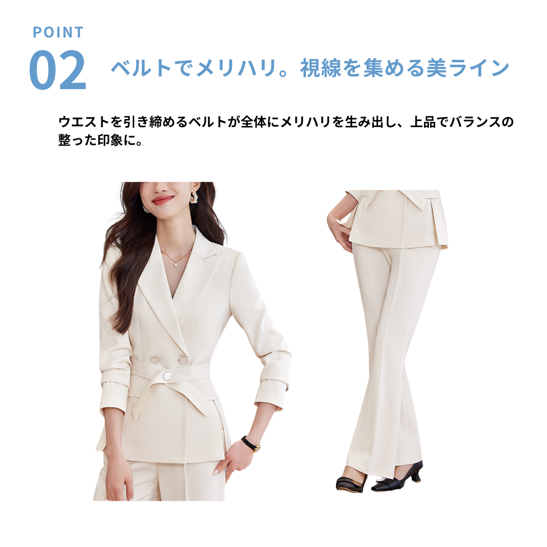 無駄のないシャープなラインが魅力のセットアップは、骨格ストレートさんの立体的なボディラインをすっきりと引き立てます。ウエストのボタンベルトが視線を集めつつ、全体を引き締める効果も。ストレートパンツは太ももまわりを拾いすぎず、美脚効果も抜群。洗練されたシルエットで、大人の品格漂う着こなしに。