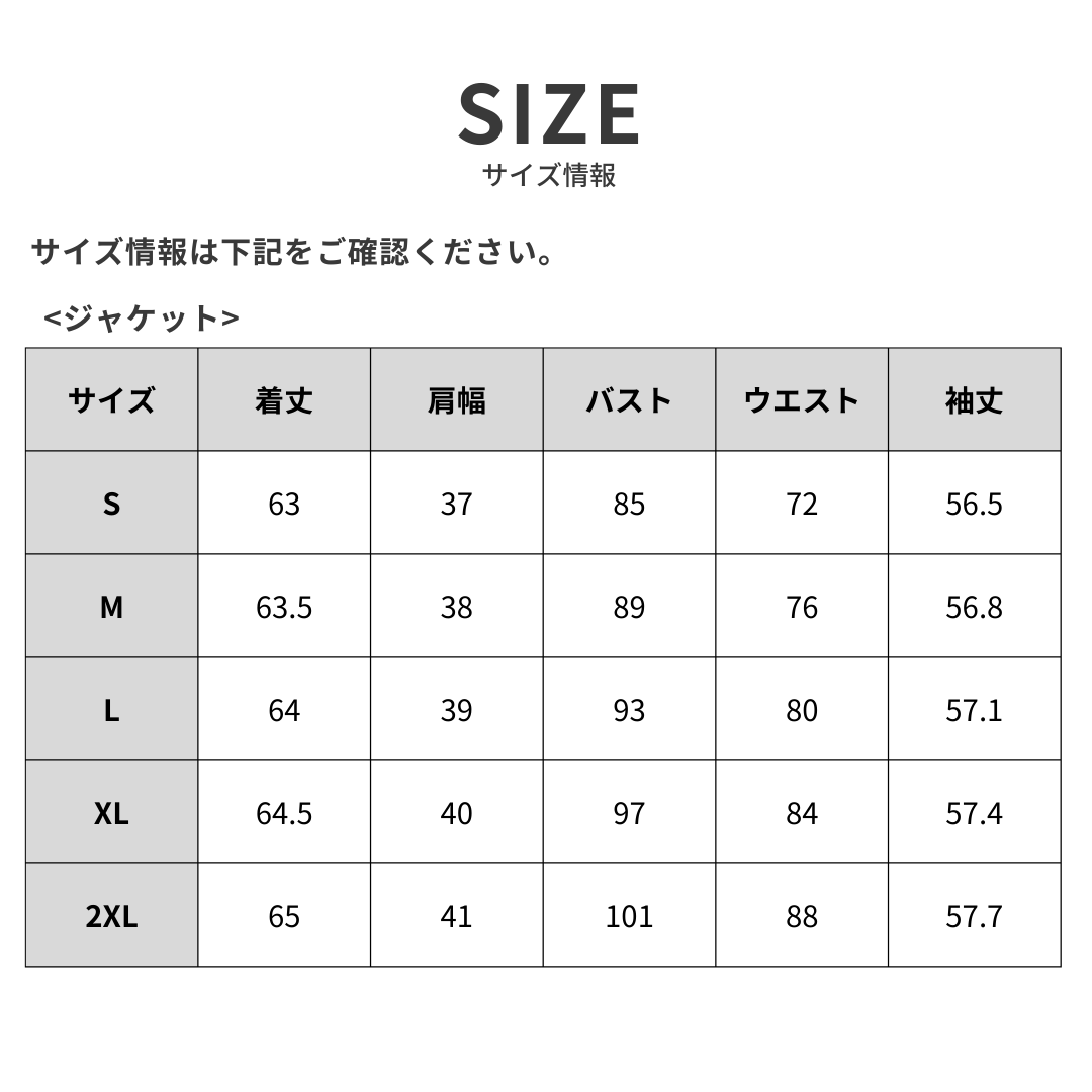 透け感:なし(淡色ややあり) 裏地:あり(ジャケットのみ) 伸縮性:なし 厚み:普通