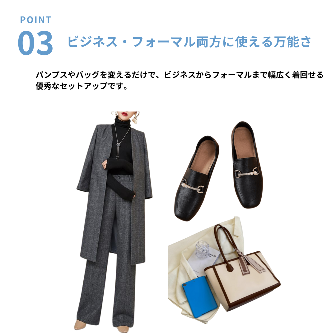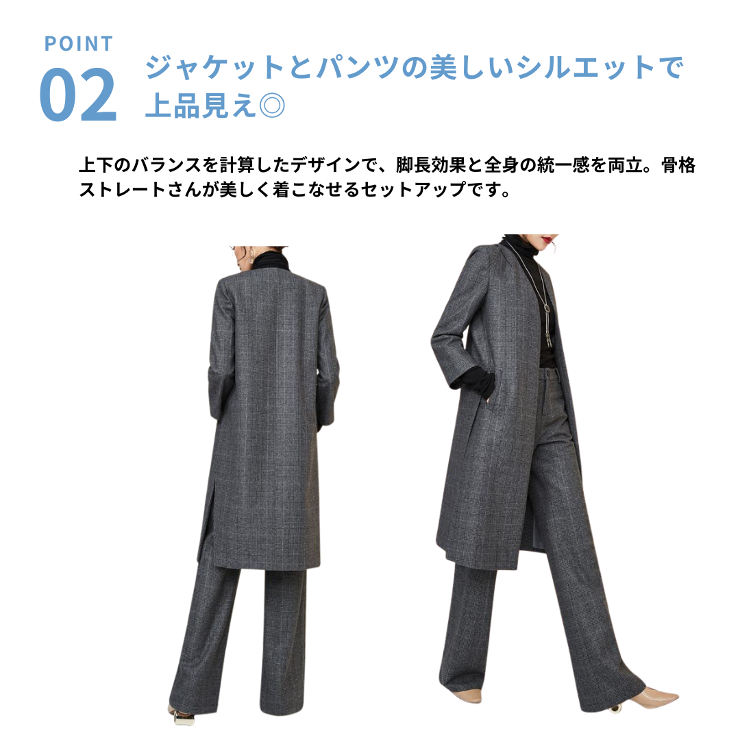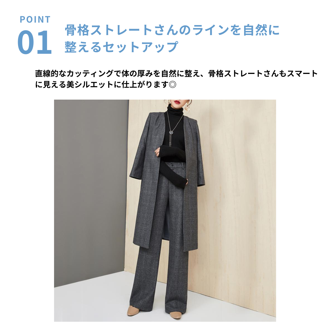 ハリ感のある上質素材と、シンプルな直線シルエットが魅力のセットアップ。骨格ストレートさんのしっかりした上半身をスマートに見せるジャケットと、脚のラインをまっすぐに整えるストレートパンツの組み合わせで、洗練された大人の雰囲気に。無駄のないミニマルなデザインで、ビジネスやフォーマルにも対応する万能アイテムです。