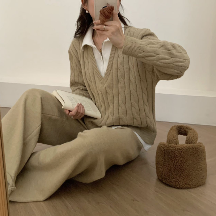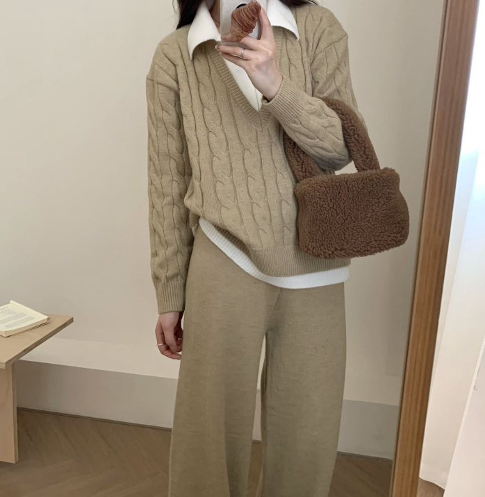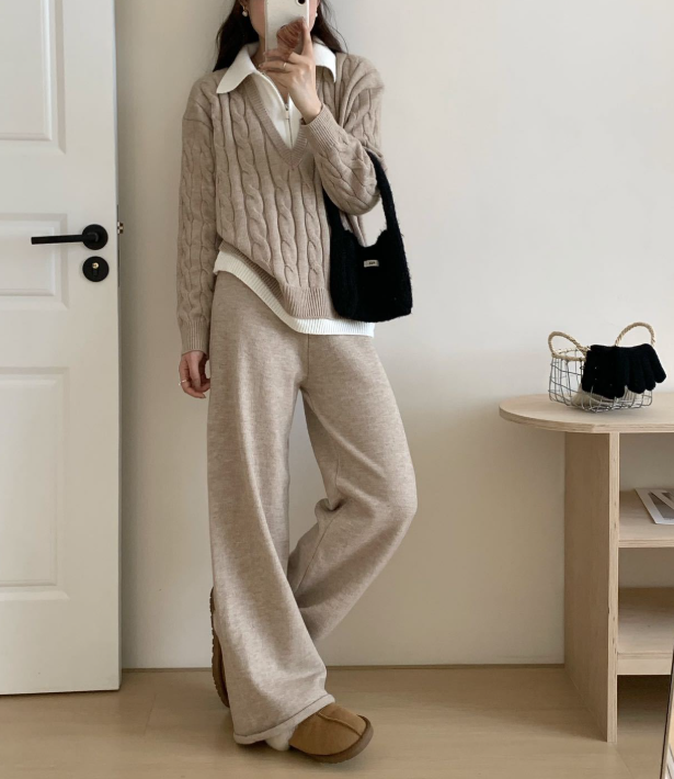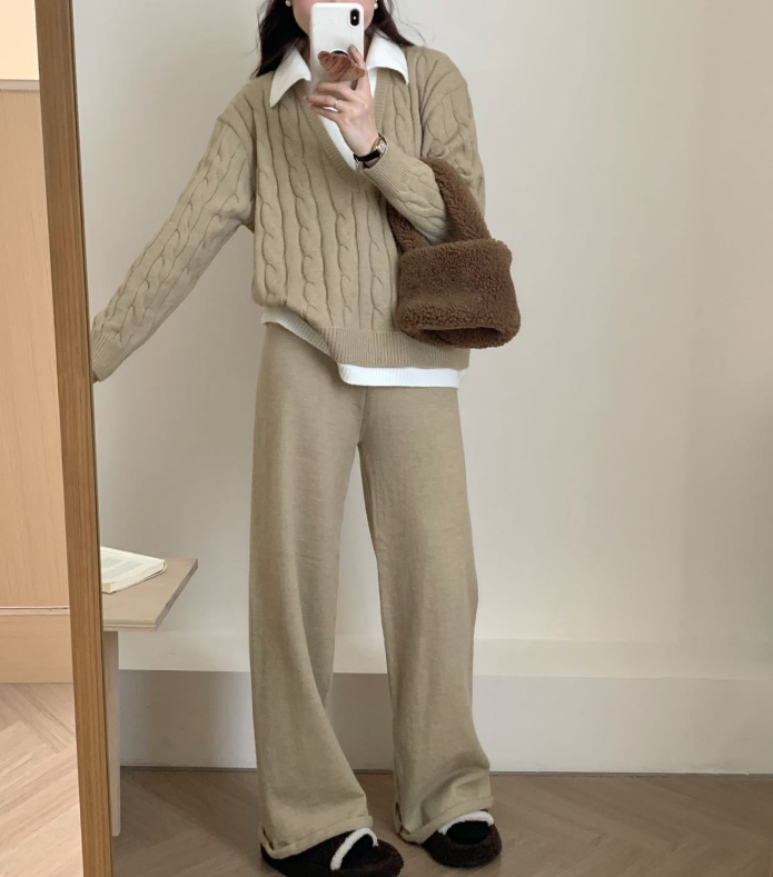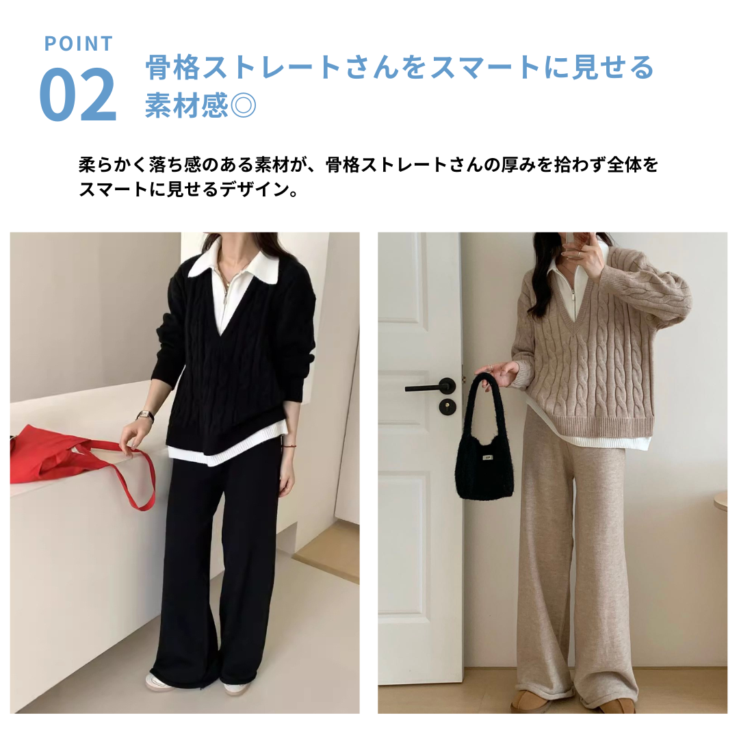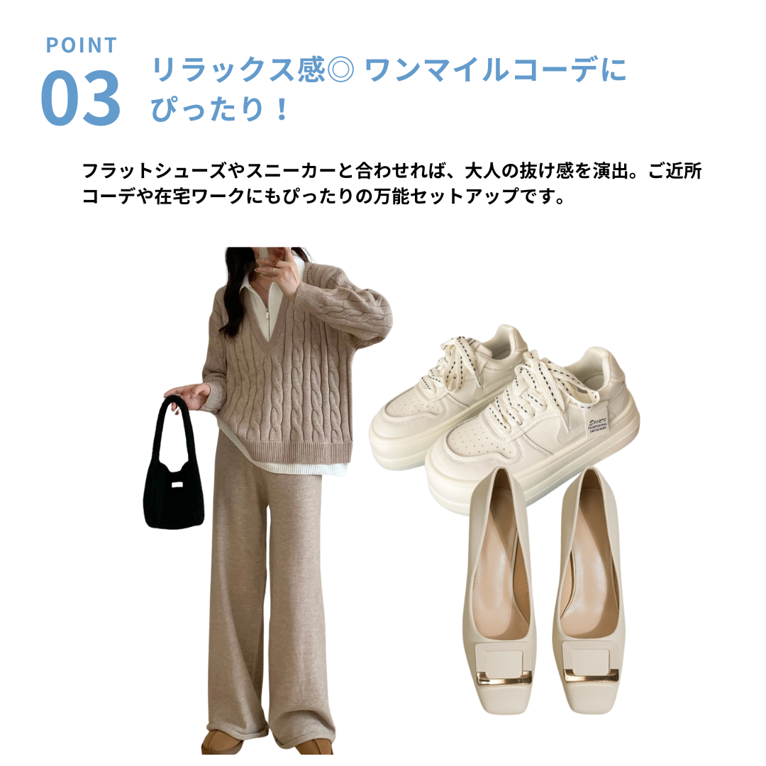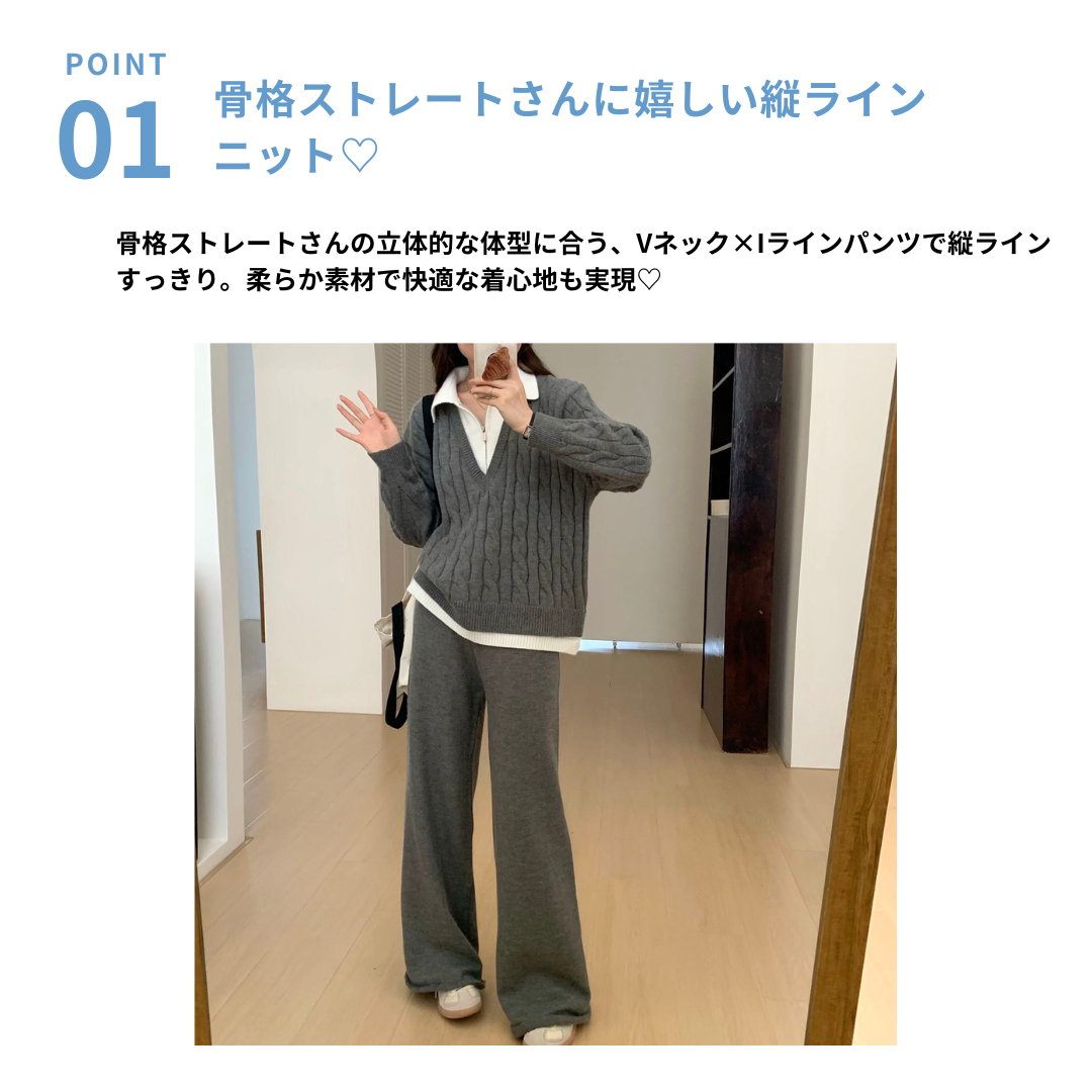 立体的なボディラインを活かす骨格ストレートさんにぴったりな、リラックス感のあるカジュアルセットアップ。縦のラインを強調するVネックニットと、程よくワイドなストレートパンツがすっきりとした印象を演出。柔らかい素材感ながら、身体の厚みを拾いすぎずスマートに着こなせます。日常使いにもぴったりの、抜け感ある大人のワンマイルコーデです。