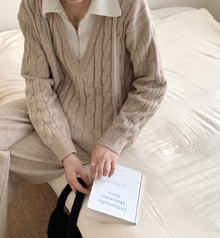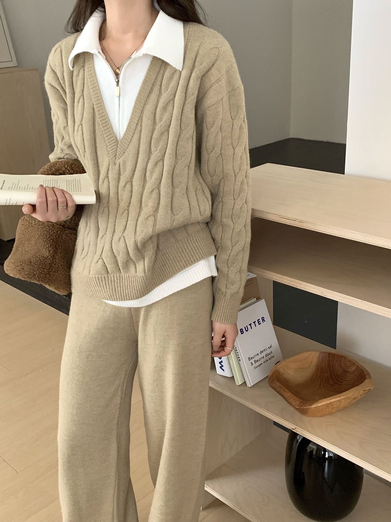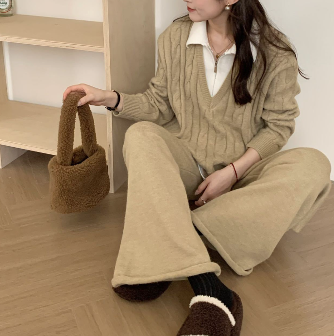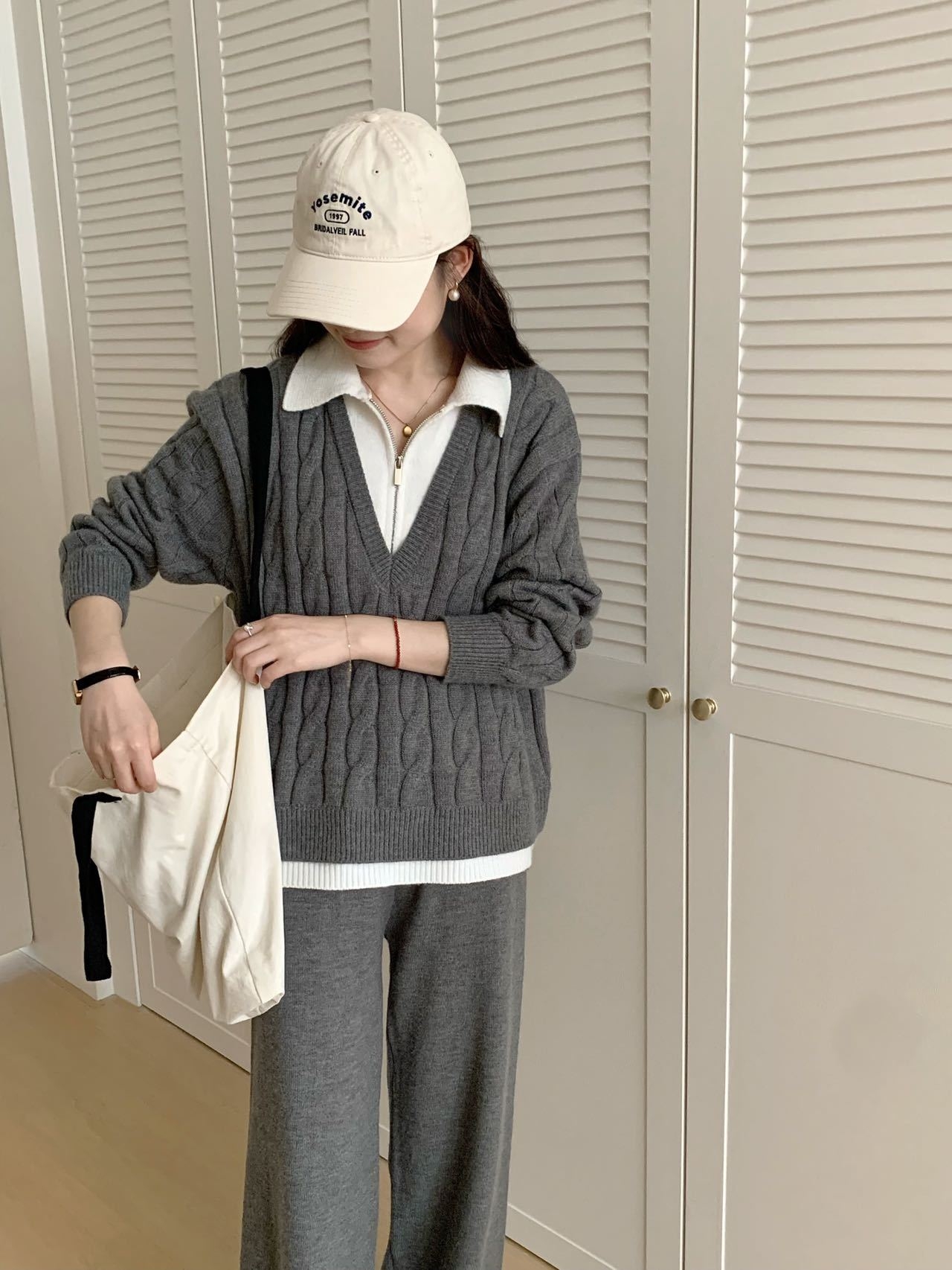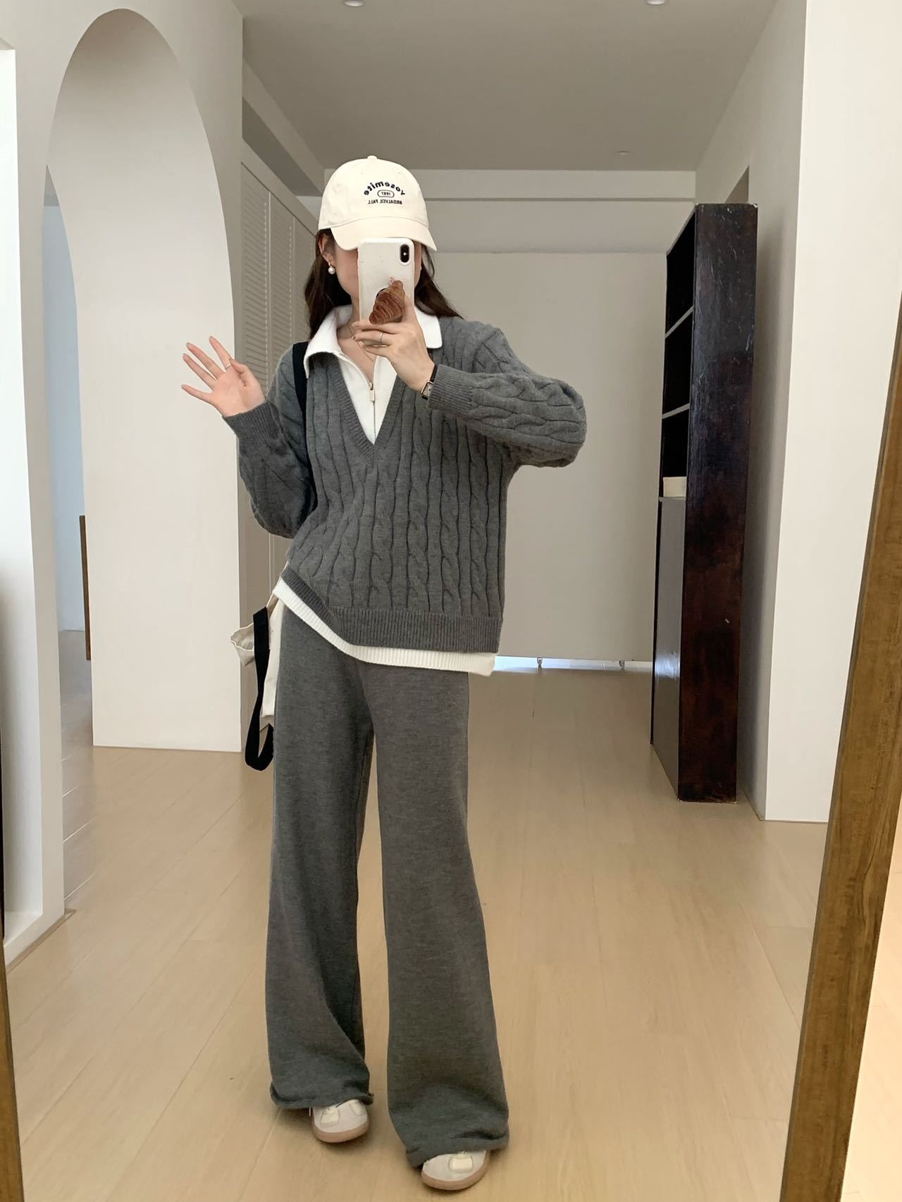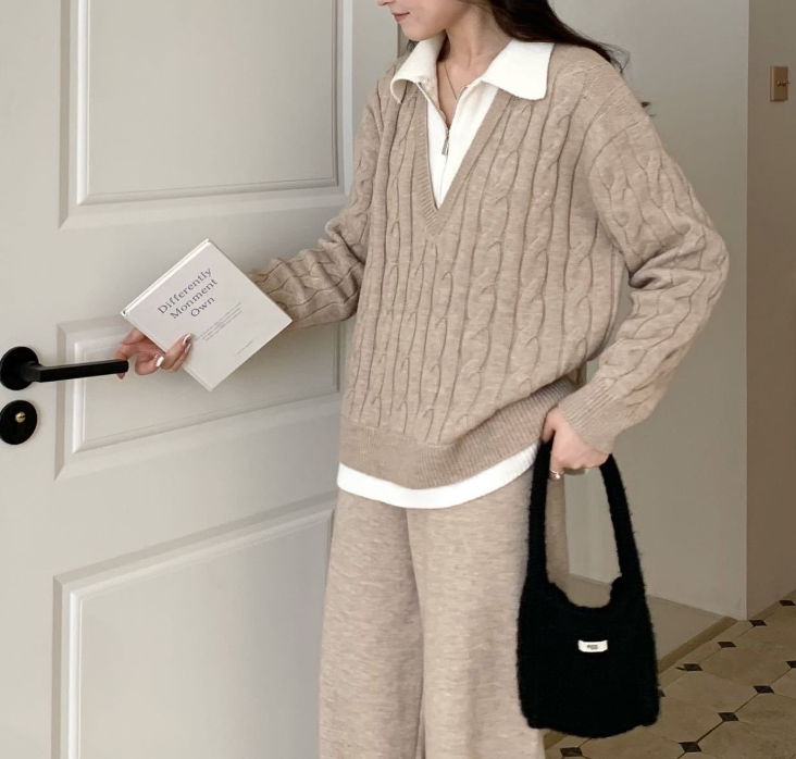 立体的なボディラインを活かす骨格ストレートさんにぴったりな、リラックス感のあるカジュアルセットアップ。縦のラインを強調するVネックニットと、程よくワイドなストレートパンツがすっきりとした印象を演出。柔らかい素材感ながら、身体の厚みを拾いすぎずスマートに着こなせます。日常使いにもぴったりの、抜け感ある大人のワンマイルコーデです。