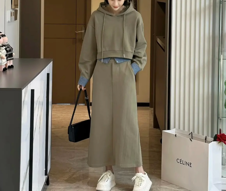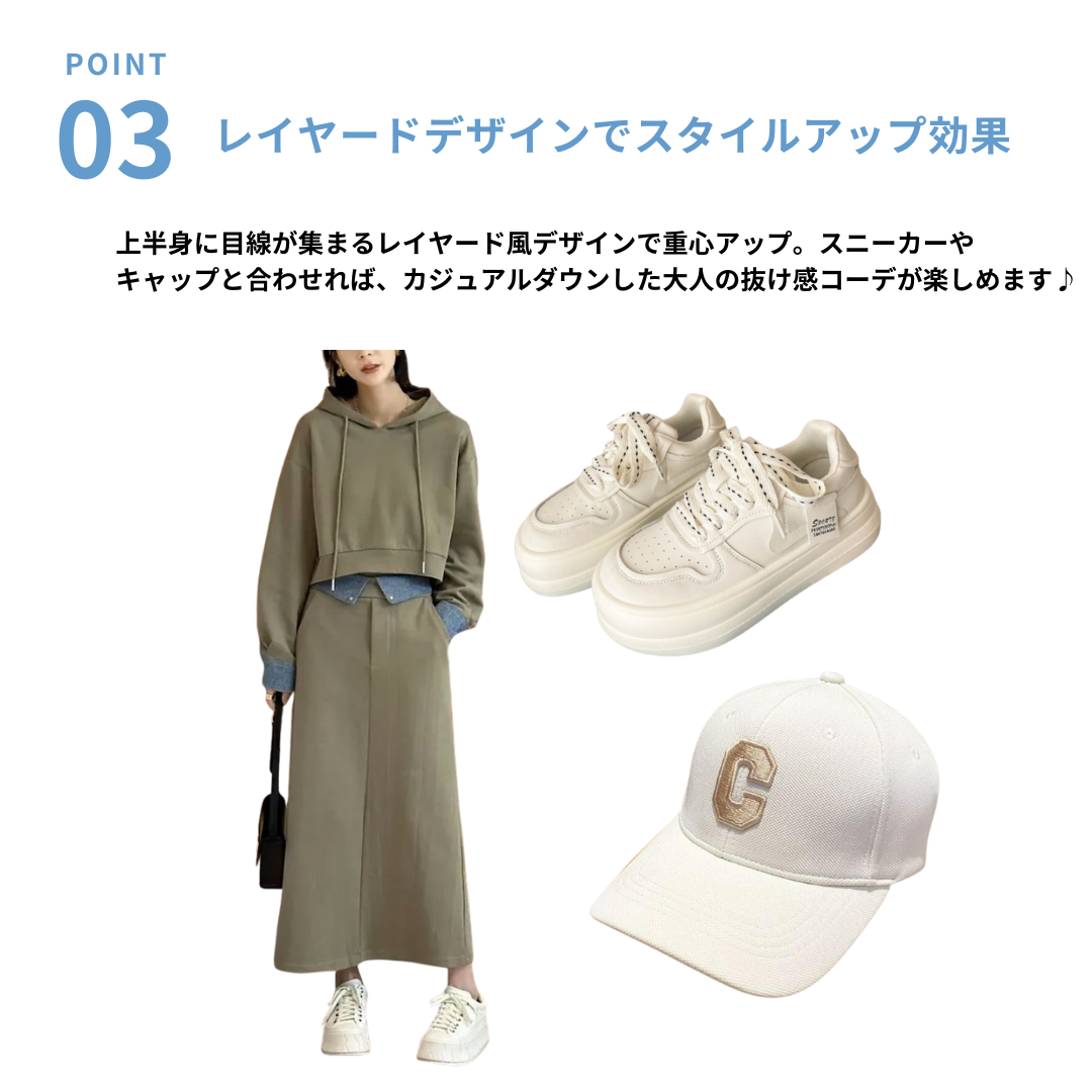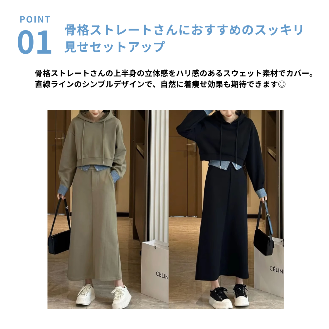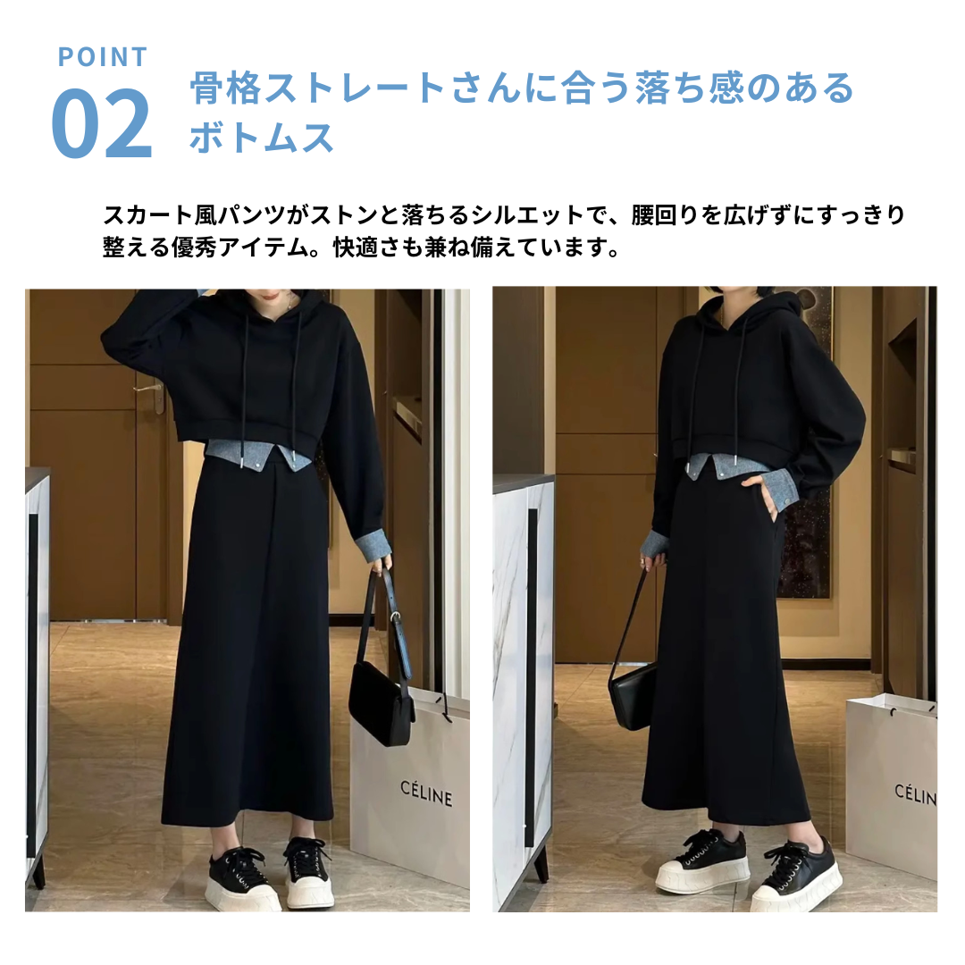立体感のある骨格ストレートさんには、ハリのある素材とシンプルな直線ラインが好相性。スッキリとしたパーカーとストレートスカートが、体のラインをスマートに整えてくれます。重ね着風デザインで目線を上に集め、スタイルアップも叶う優秀セットアップ。