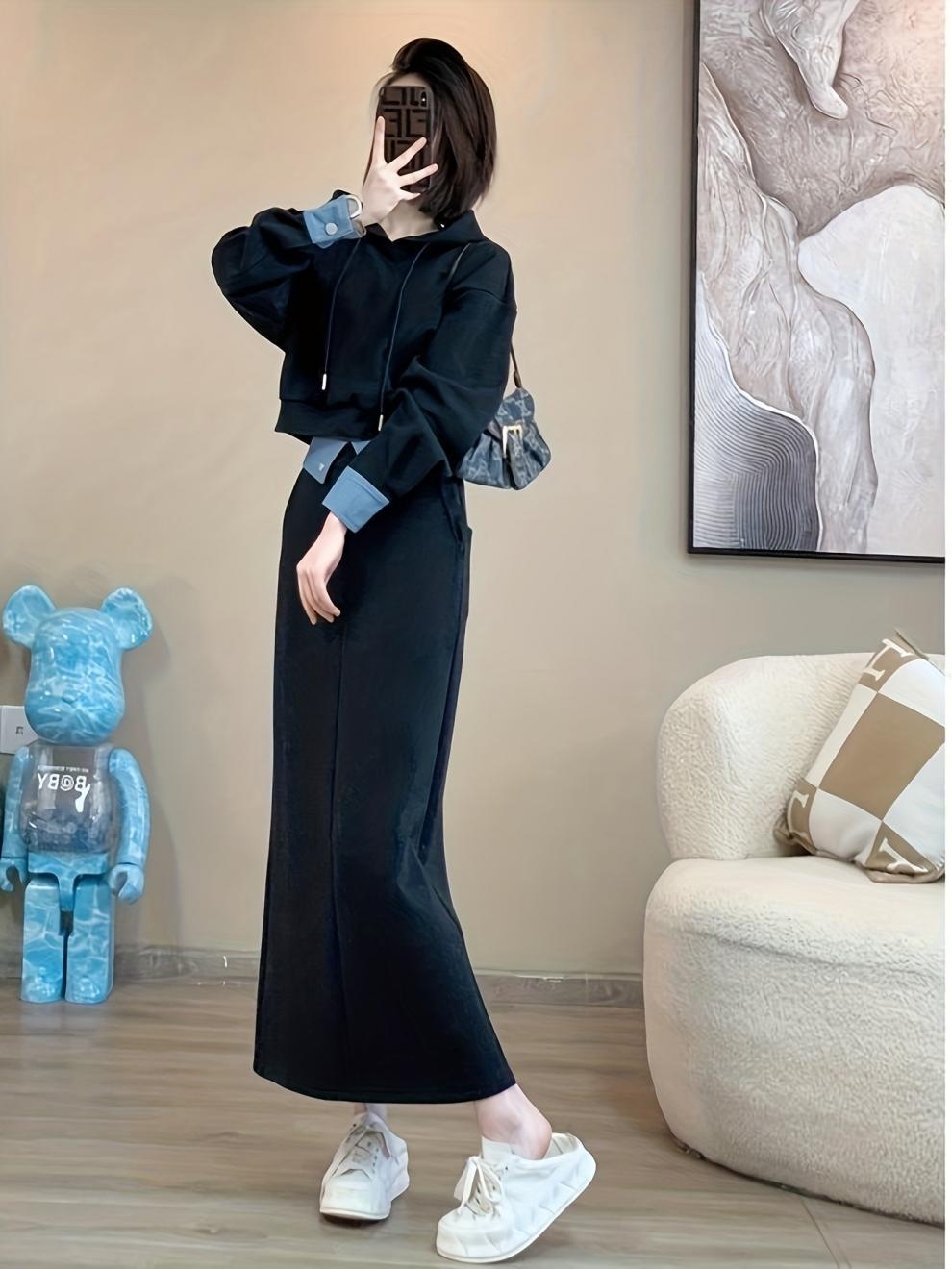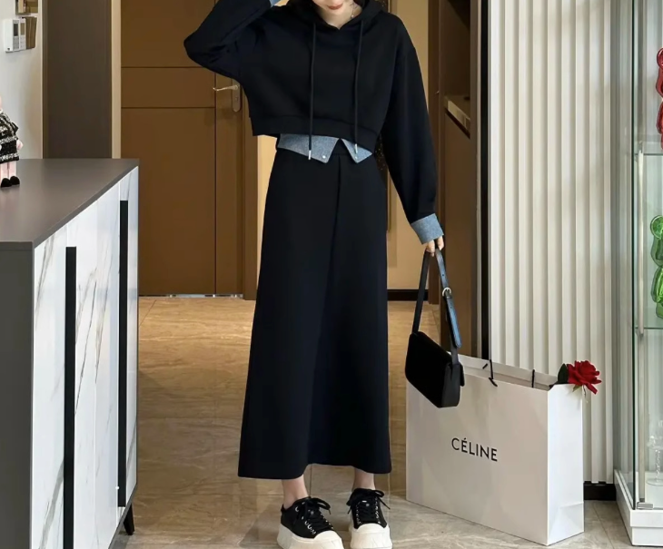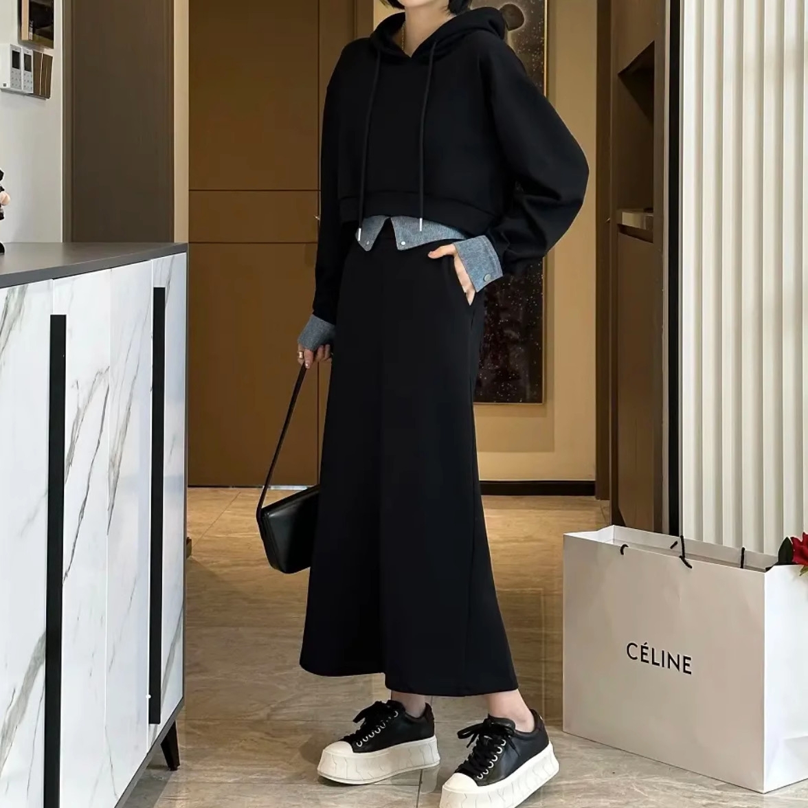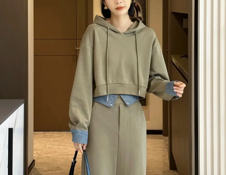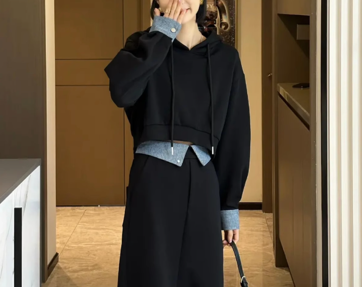 立体感のある骨格ストレートさんには、ハリのある素材とシンプルな直線ラインが好相性。スッキリとしたパーカーとストレートスカートが、体のラインをスマートに整えてくれます。重ね着風デザインで目線を上に集め、スタイルアップも叶う優秀セットアップ。