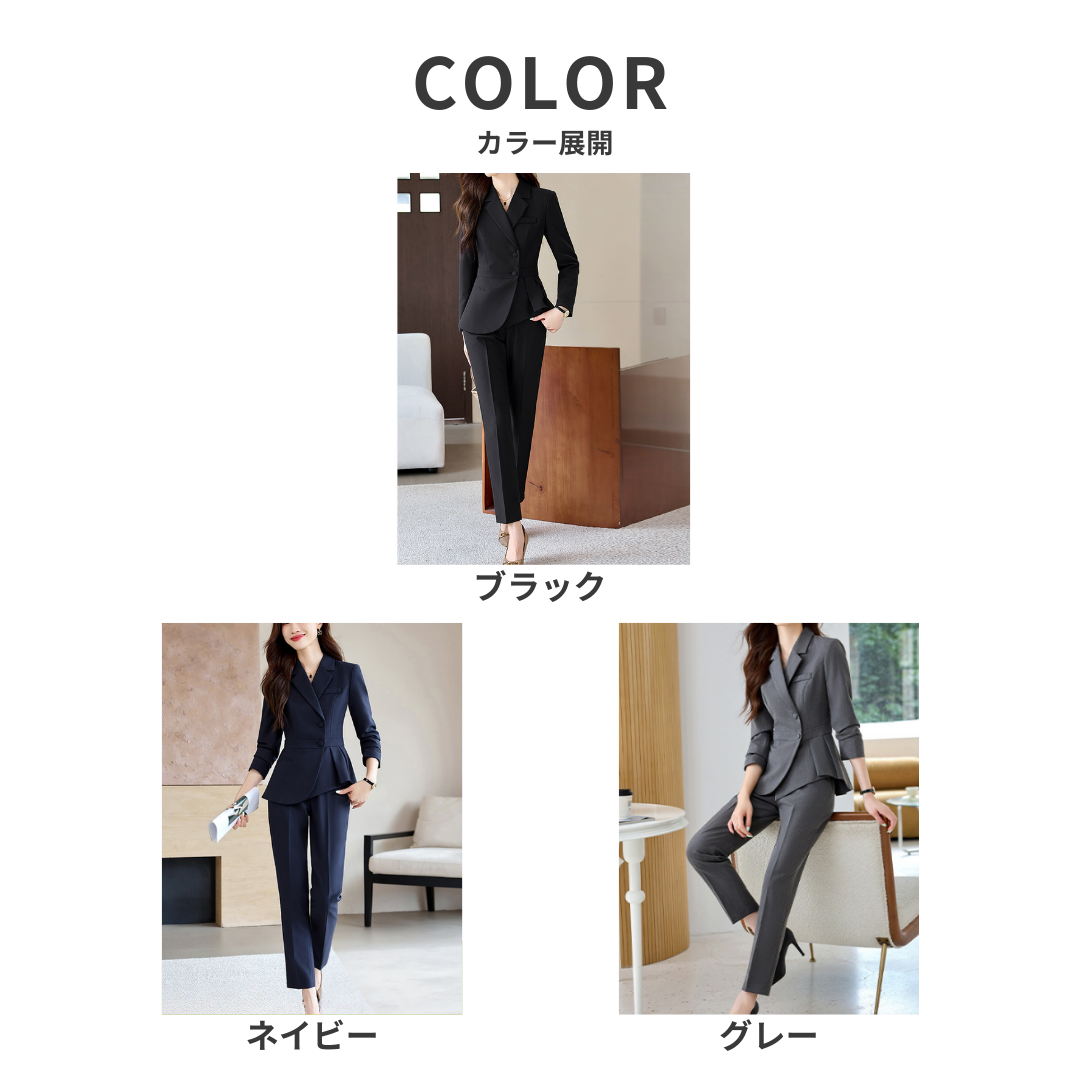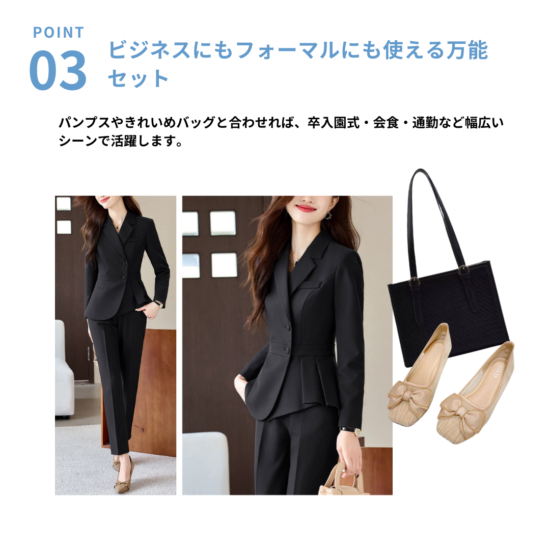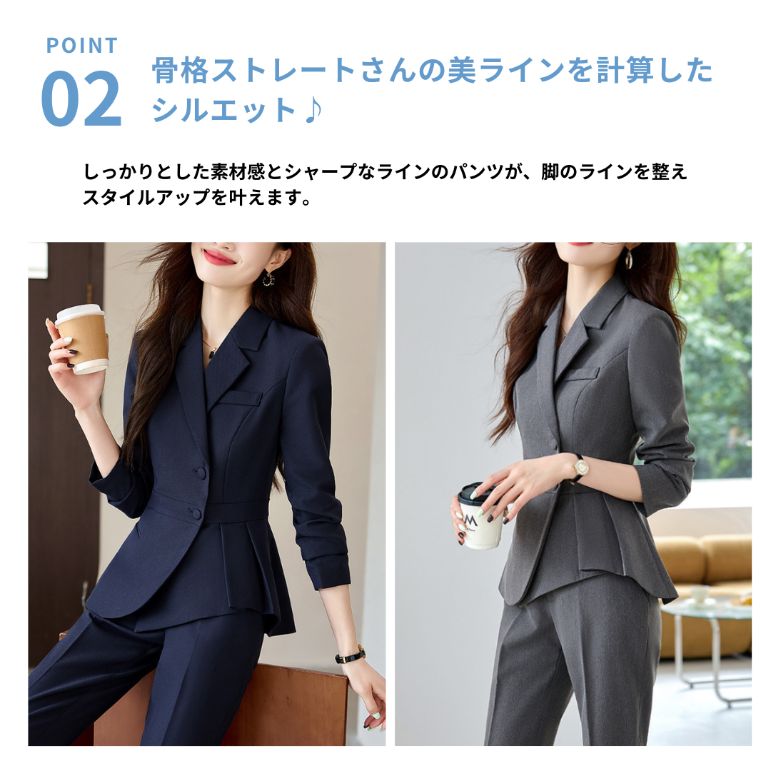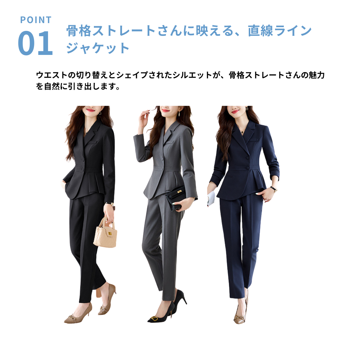 ウエストの切り替えと程よいフィット感が、骨格ストレートさんの魅力を最大限に引き立てるセットアップ。かっちりとしたテーラードジャケットに、すっきりとしたテーパードパンツを合わせることで、スタイルアップ効果も抜群。ハリのある素材感が上質さを演出し、ビジネスからフォーマルまで幅広く活躍します。