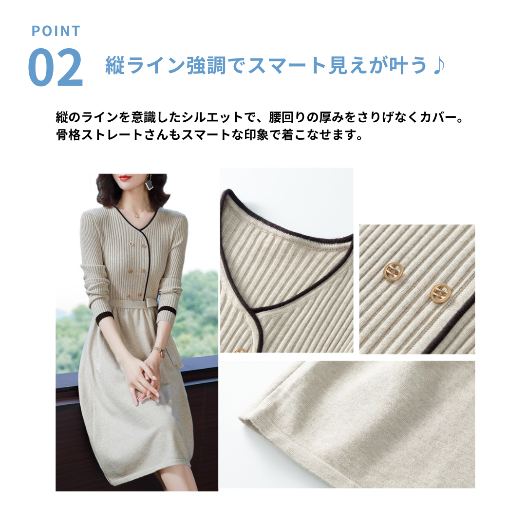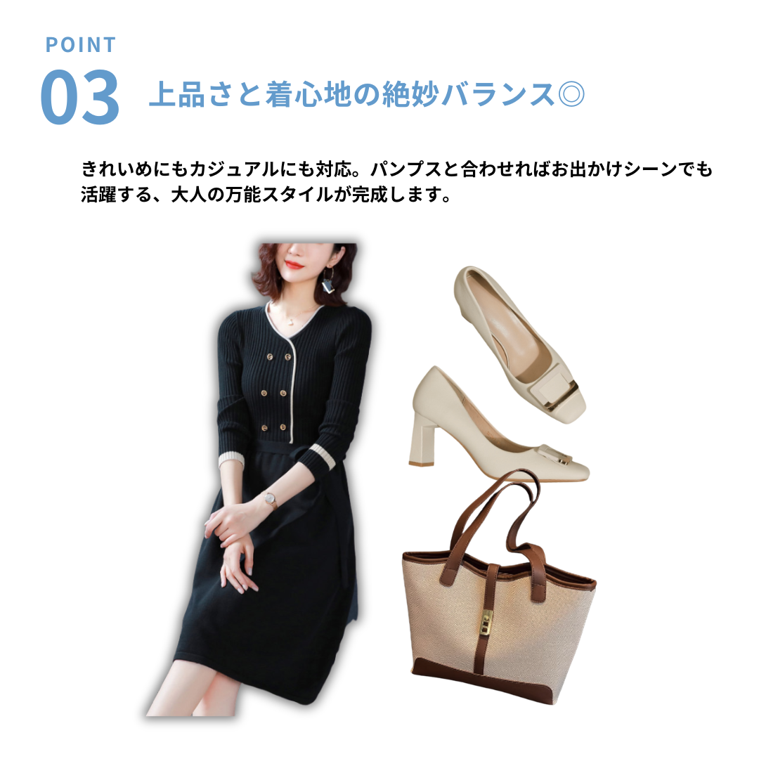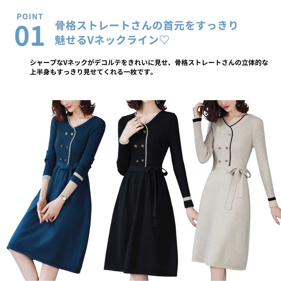 骨格ストレートさんに似合う、シャープさと女性らしさを兼ね備えたワンピース。すっきりとしたVネックがデコルテをきれいに見せ、ボディラインに沿いすぎないシルエットで気になる腰まわりもカバー。縦ラインを意識したデザインで全体がスマートな印象に。