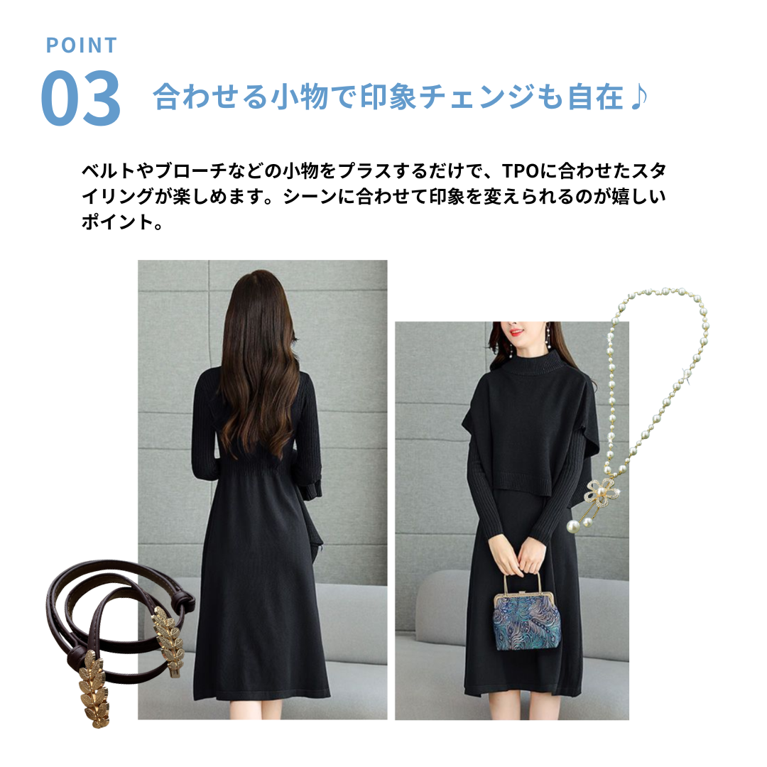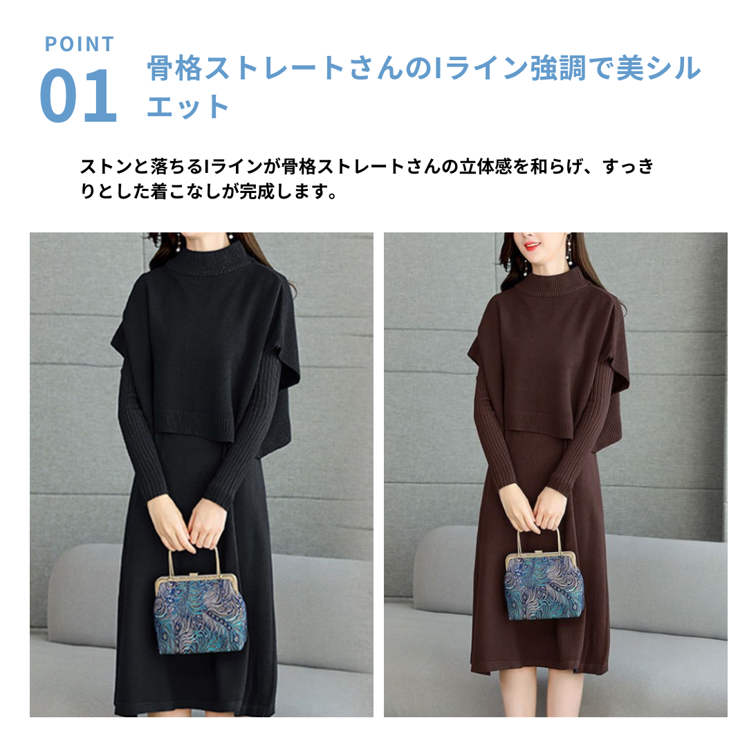 シンプルながらも立体感のあるデザインが魅力のニットワンピース。ストンと落ちるIラインが骨格ストレートさんにマッチし、体の厚みに自然にフィット。上下のバランスが取れたツーピースで、着るだけで洗練された印象に。