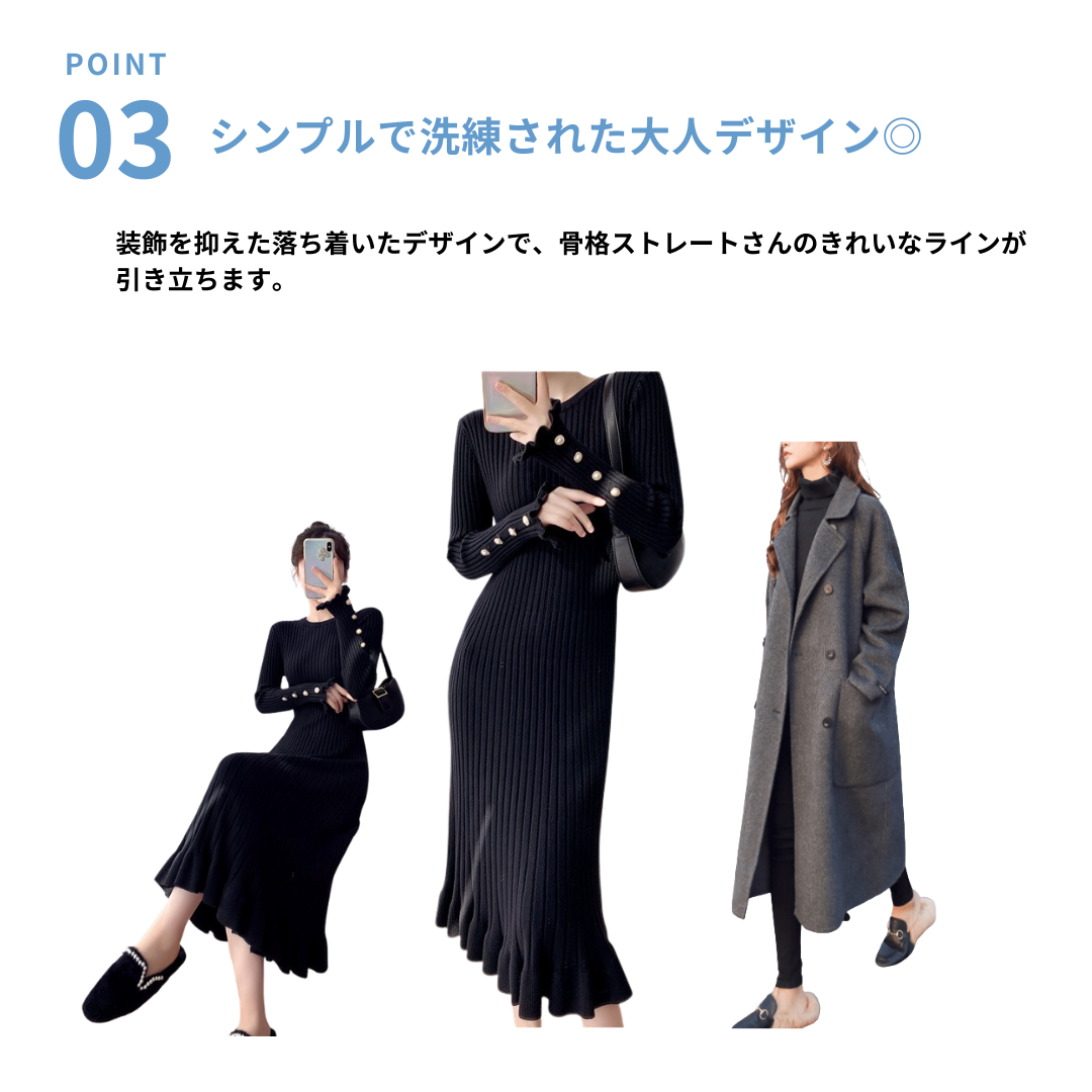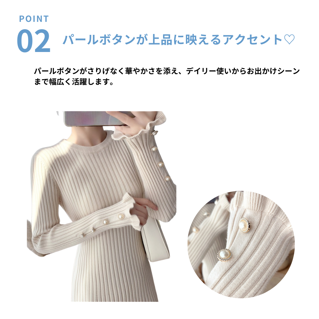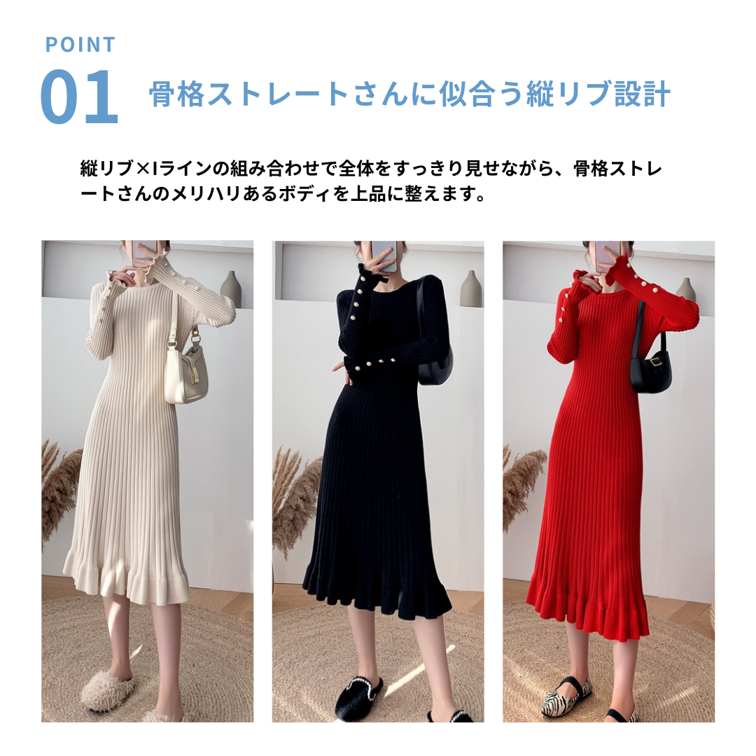 縦リブとすっきりとしたIラインシルエットが、骨格ストレートさんのメリハリあるボディをよりスマートに魅せてくれる一枚。シンプルなシルエットに、パールボタンと袖口とスカートの裾にあしらった控えめなフリルが上品なアクセントを添える万能ワンピースです。