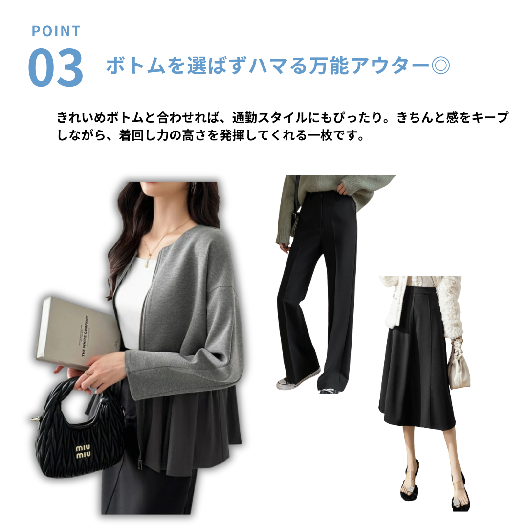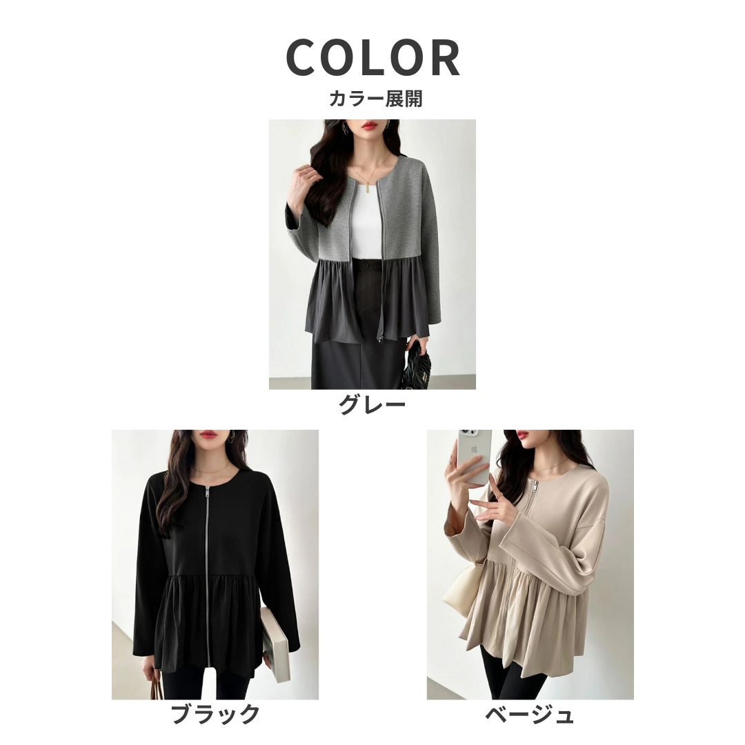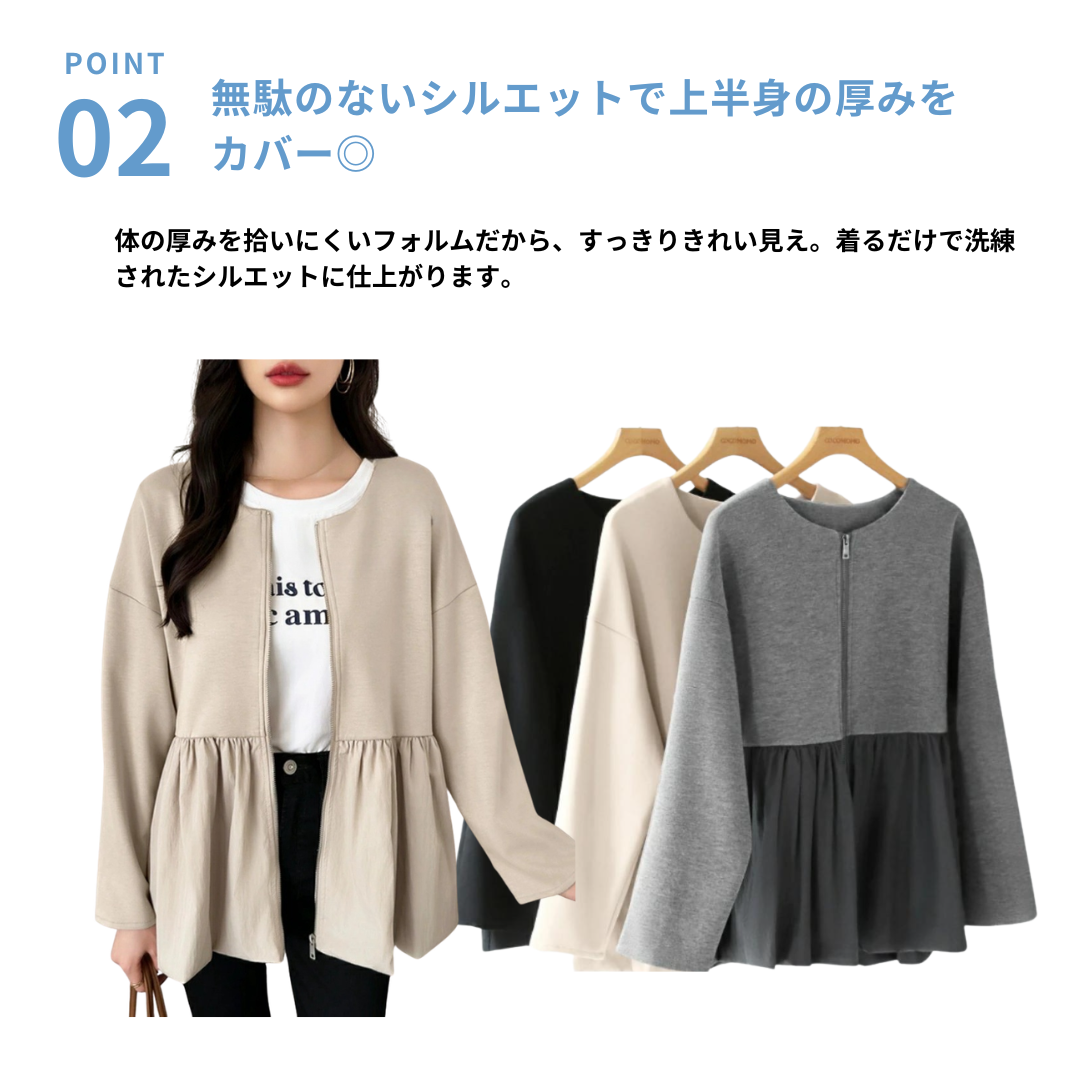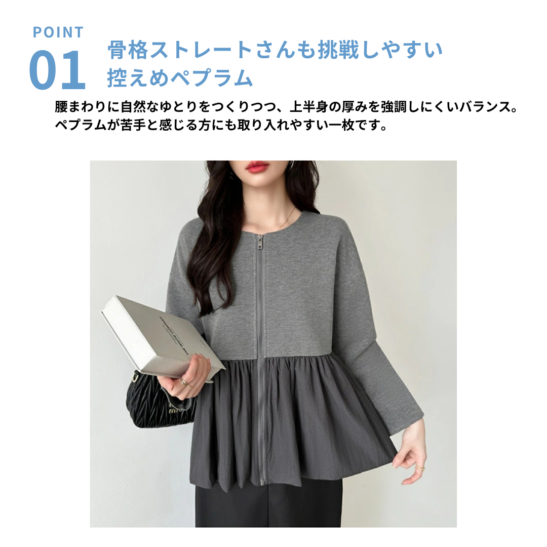 ペプラムは苦手…と感じている骨格ストレートさんにも取り入れやすい、甘さ控えめの切り替えトップス。上身頃はすっきりとした直線的なシルエットで上半身の厚みを強調せず、腰下から程よく広がるデザインがヒップまわりを自然にカバーします。フロントジップが縦ラインを強調し、全体をシャープな印象に。パンツ合わせでもバランスが取りやすく、きれいめにもカジュアルにも着回せる一枚です。
