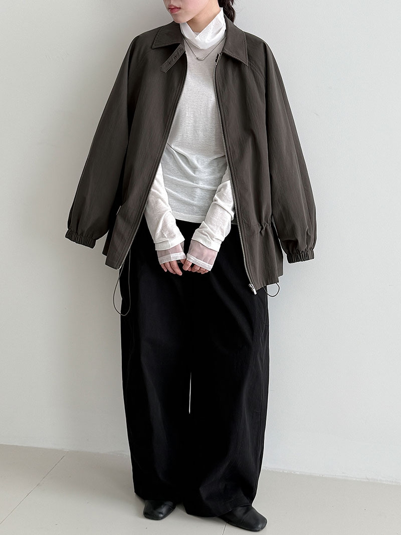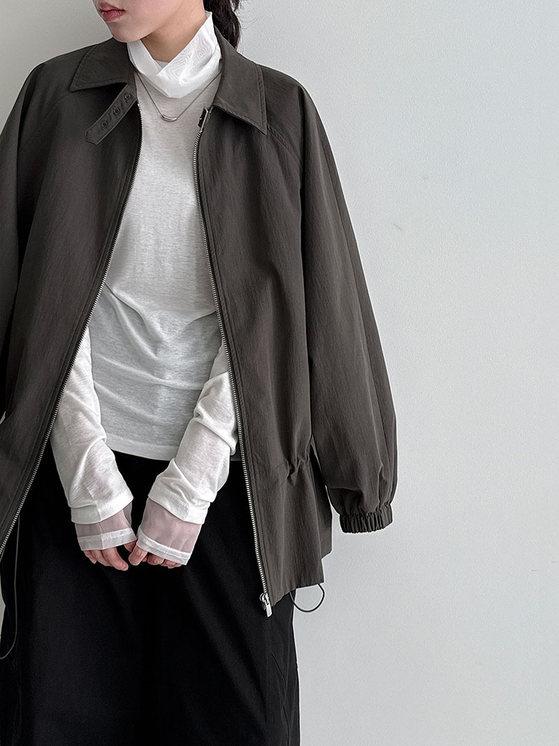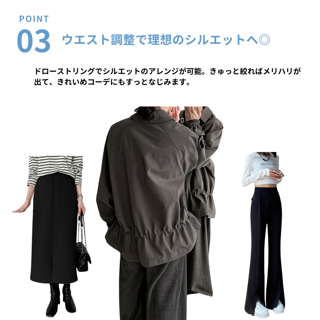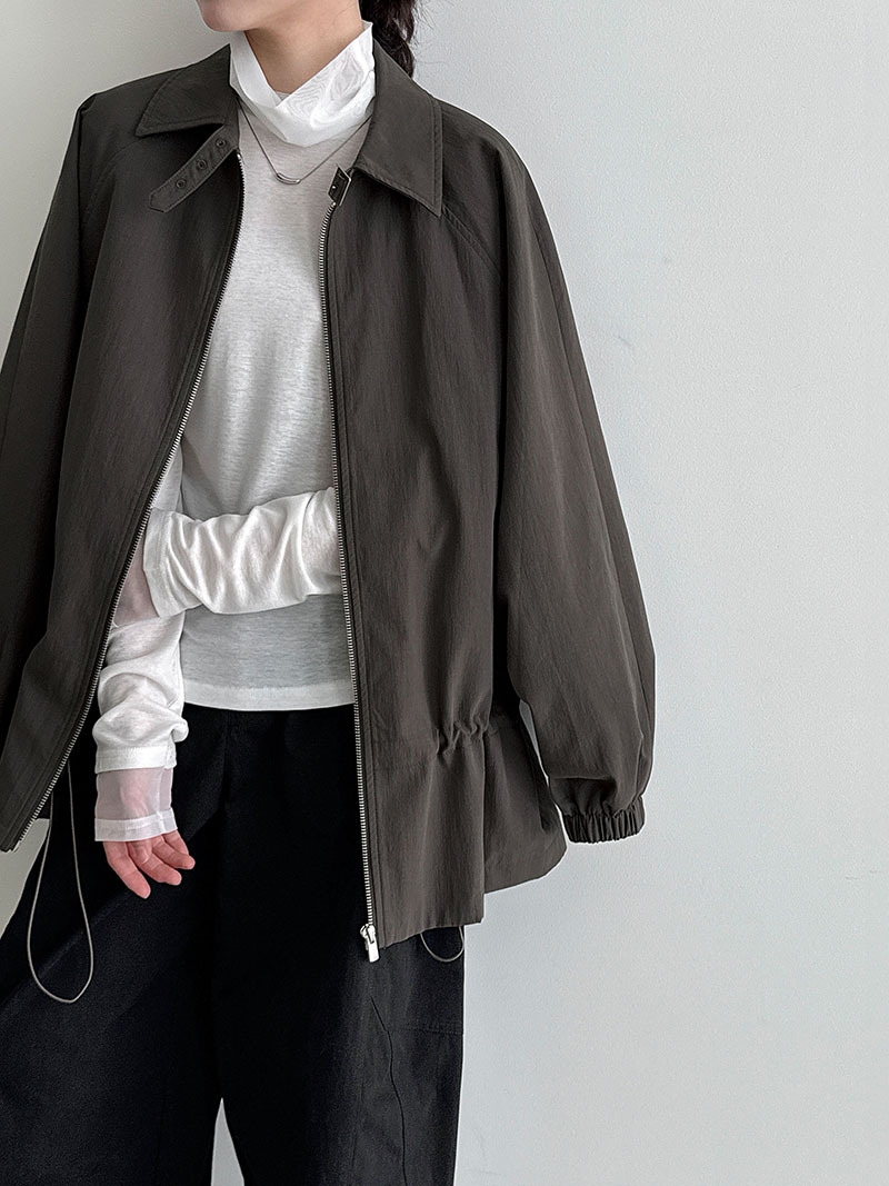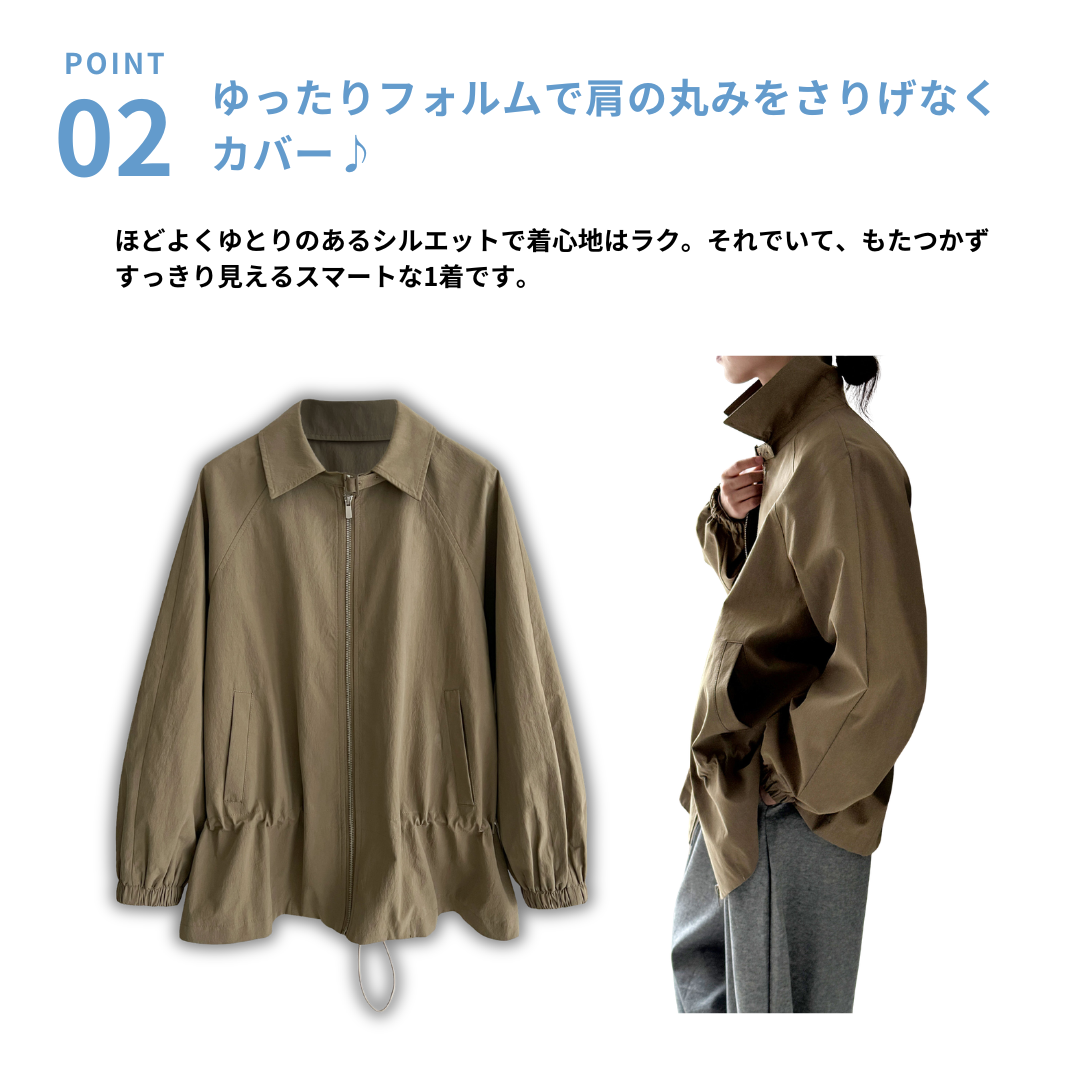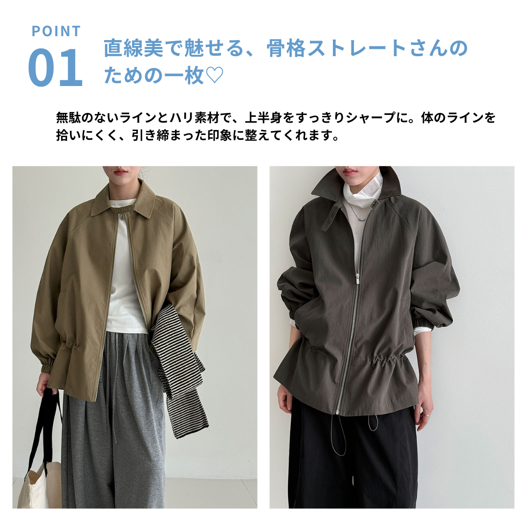 直線的なシルエットとシンプルなデザインで、骨格ストレートさんの魅力を引き立てる軽やかジャケット。ハリのある素材と肩まわりにゆとりを持たせた作りが、上半身をスッキリ見せてくれます。ウエストのドローストリングで好みに合わせたシルエット調整が可能。カジュアルすぎず上品見えも叶う1枚です。
