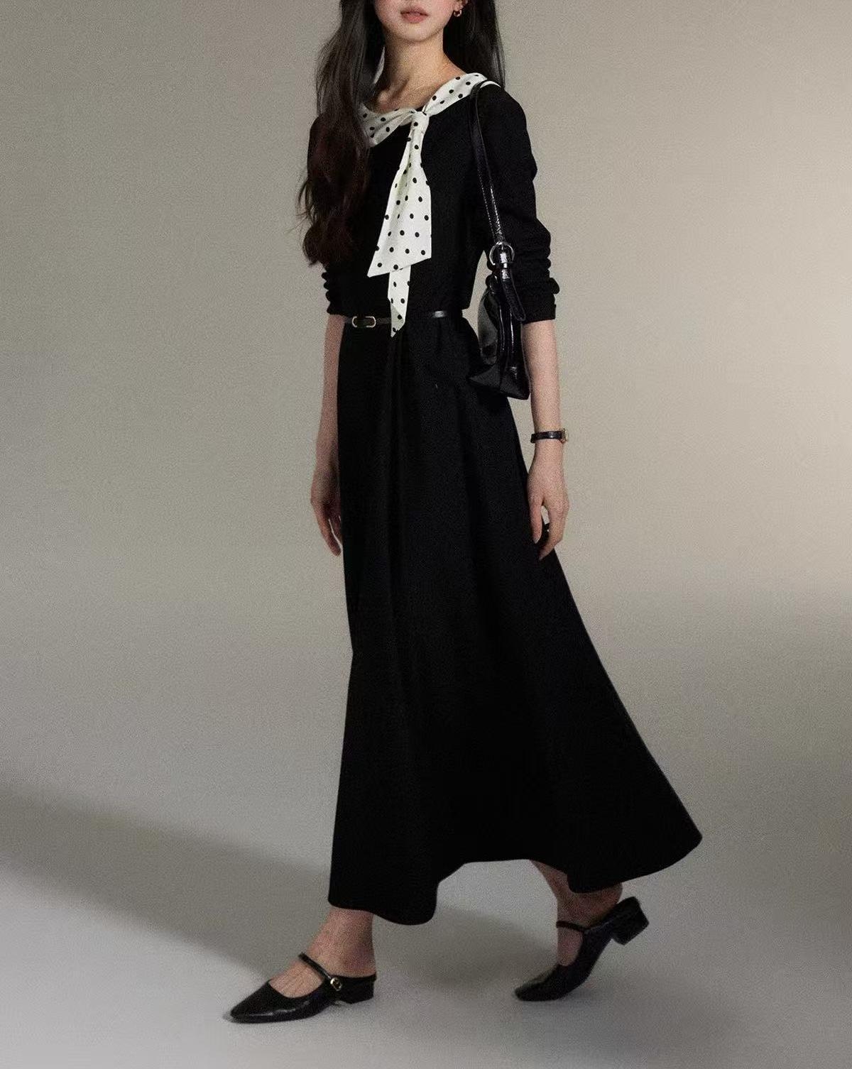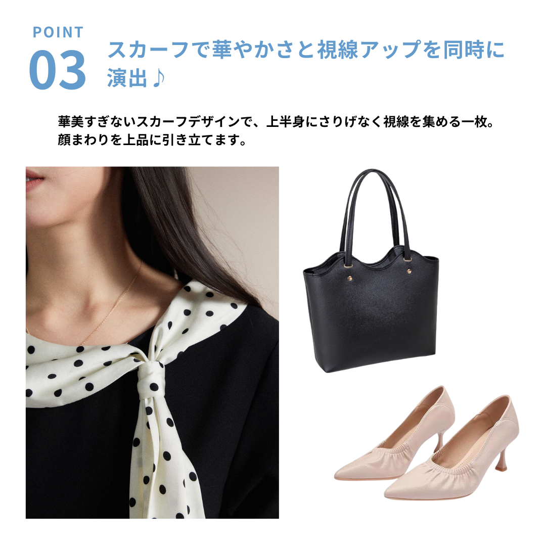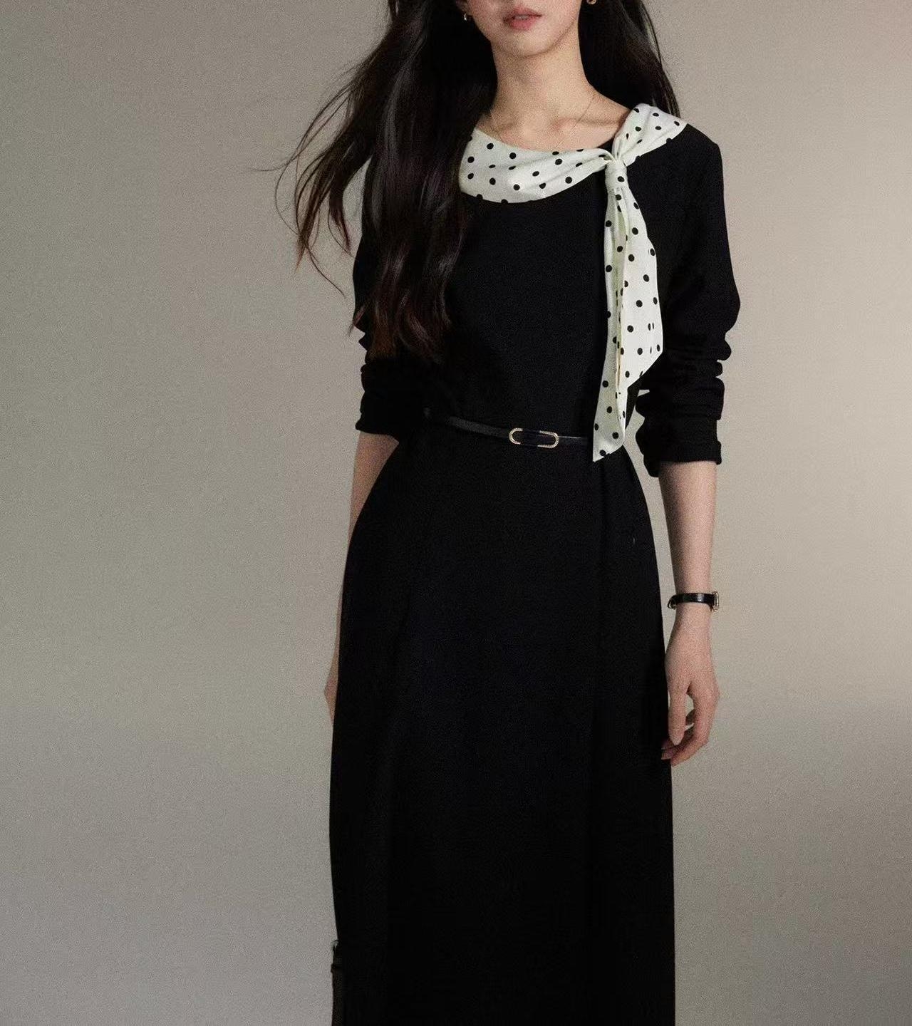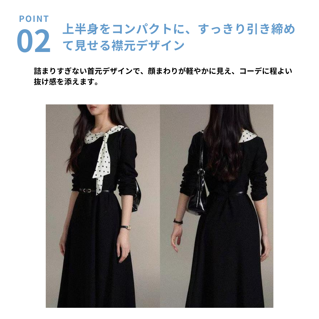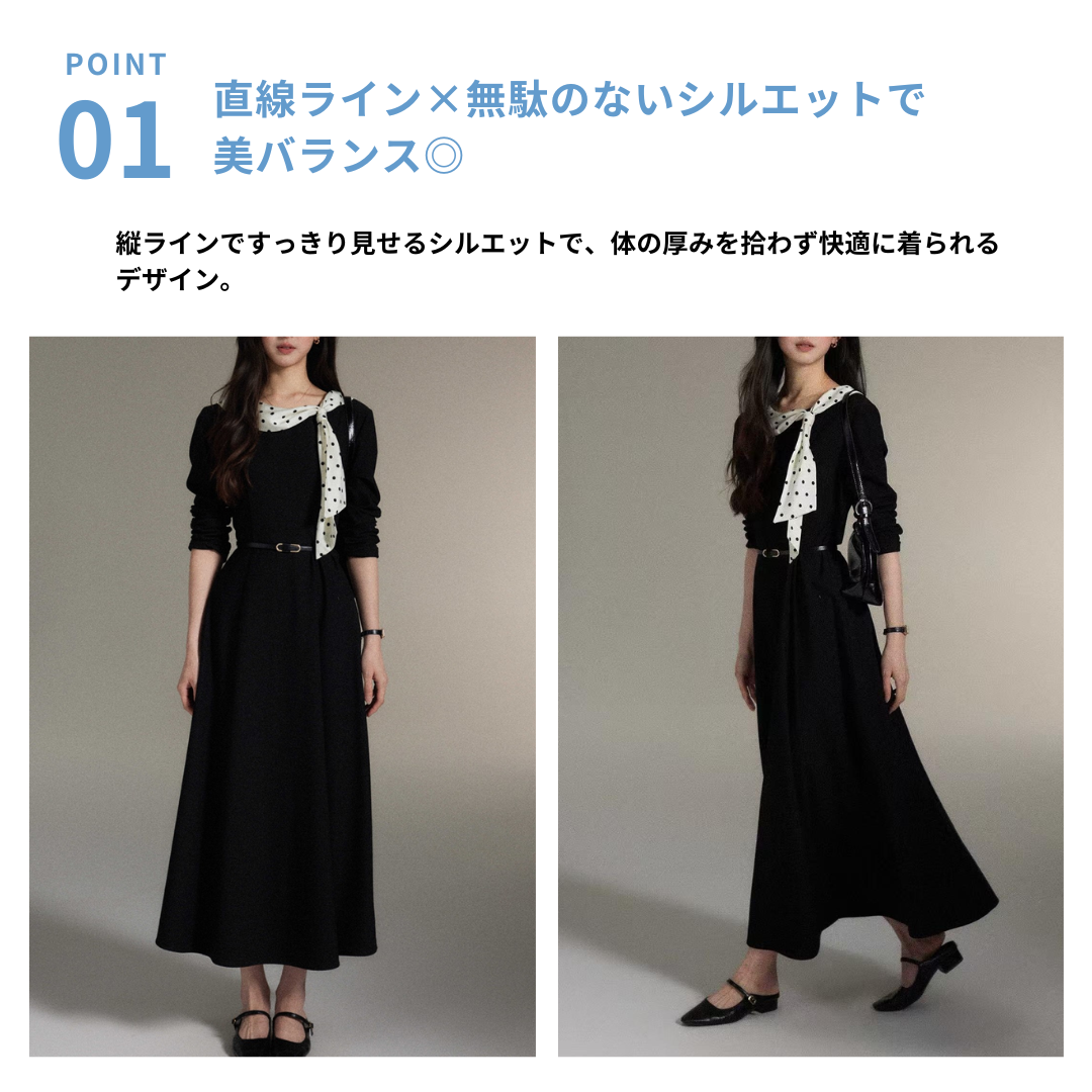 シンプルなブラックワンピースに、ドット柄スカーフを効かせた上品な一着。直線を意識したすっきりとしたシルエットで、体の厚みが目立ちにくく、縦の流れをきれいに見せてくれます。ラウンドネックは開きすぎず、首元をコンパクトにまとめることで落ち着いた印象に。ウエスト位置も自然で、きちんと感と女性らしさを両立。通勤からお食事会まで幅広く活躍します。 ※ベルトは付属しておりません。