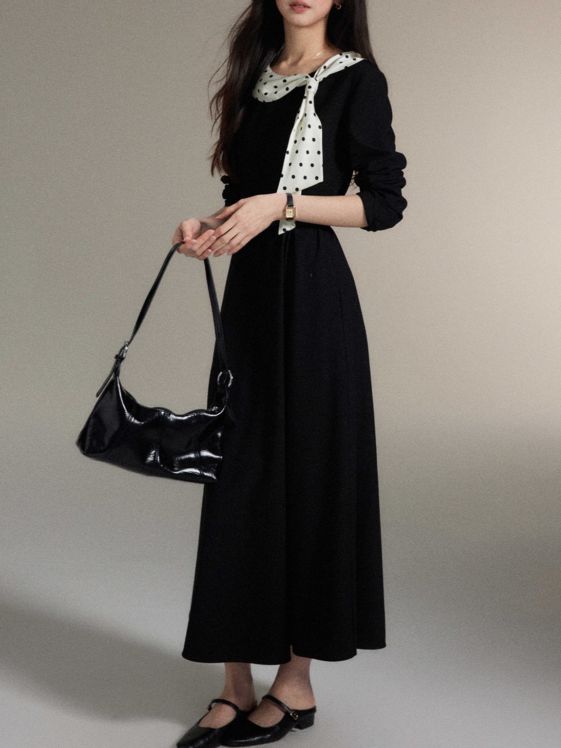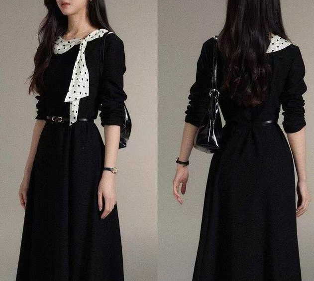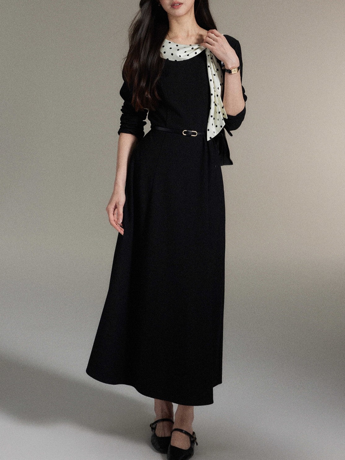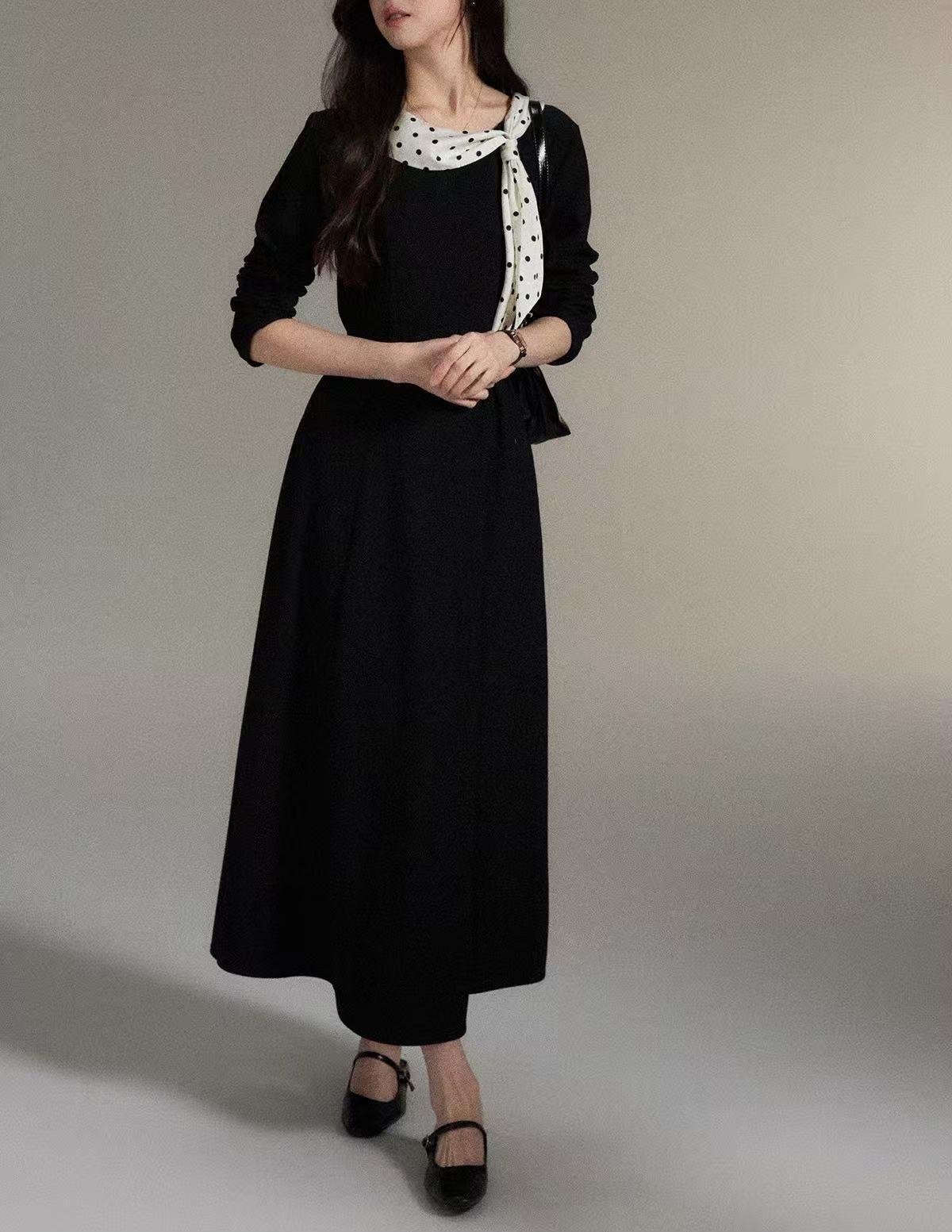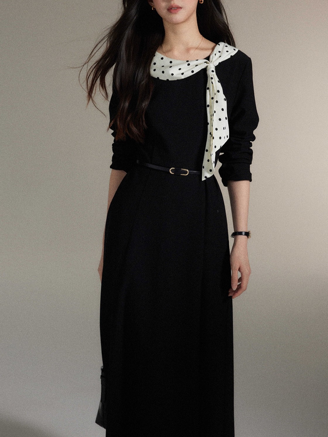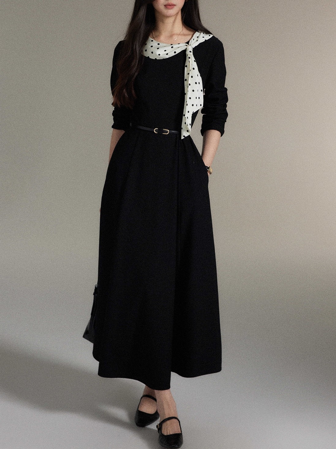 シンプルなブラックワンピースに、ドット柄スカーフを効かせた上品な一着。直線を意識したすっきりとしたシルエットで、体の厚みが目立ちにくく、縦の流れをきれいに見せてくれます。ラウンドネックは開きすぎず、首元をコンパクトにまとめることで落ち着いた印象に。ウエスト位置も自然で、きちんと感と女性らしさを両立。通勤からお食事会まで幅広く活躍します。 ※ベルトは付属しておりません。