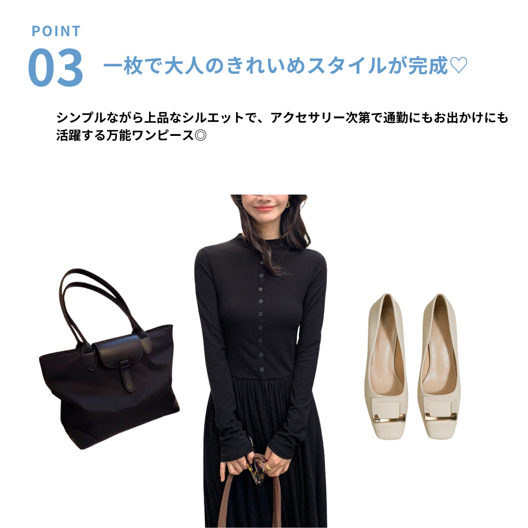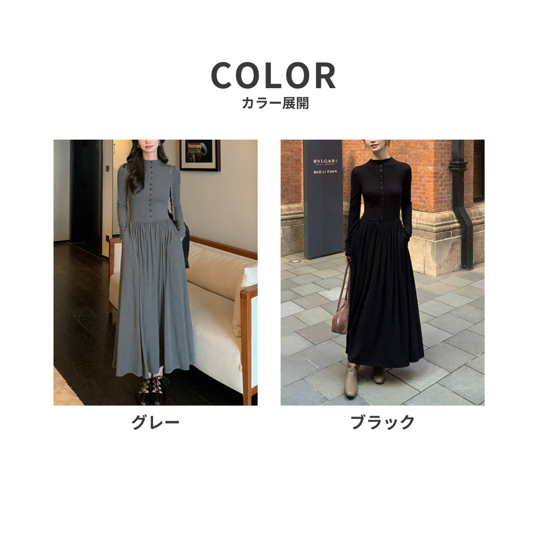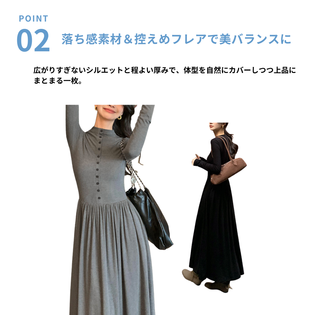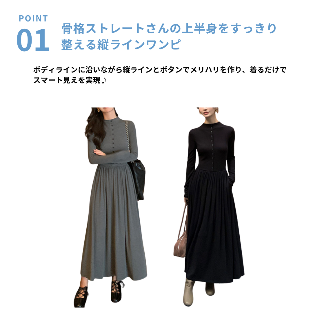 上半身の厚みや全体のボリューム感が気になりやすい骨格ストレートさんに向けた、縦ラインを意識したロングワンピース。すっきりとした身頃とフロントボタンが視線を縦に導き、全身をスマートな印象に整えます。程よい厚みと落ち感のある素材が体のラインを拾いにくく、広がりすぎない上品なシルエットに。通勤からお出かけまで、一枚で大人のきれいめスタイルが完成します。