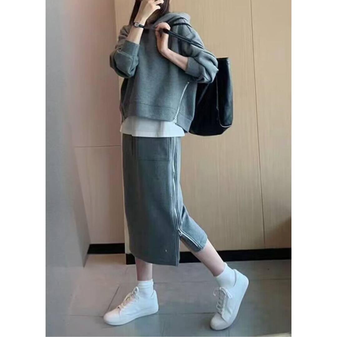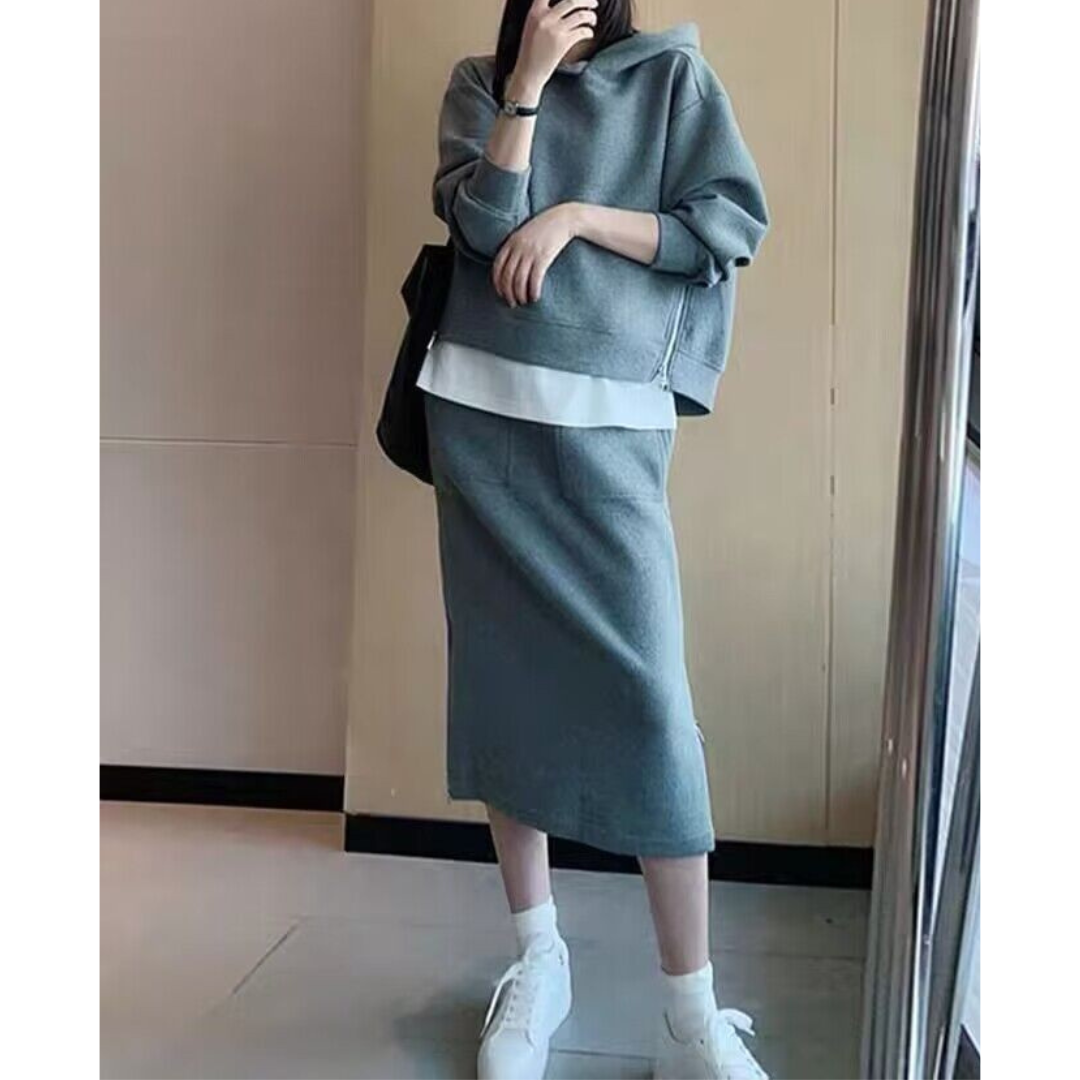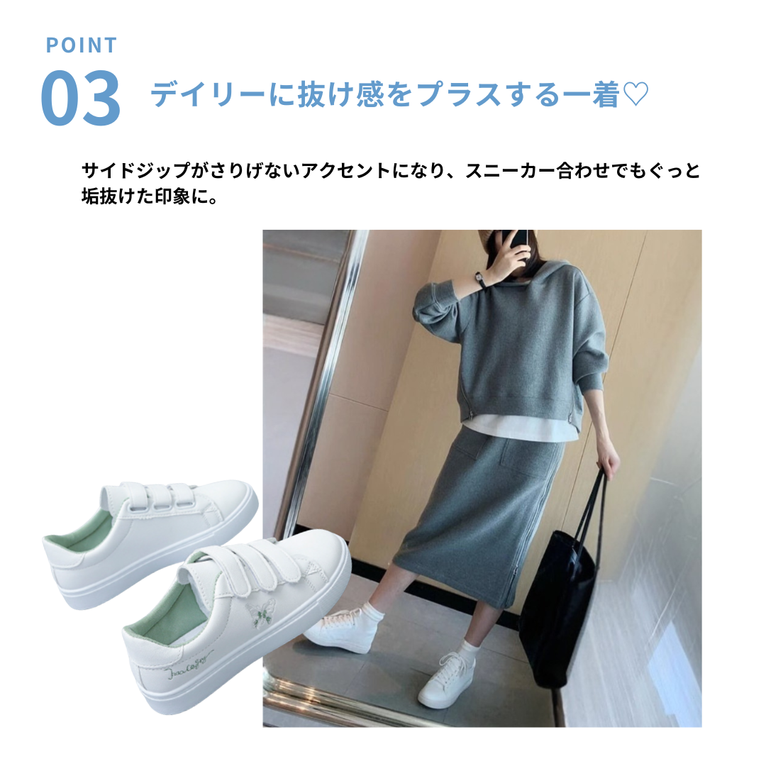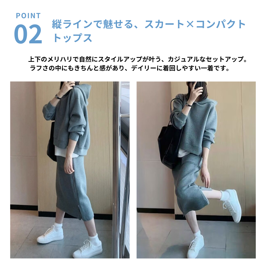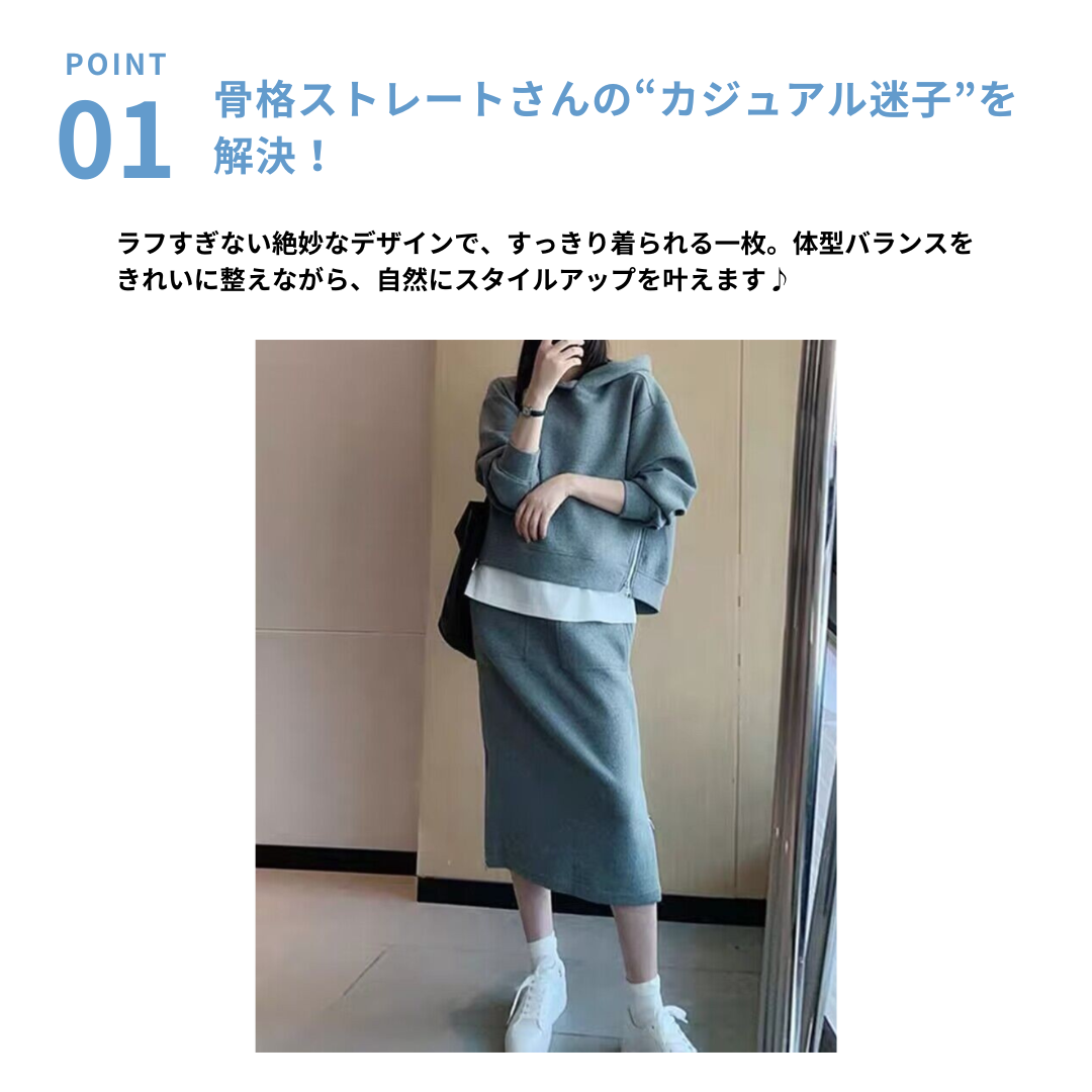 カジュアルなスウェットは着膨れしやすい…そんな骨格ストレートさんの悩みに寄り添う、すっきり見えにこだわったセットアップ。程よい厚みと落ち感のある素材が体のラインを拾いすぎず、ラフになりすぎない大人のカジュアルスタイルに整えます。コンパクトなトップスとストレートラインのスカートが縦のシルエットをつくり、全身をバランスよくすっきりとした印象に。サイドジップが抜け感をプラスし、シンプルながらこなれた雰囲気に仕上がる、デイリーに活躍するセットです。
