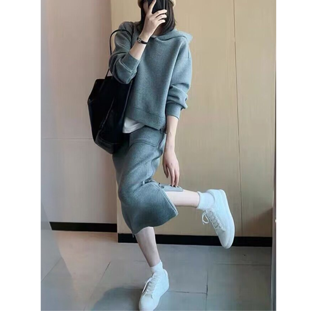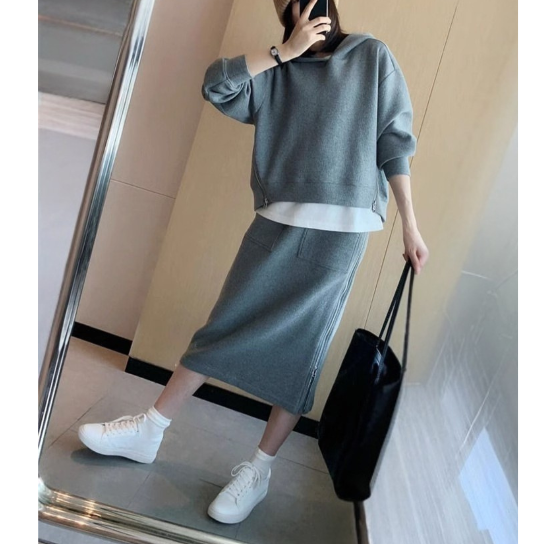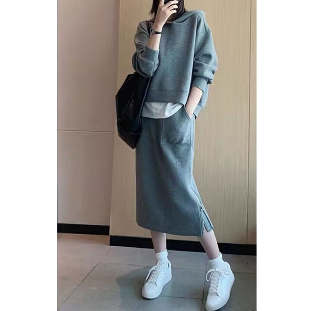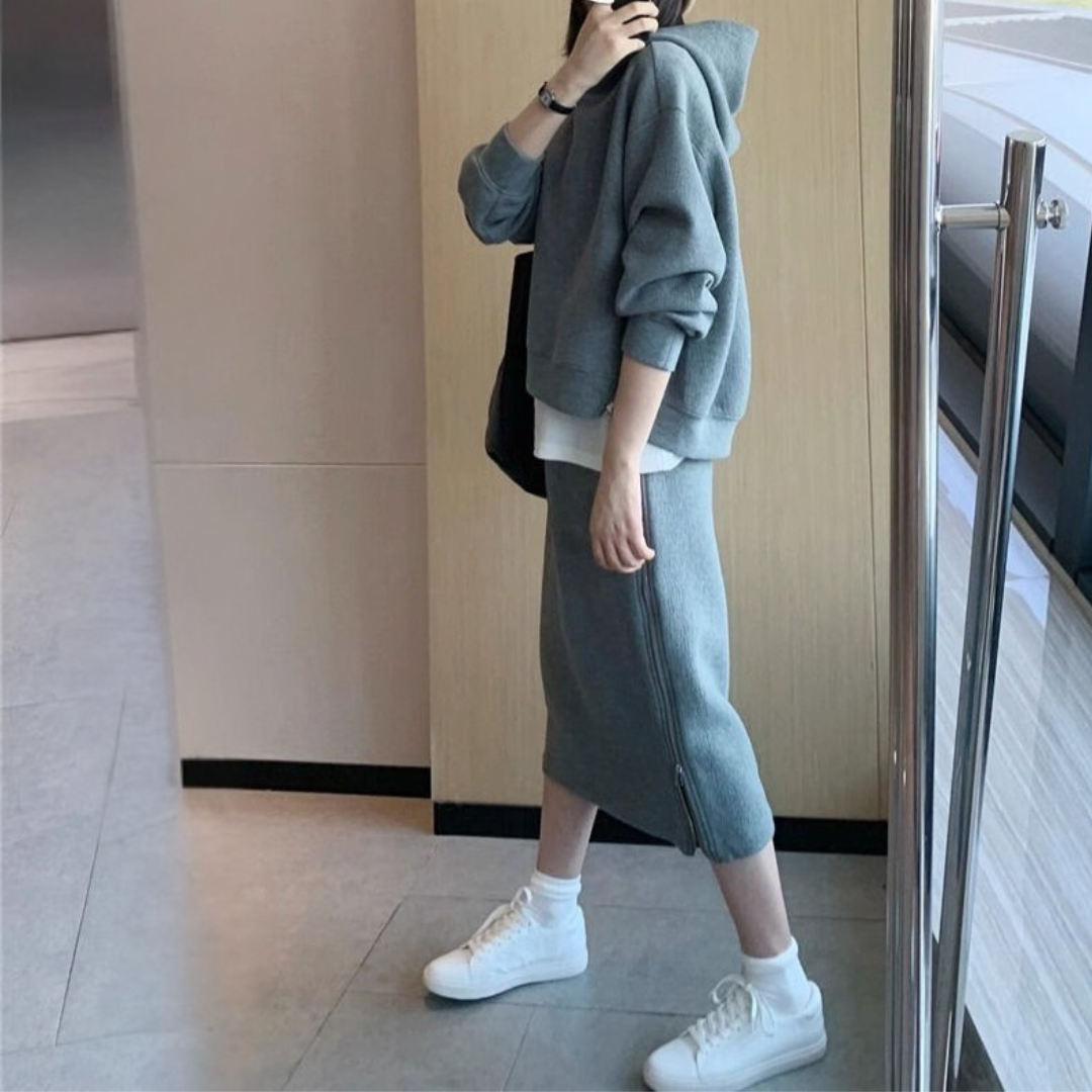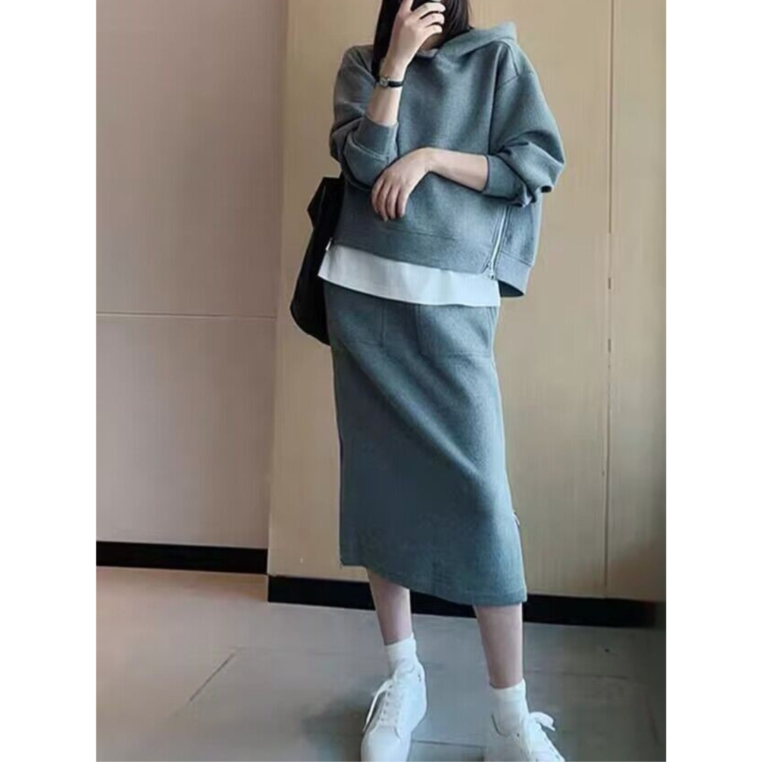 カジュアルなスウェットは着膨れしやすい…そんな骨格ストレートさんの悩みに寄り添う、すっきり見えにこだわったセットアップ。程よい厚みと落ち感のある素材が体のラインを拾いすぎず、ラフになりすぎない大人のカジュアルスタイルに整えます。コンパクトなトップスとストレートラインのスカートが縦のシルエットをつくり、全身をバランスよくすっきりとした印象に。サイドジップが抜け感をプラスし、シンプルながらこなれた雰囲気に仕上がる、デイリーに活躍するセットです。