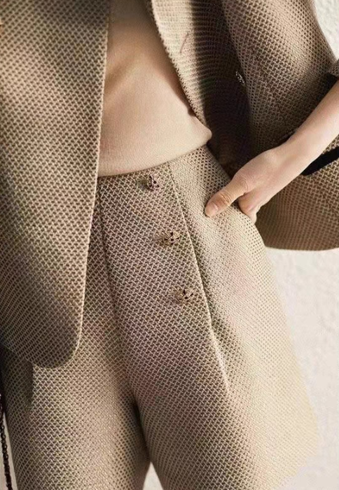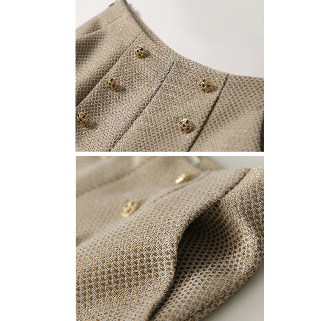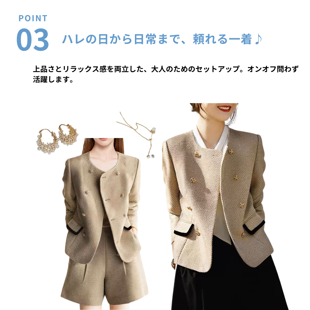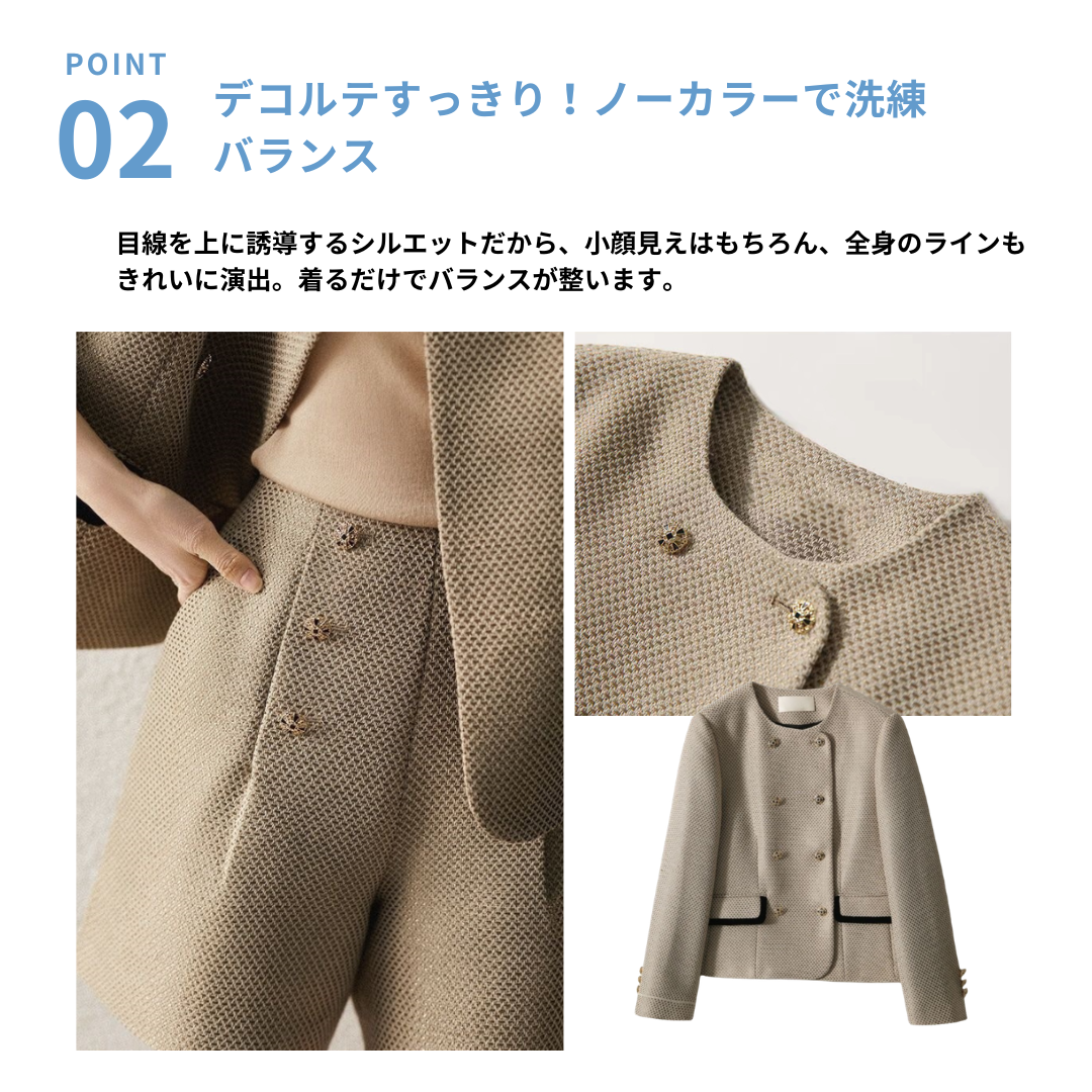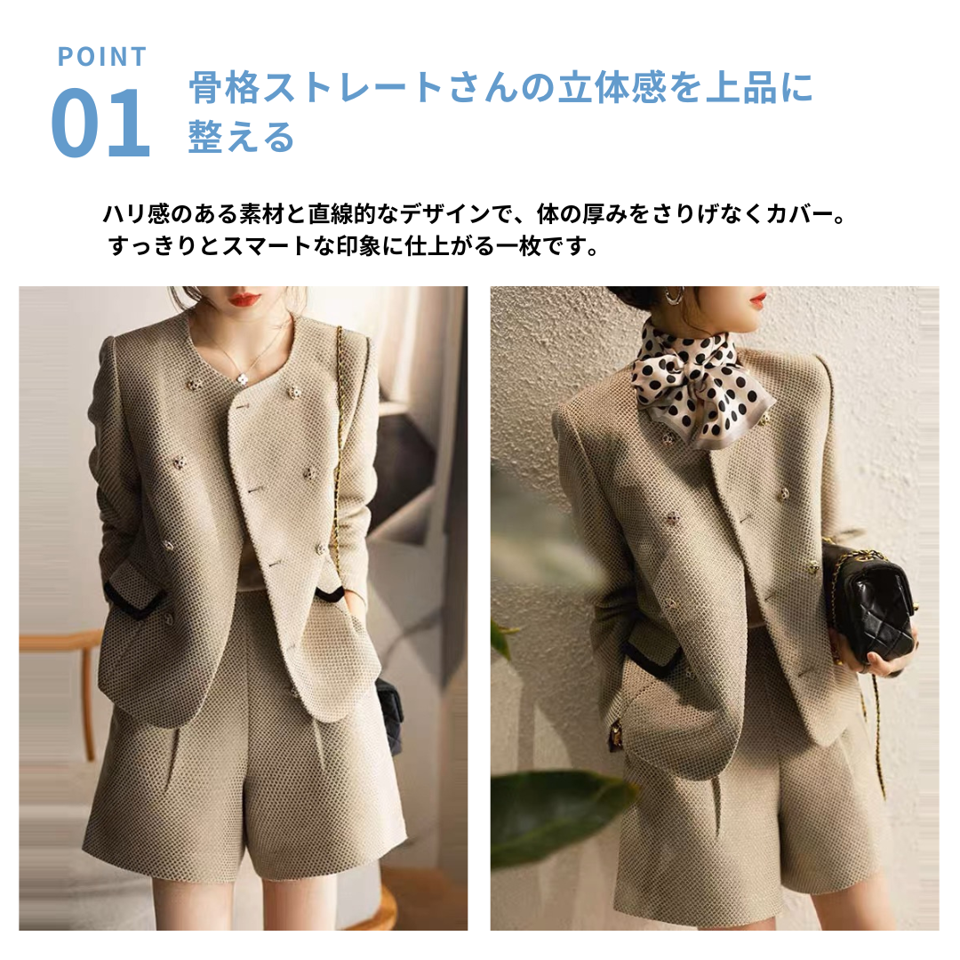 上半身の厚みや全体のボリューム感が出やすい骨格ストレートさんに向けた、立体感をすっきり整えるツィード風セットアップ。程よいハリと厚みのある素材が体のラインをきれいに支え、着膨れを防ぎながら上品な印象に導きます。ノーカラージャケットのすっきりとしたデザインがデコルテまわりを軽やかに見せ、ショートパンツが脚のラインをすっきりと見せるバランスに。きちんと感と抜け感を両立し、セレモニーからお出かけまで幅広く活躍する大人のセットアップです。