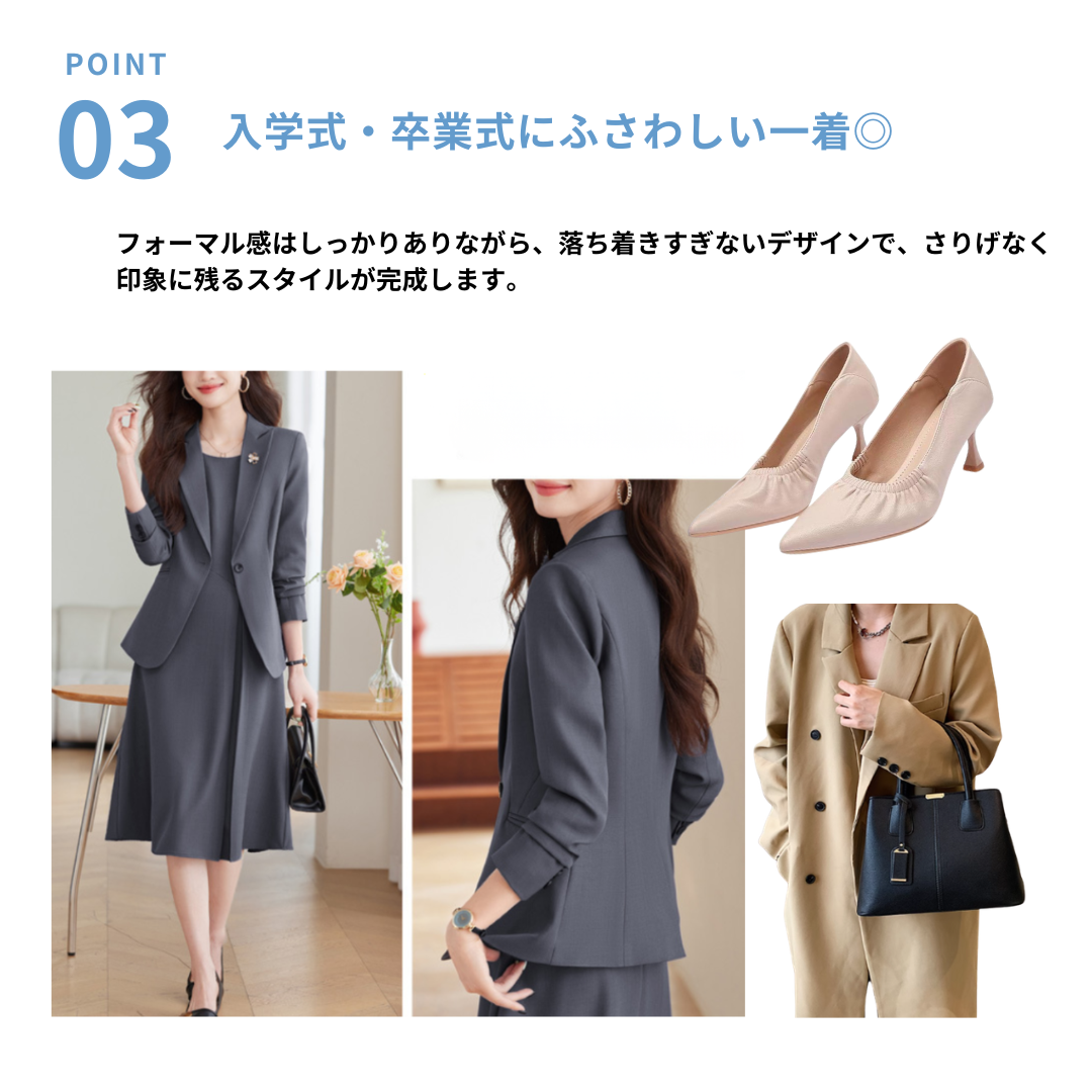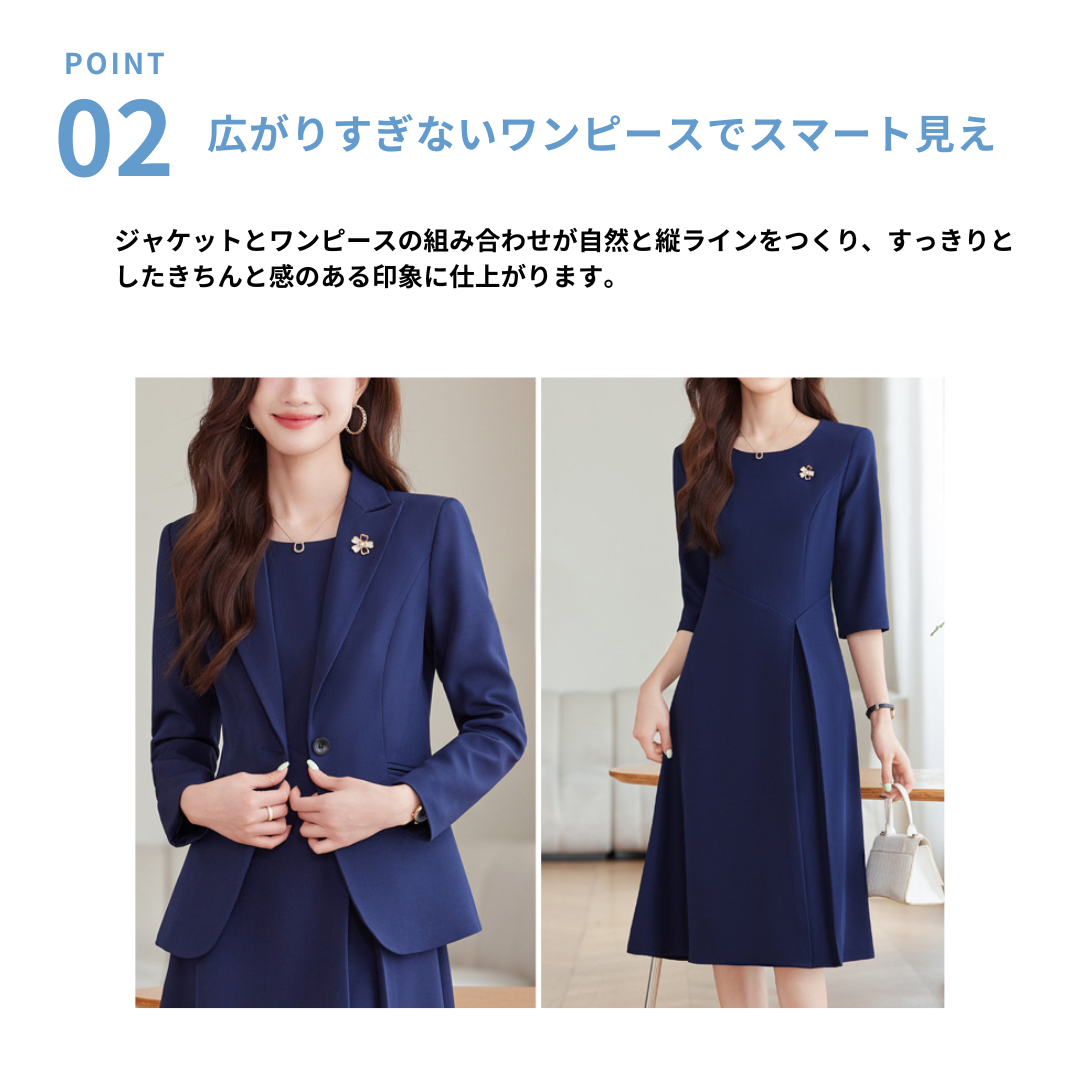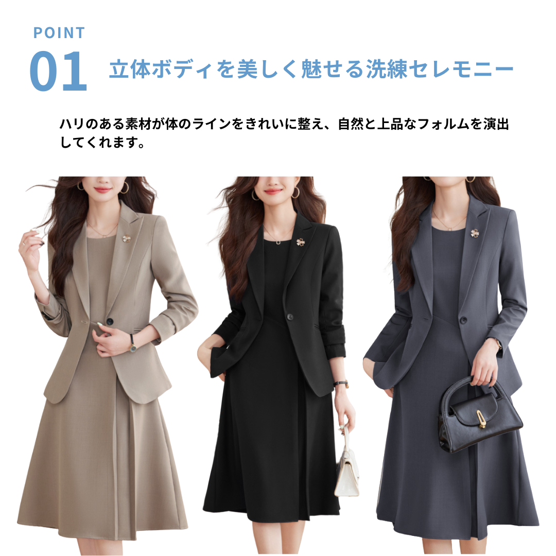上半身の厚みや体の立体感が気になりやすいストレートさんも、すっきりとした印象で着こなせるセレモニーセットアップ。程よいハリのある生地が体のラインを整え、膨張感を抑えながらきちんとした雰囲気に導きます。コンパクトなテーラードジャケットと、広がりすぎないワンピースが縦ラインを強調し、全身をスマートなバランスに。シンプルで上品なデザインが、入学式や卒業式などのフォーマルシーンにもなじみ、大人のきれいめスタイルを落ち着いた印象でまとめてくれる一着です。