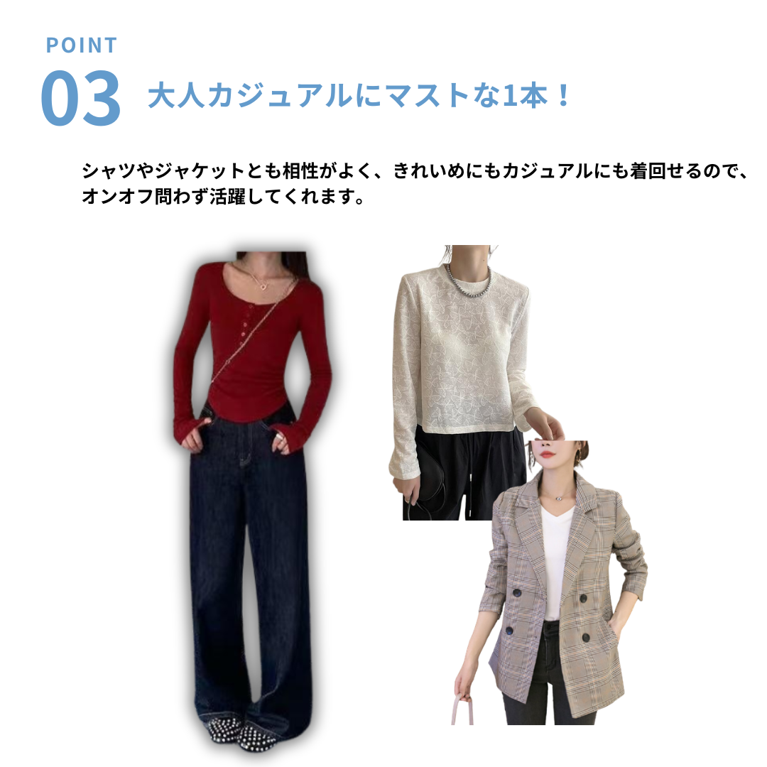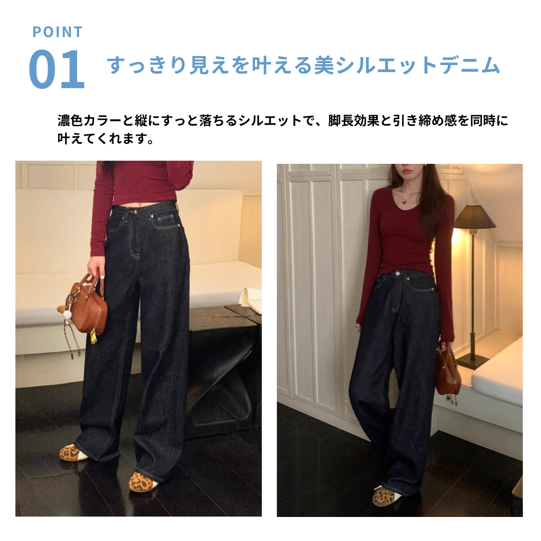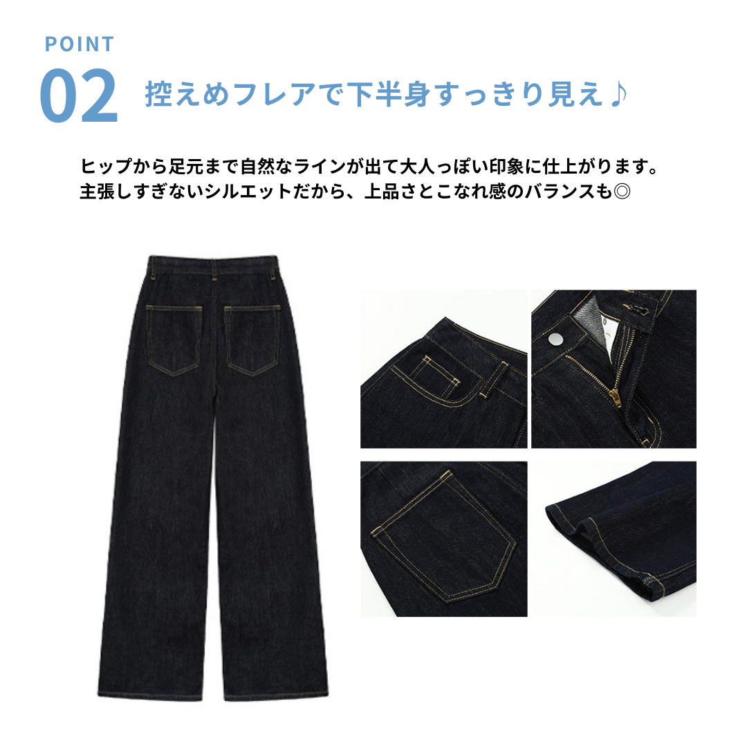 下半身のボリュームやカジュアルなデニムの着膨れが気になる方にも、すっきりとした印象で着こなせるノンウォッシュデニム。濃色のシンプルな表面感が縦ラインを強調し、全身をスマートなバランスに整えます。広がりすぎないセミワイドシルエットが脚のラインを自然にカバーしながら、まっすぐな落ち感で大人っぽい印象に。程よい厚みとハリのあるデニム素材が体の立体感を整え、ラフになりすぎないきれいめカジュアルを叶える一本です。