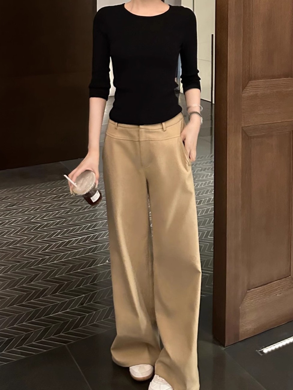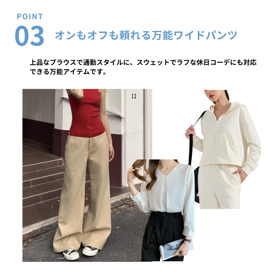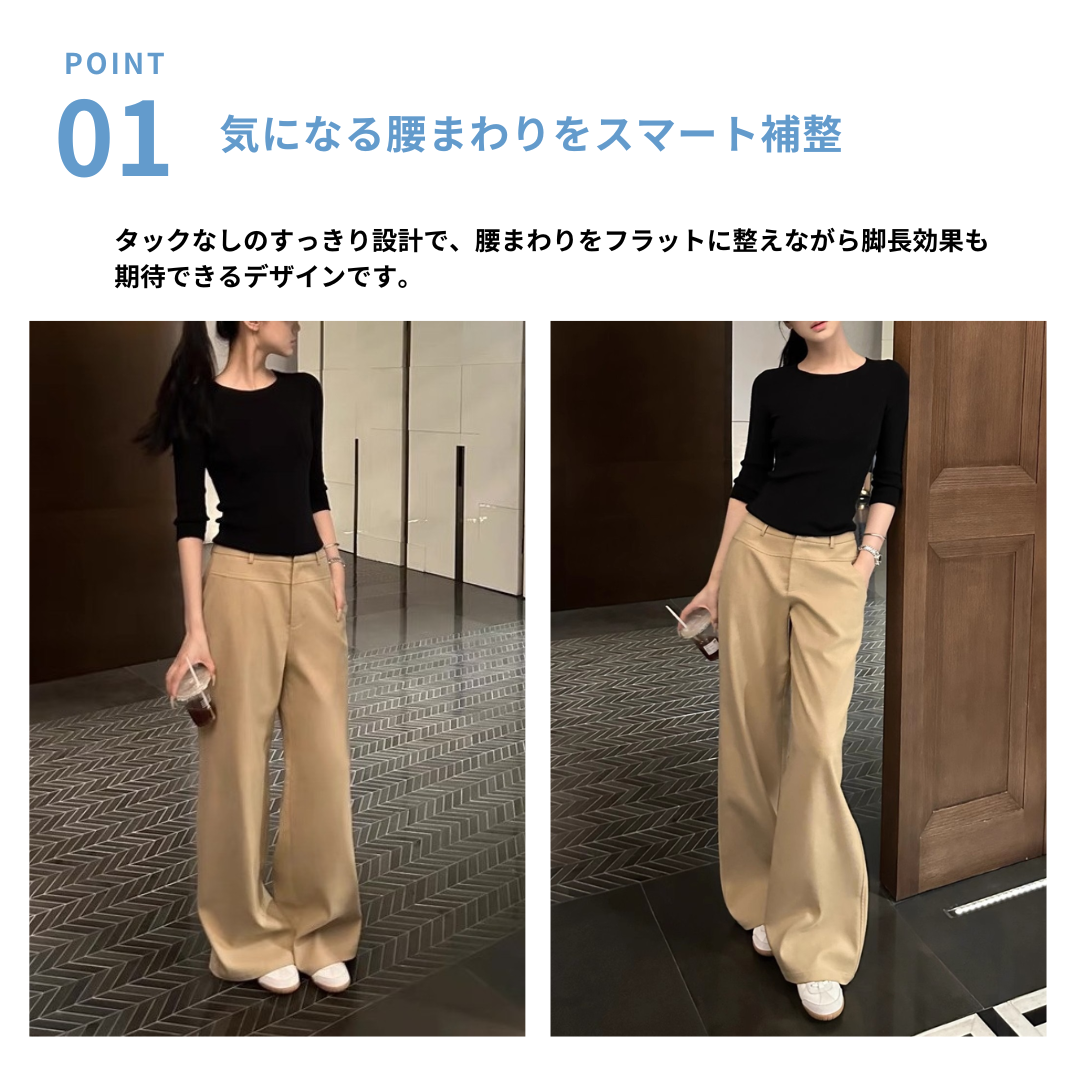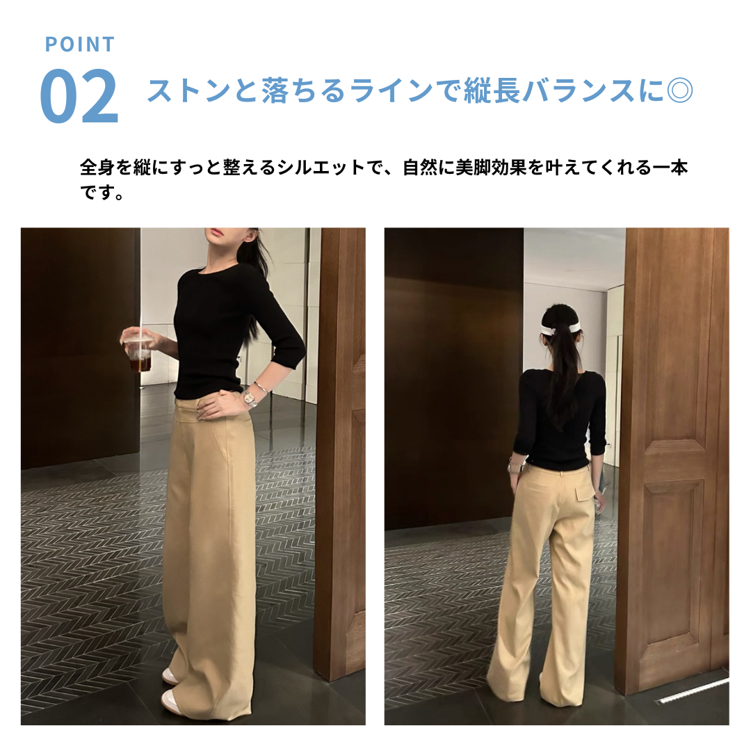 腰まわりのボリュームやワイドパンツの膨張感が気になりやすいストレートさんにも、すっきりとした印象で着こなせるノータックワイドパンツ。フロントにタックを入れないデザインが腰まわりをフラットに整えてボリュームを抑えます。ストンと落ちるワイドシルエットが縦ラインを強調し、全身をスマートなバランスに。程よい厚みと落ち感のある素材が体のラインを拾いにくく、きれいめな印象をキープ。通勤からきれいめカジュアルまで活躍する、大人のための一本です。