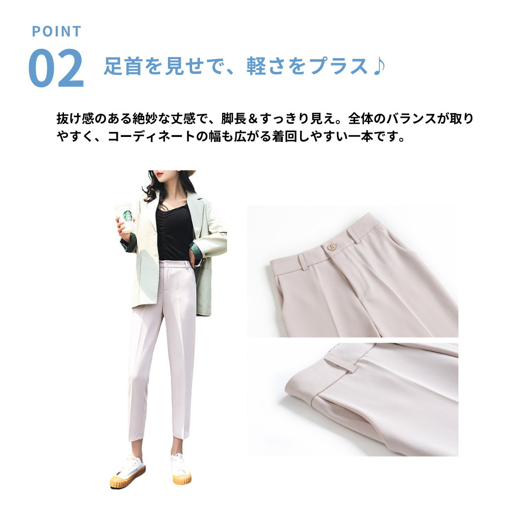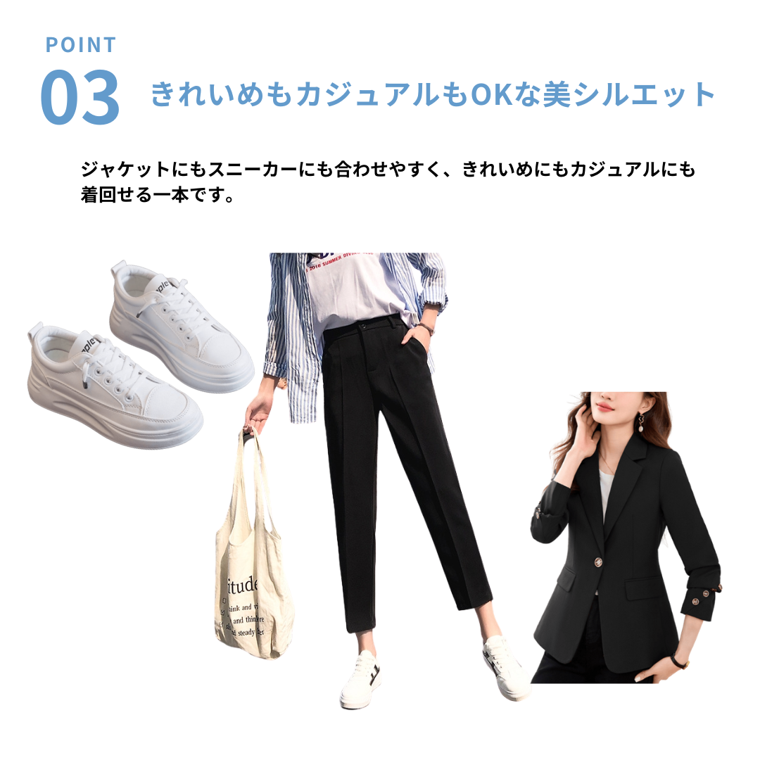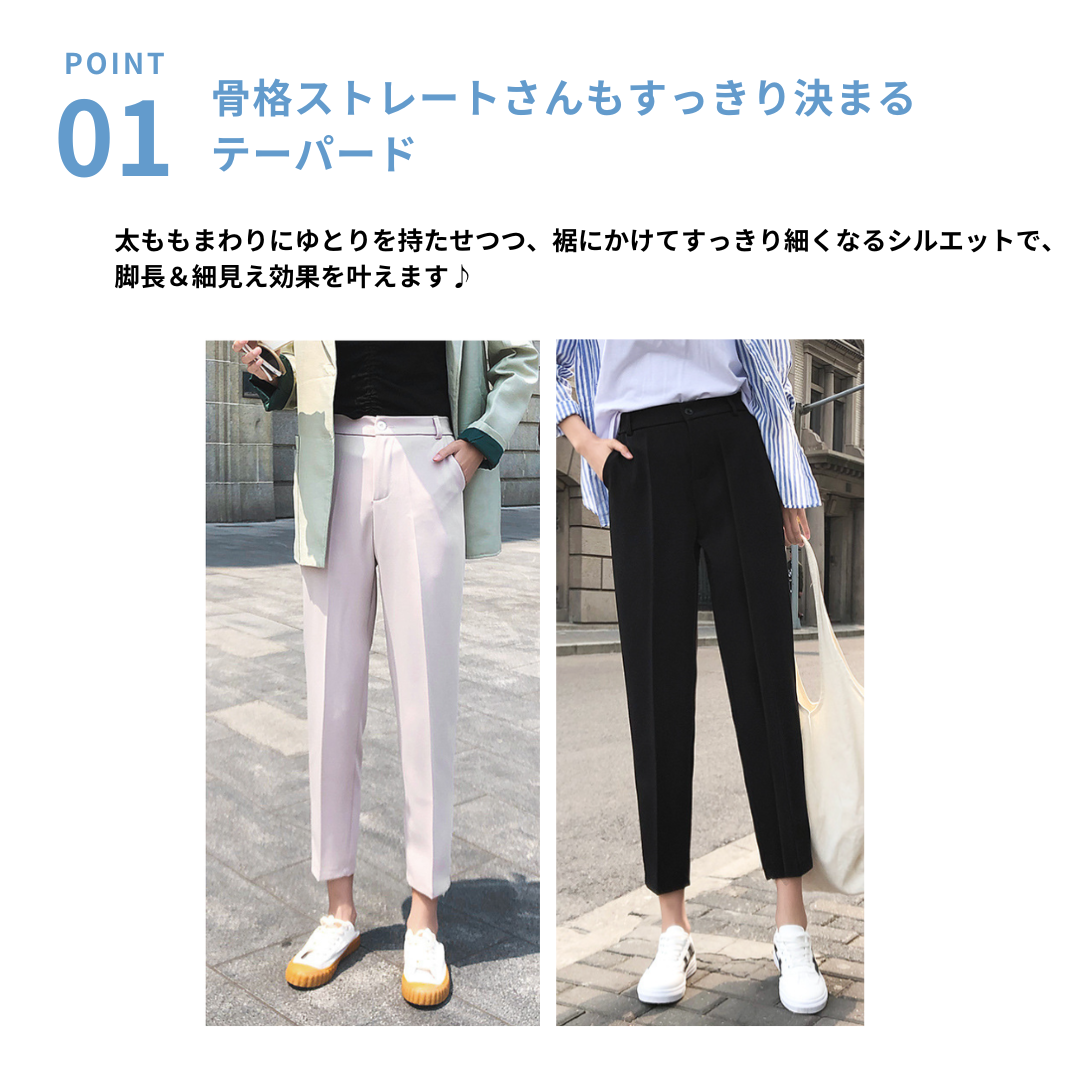 腰まわりのボリュームや下半身の重たさが気になりやすい方にも、すっきりとした印象で着こなせるテーパードパンツ。ヒップから裾にかけて細くなるシルエットが脚のラインを整え、全身をスマートなバランスに導きます。足首が見える丈感が抜け感を生み、重たくなりがちなコーディネートを軽やかな印象に。程よい厚みと落ち感のある素材が体のラインを拾いすぎず、きれいなシルエットをキープ。通勤からきれいめカジュアルまで幅広く活躍する一本です。
