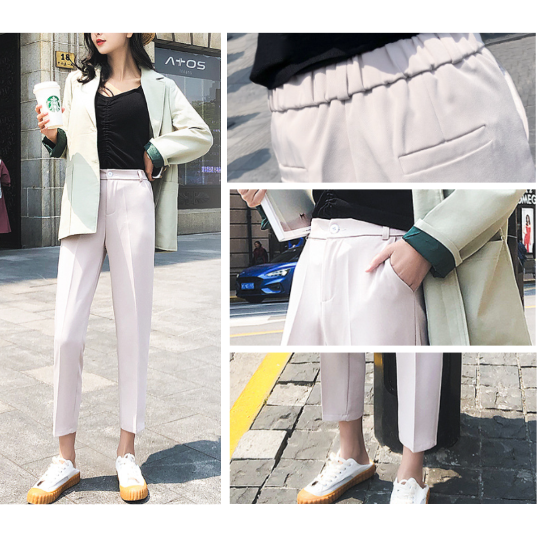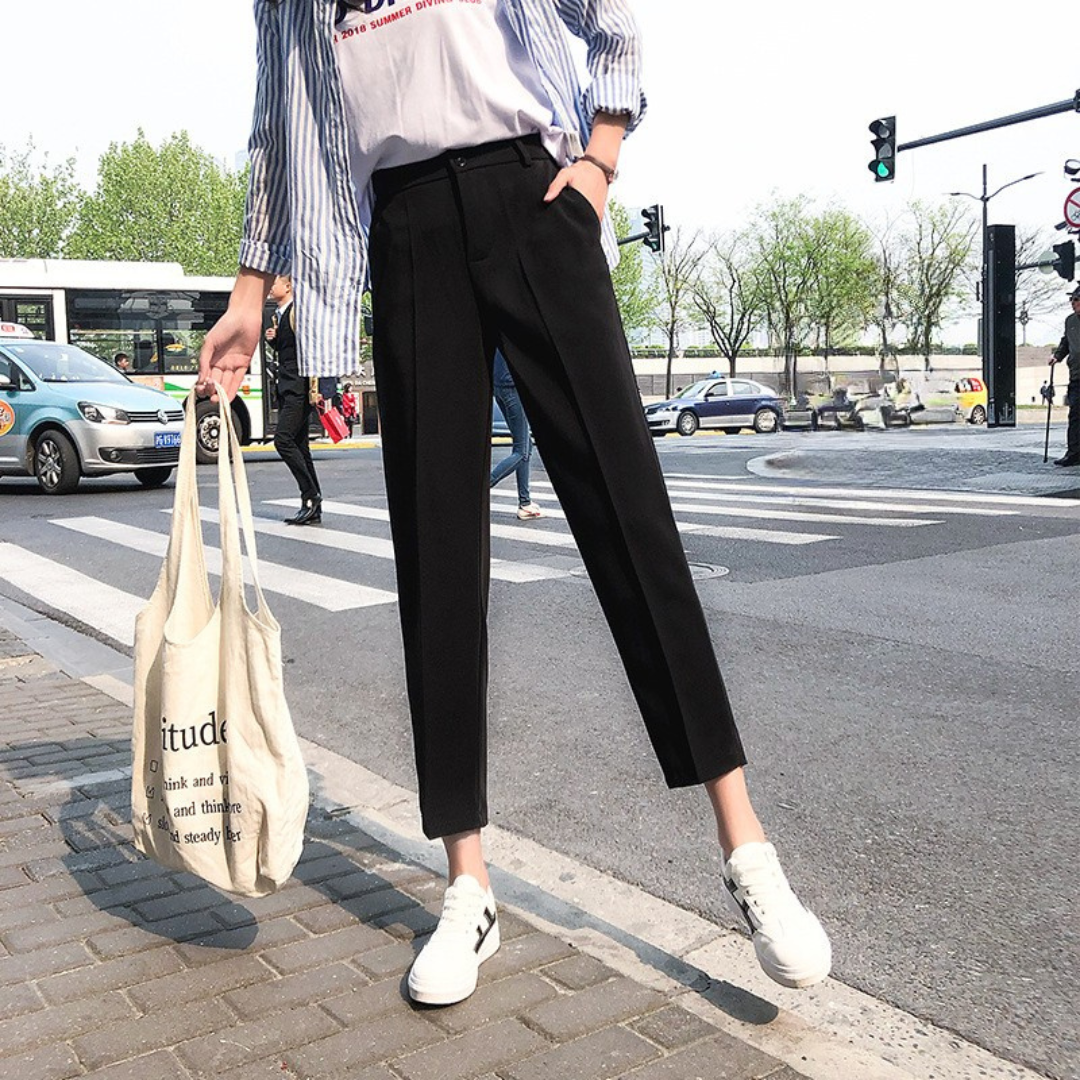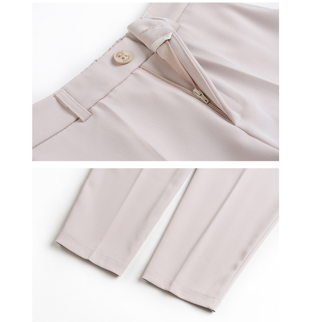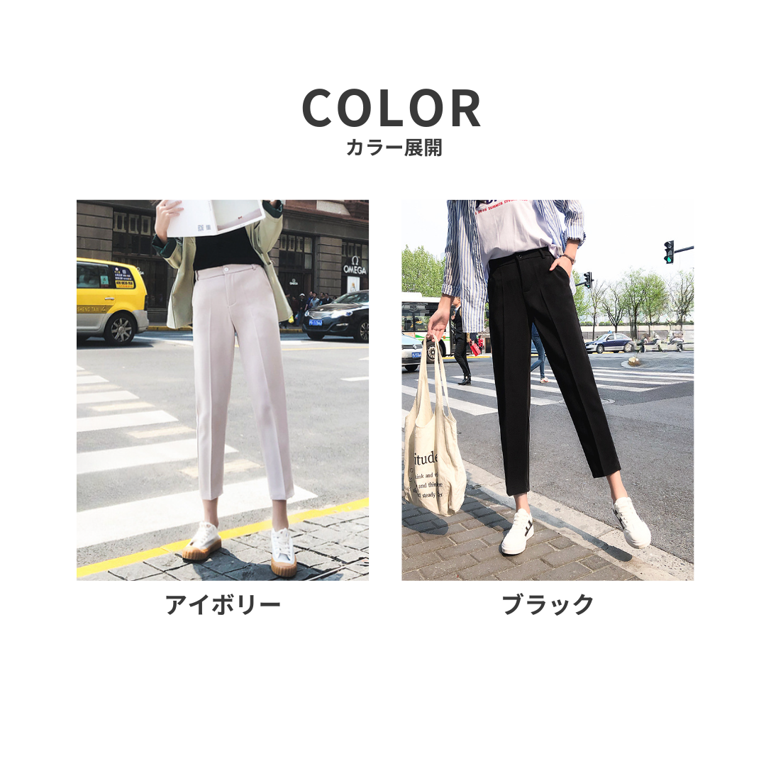 腰まわりのボリュームや下半身の重たさが気になりやすい方にも、すっきりとした印象で着こなせるテーパードパンツ。ヒップから裾にかけて細くなるシルエットが脚のラインを整え、全身をスマートなバランスに導きます。足首が見える丈感が抜け感を生み、重たくなりがちなコーディネートを軽やかな印象に。程よい厚みと落ち感のある素材が体のラインを拾いすぎず、きれいなシルエットをキープ。通勤からきれいめカジュアルまで幅広く活躍する一本です。