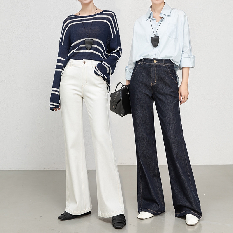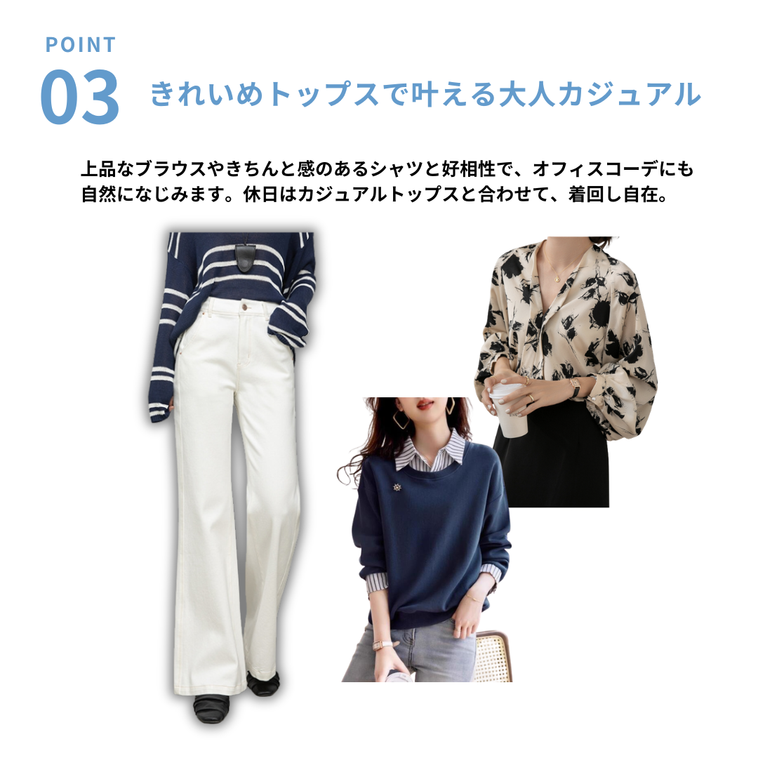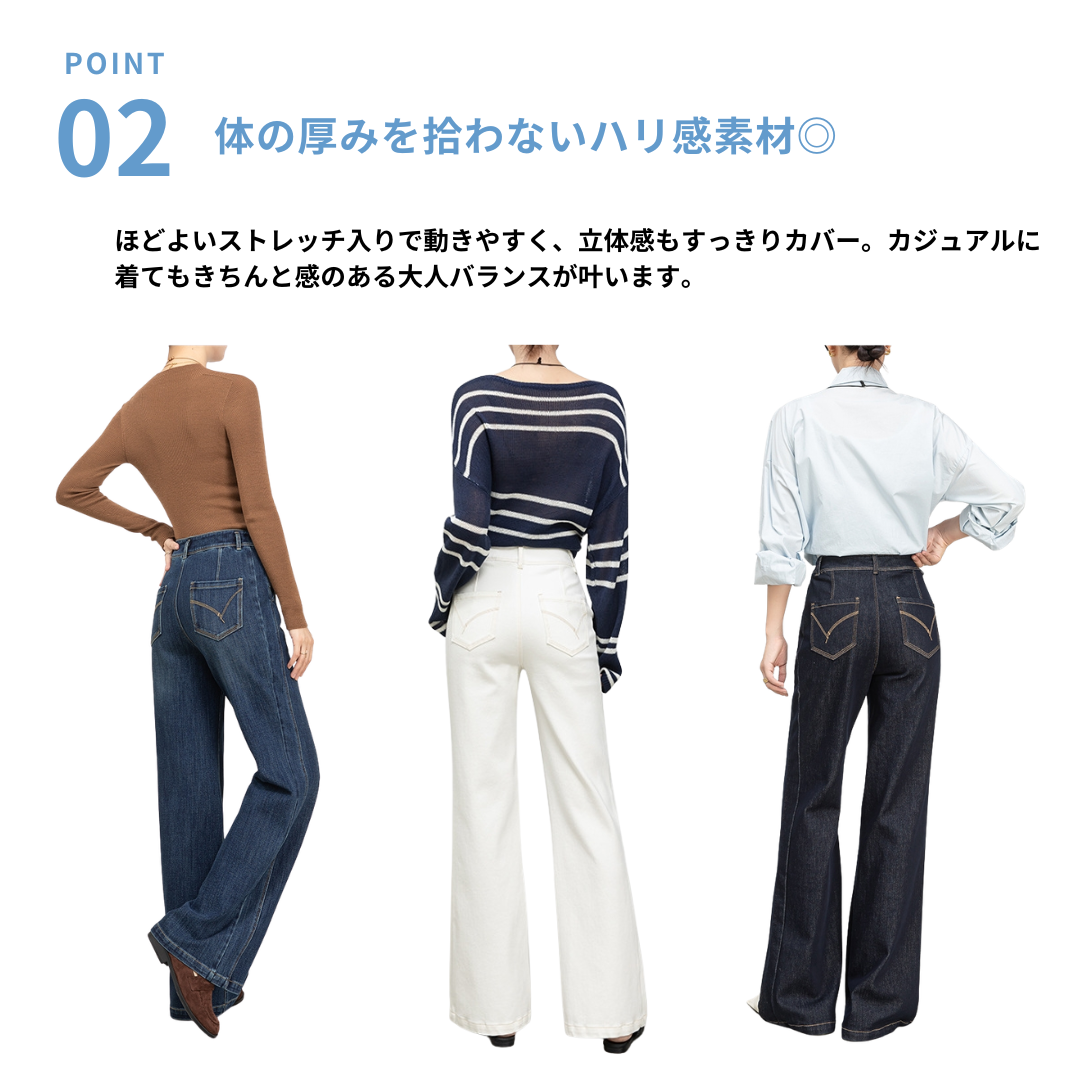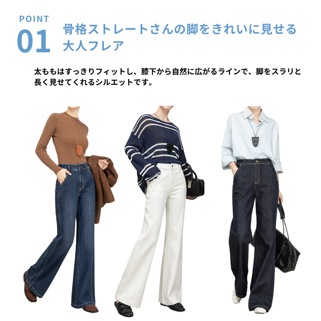 脚のラインをまっすぐ美しく見せながら、下半身のボリューム感をすっきり整えるストレッチフレアデニム。太ももまでは程よくフィットし、膝下から自然に広がるシルエットが縦ラインを強調し、スタイルアップした印象に導きます。適度なハリと厚みのあるデニム素材が、体のラインを拾いすぎず、骨格ストレートの立体的なボディをきれいに引き立てます。ストレッチ性があり動きやすく、きちんと感と快適さを両立。カジュアルにもきれいめにも着回せる、大人のための美脚デニムです。