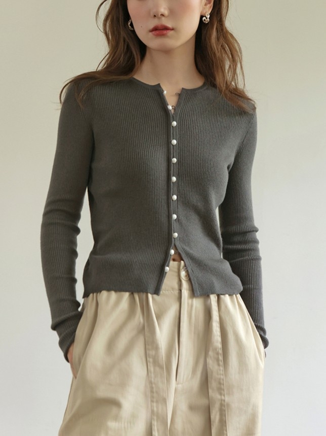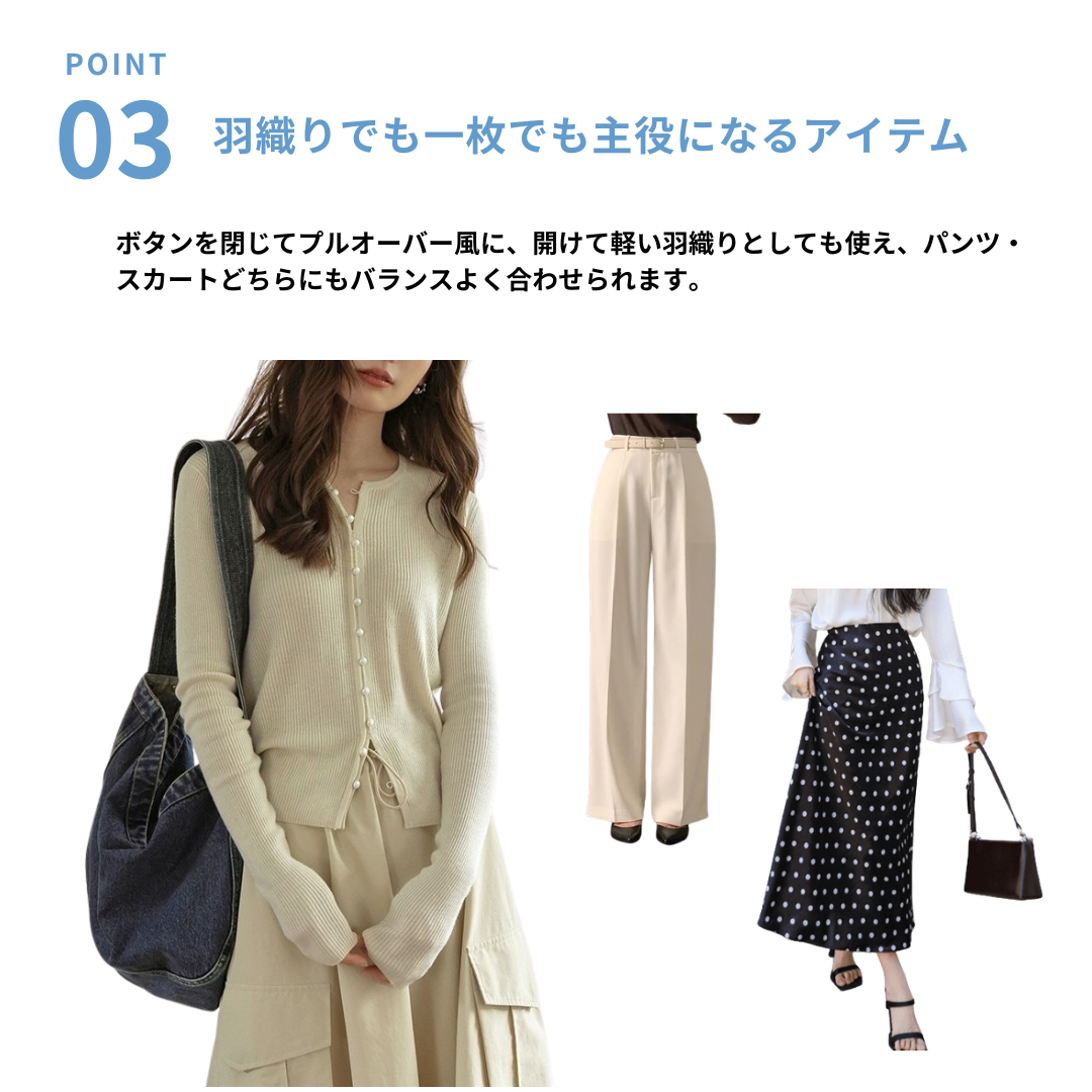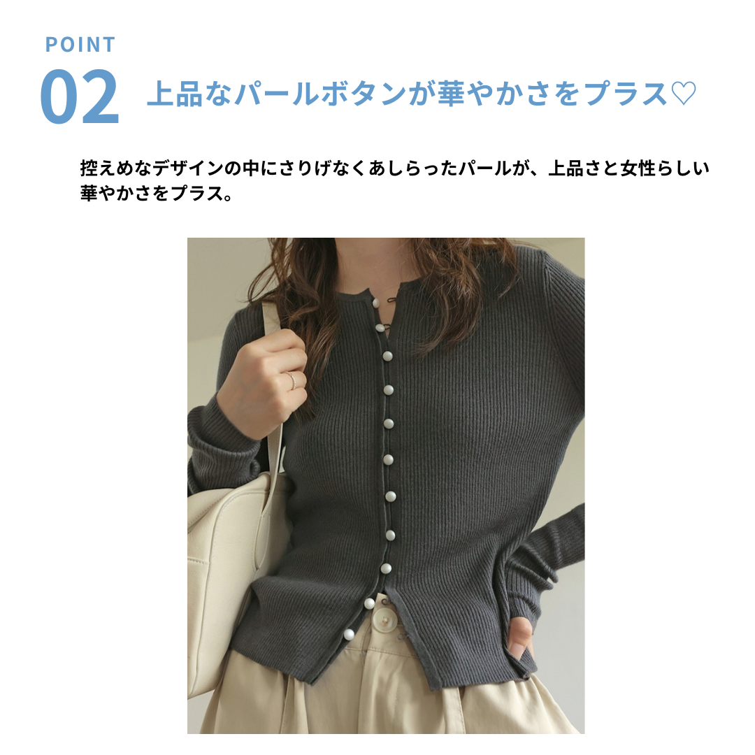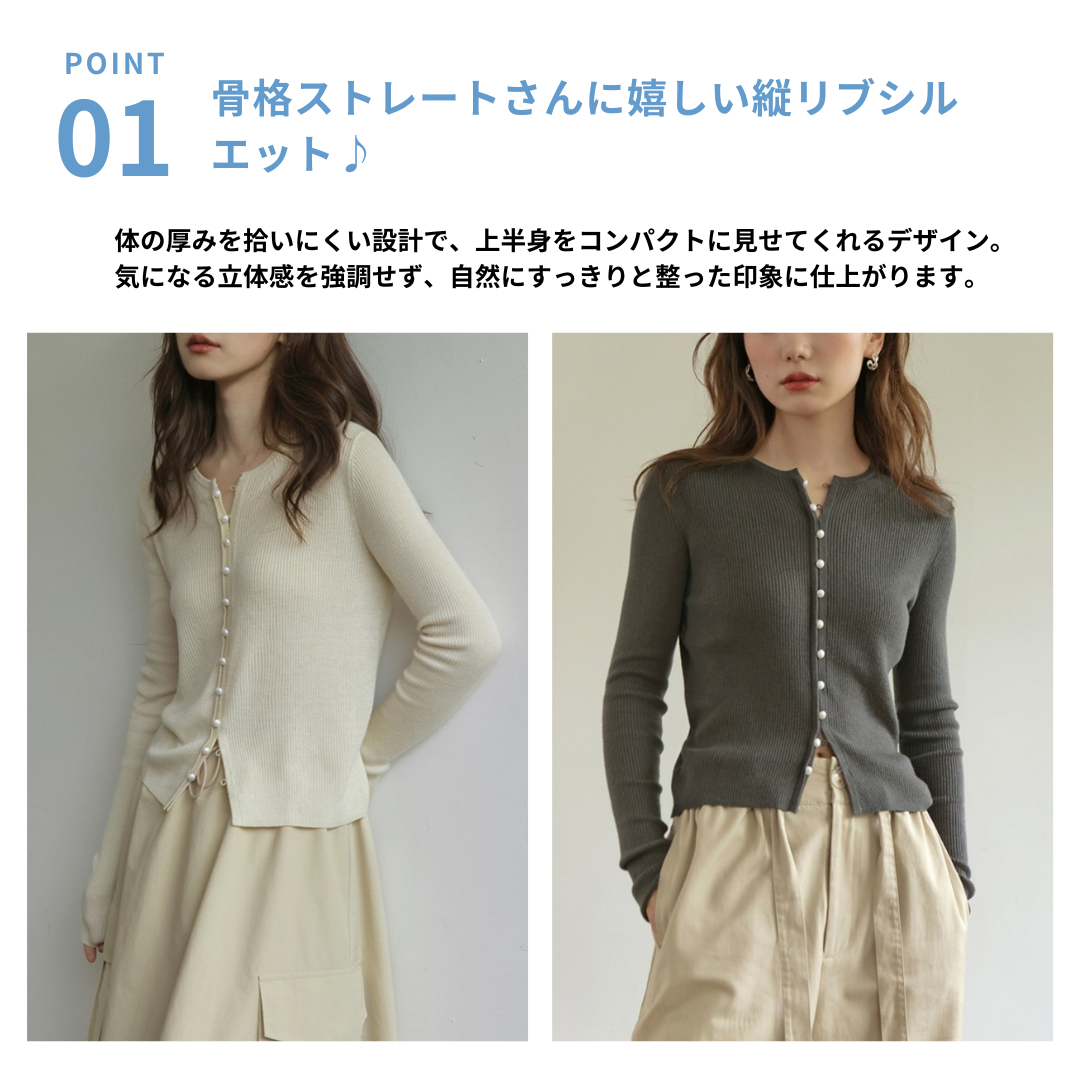 上半身に厚みが出やすい骨格ストレートさんのバランスを整え、すっきりとした印象に見せるリブニットカーディガン。体のラインを自然に整える縦リブと、装飾を控えたシンプルなシルエットが、上半身をコンパクトにまとめながら上品な雰囲気を演出します。フロントのパールボタンがさりげない華やかさを添え、1枚でも羽織りでも活躍。きれいめからカジュアルまで幅広く着回せる大人のデイリーアイテムです。