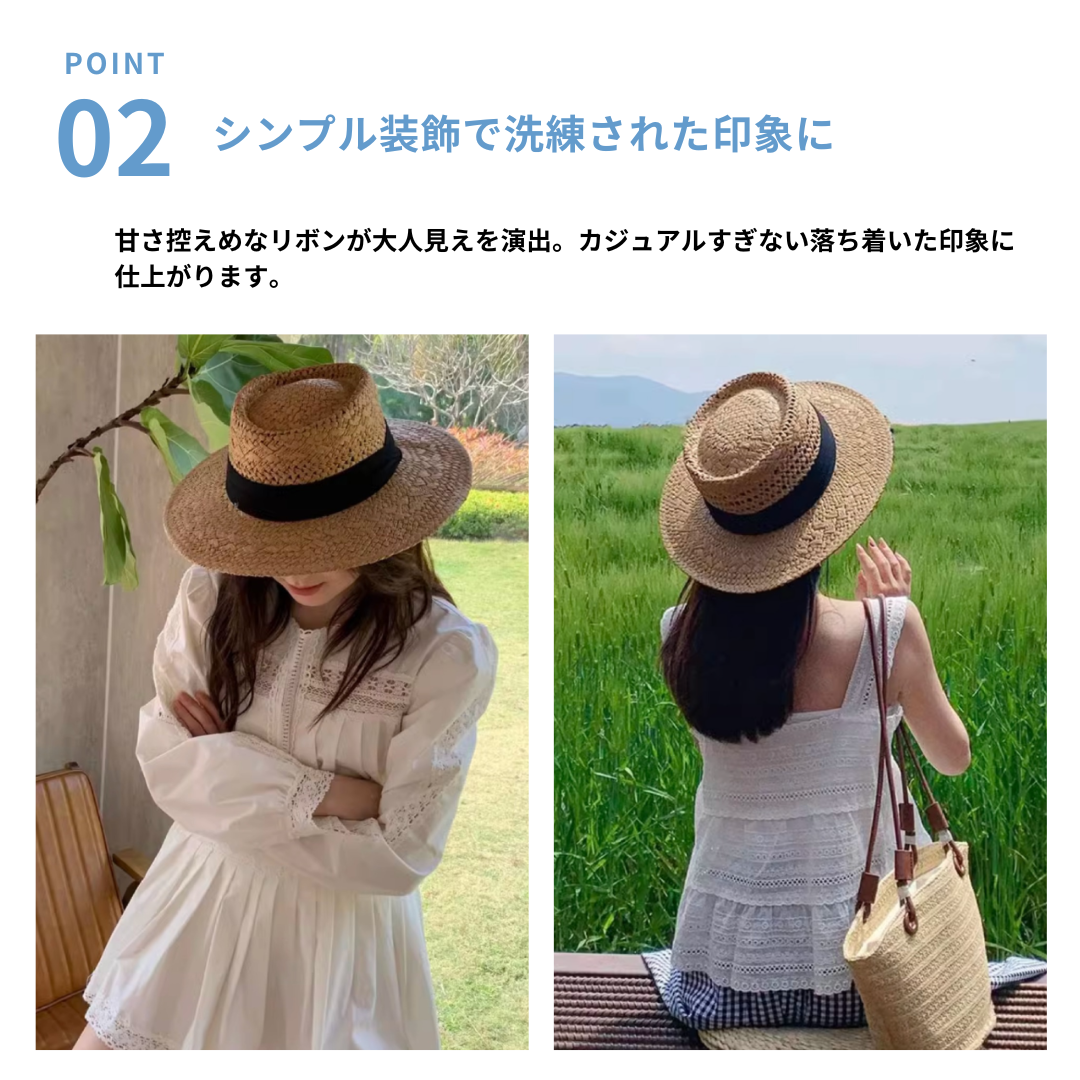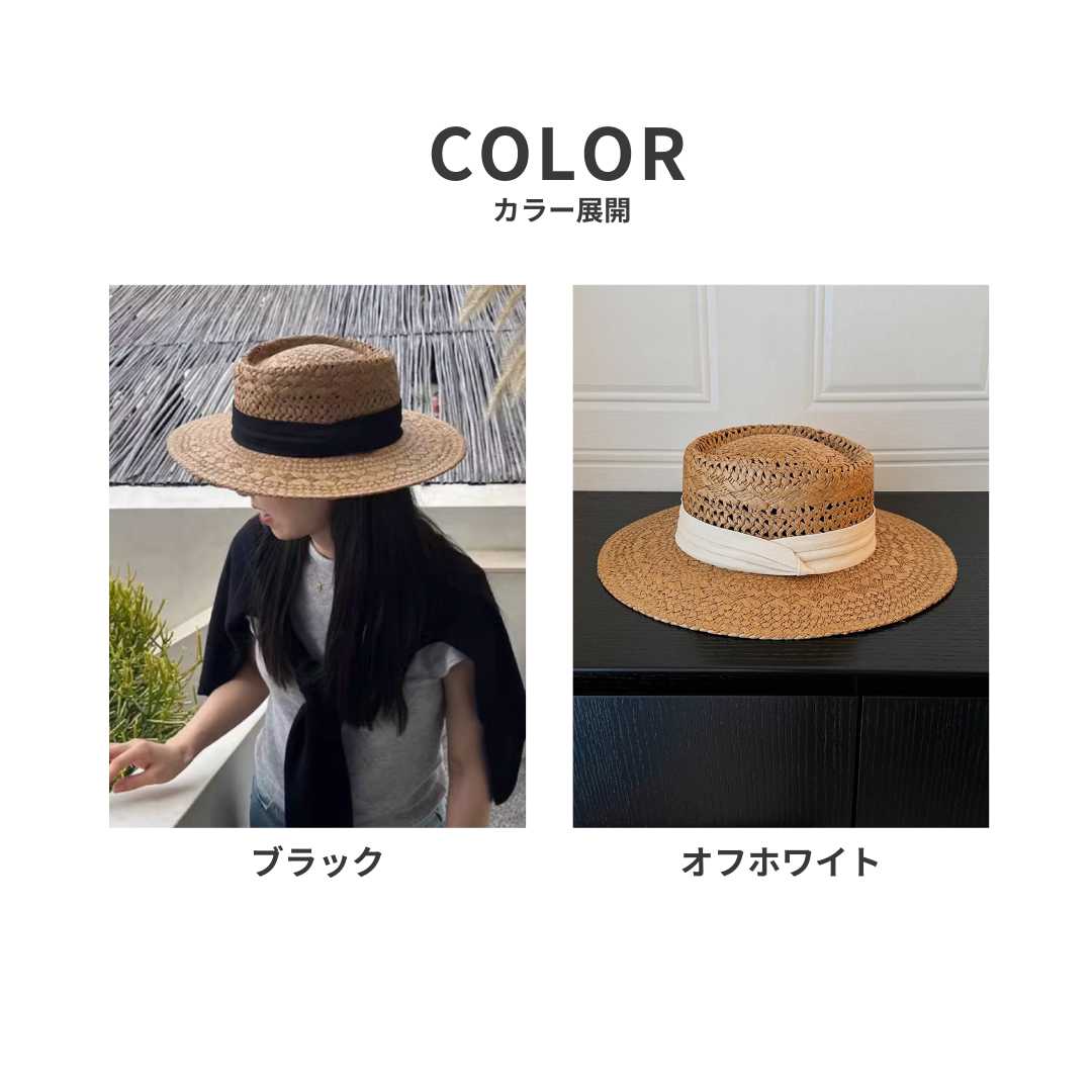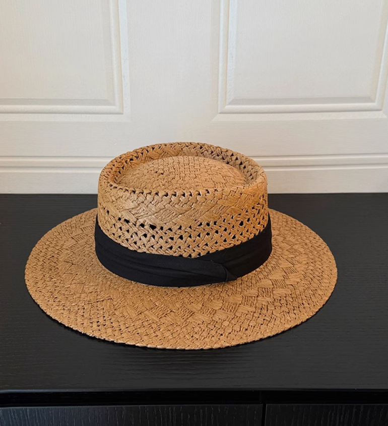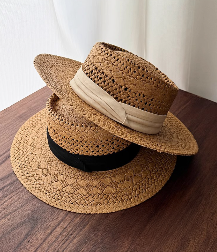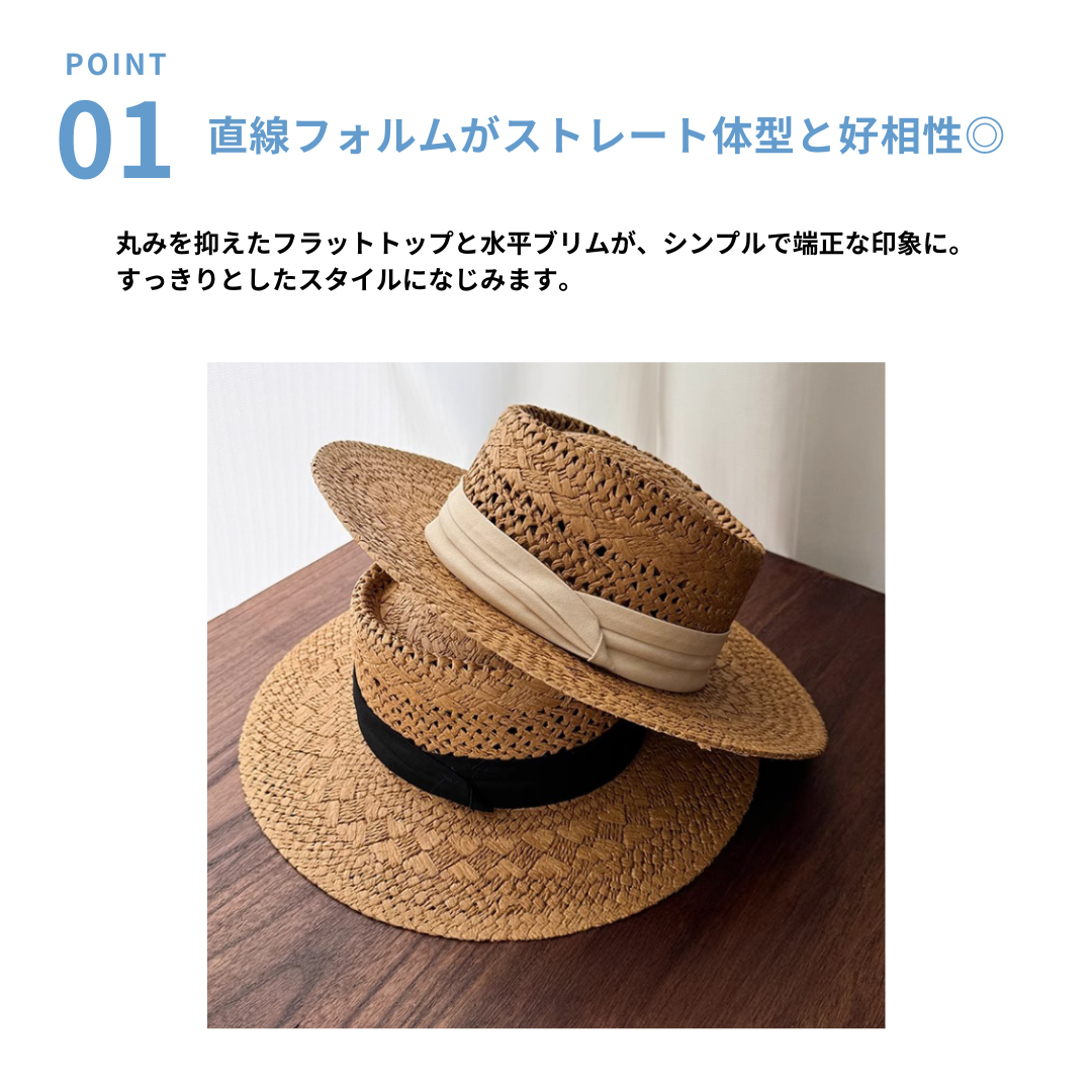 直線的なフォルムが印象的なカンカン帽は、シンプルで端正なスタイルと相性のよい夏の定番アイテム。フラットなクラウンと水平なブリムが、すっきりとした印象をつくり、甘さを抑えた大人の雰囲気に仕上げます。装飾を控えたブラックリボンがほどよいアクセントとなり、きれいめカジュアルからリゾートスタイルまで幅広く活躍します。