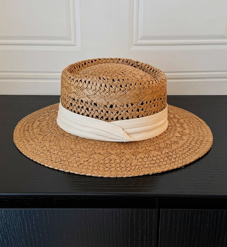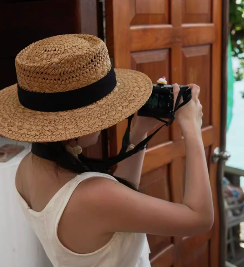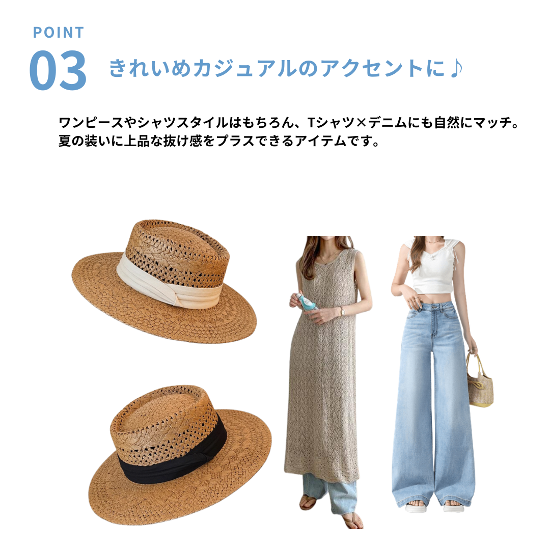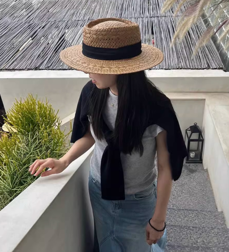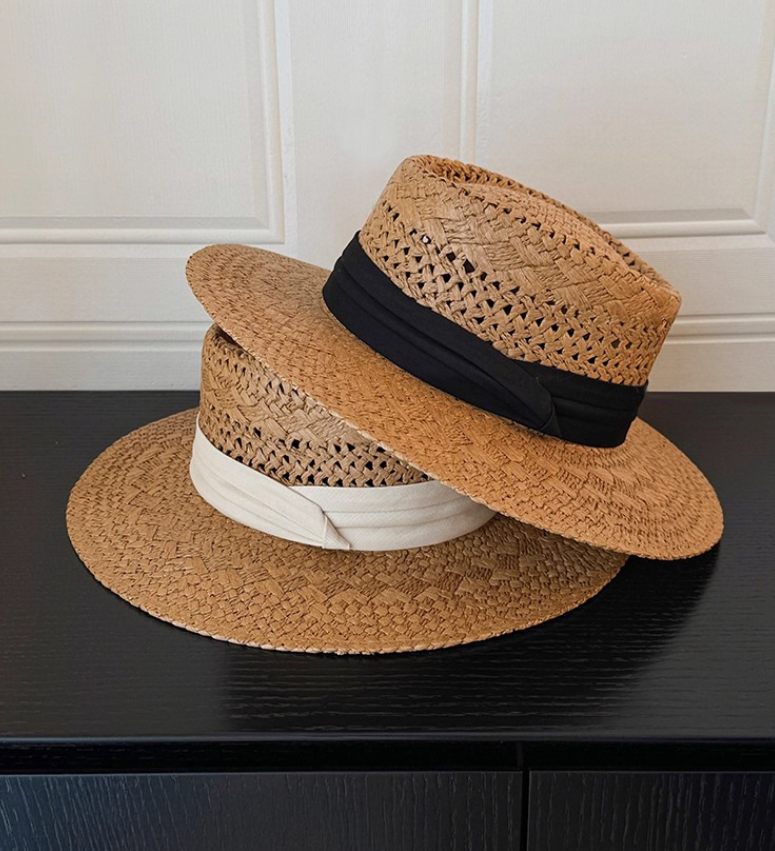 直線的なフォルムが印象的なカンカン帽は、シンプルで端正なスタイルと相性のよい夏の定番アイテム。フラットなクラウンと水平なブリムが、すっきりとした印象をつくり、甘さを抑えた大人の雰囲気に仕上げます。装飾を控えたブラックリボンがほどよいアクセントとなり、きれいめカジュアルからリゾートスタイルまで幅広く活躍します。