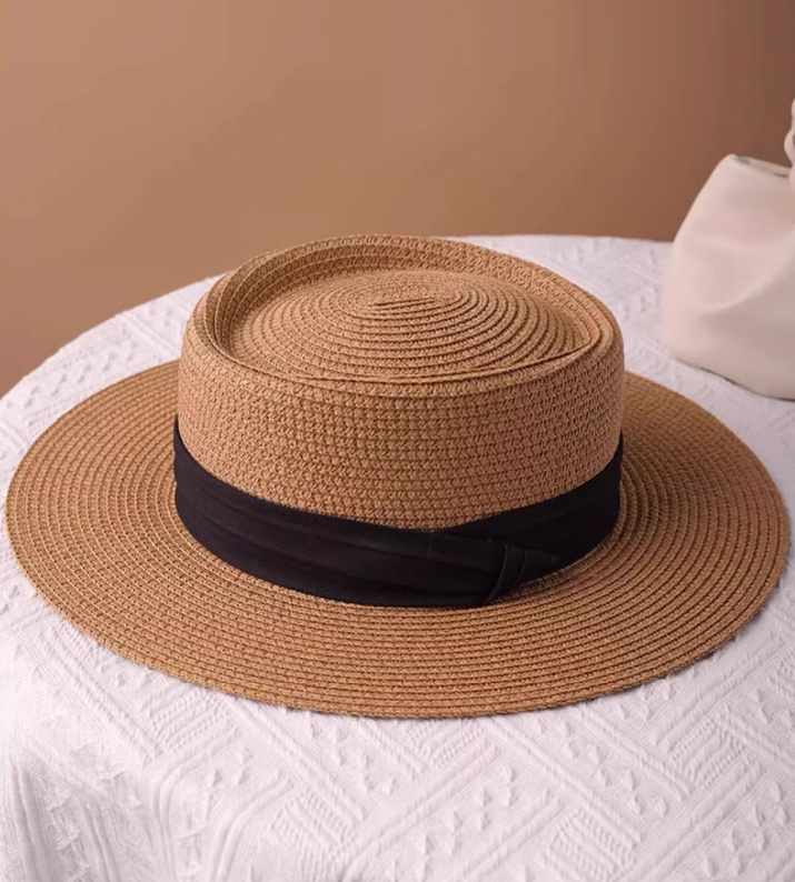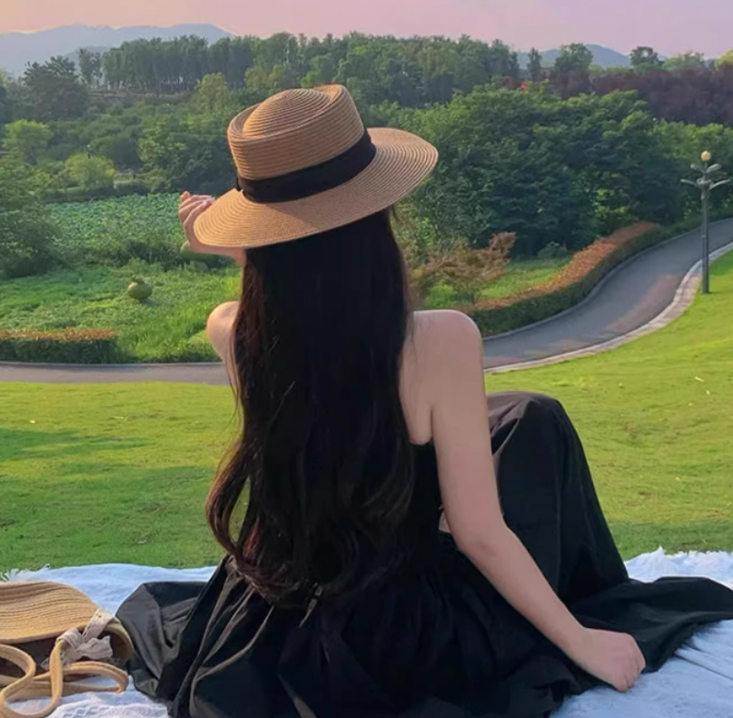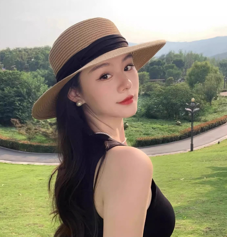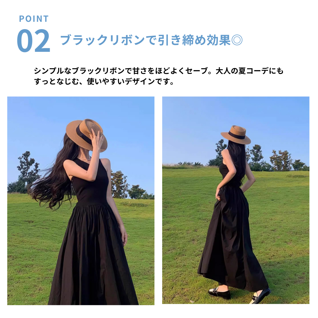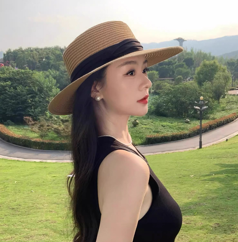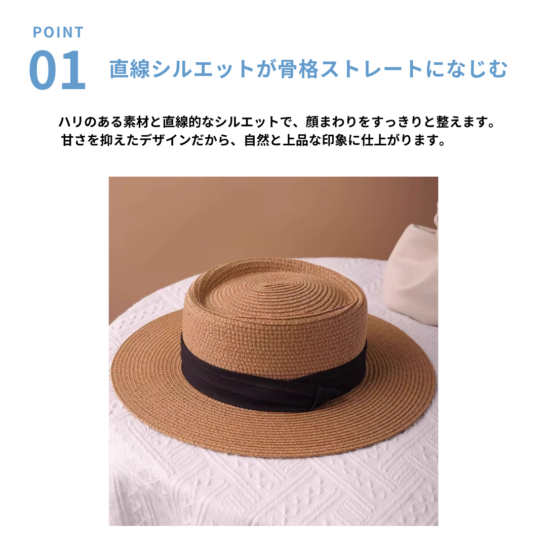 直線的で端正なシルエットが魅力のフラットトップ麦わら帽。型崩れしにくいしっかりとしたフォルムと、シンプルなブラックリボンが顔まわりをすっきり見せ、洗練された印象に整えます。装飾を抑えたミニマルなデザインは、骨格ストレートさんの立体感のある上半身と調和し、大人らしいきちんと感のある夏スタイルを叶えるアイテムです。