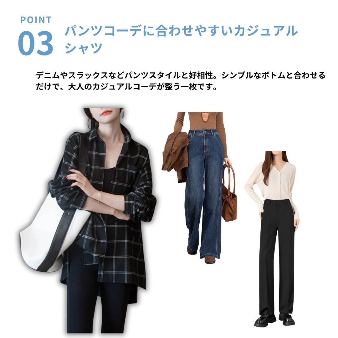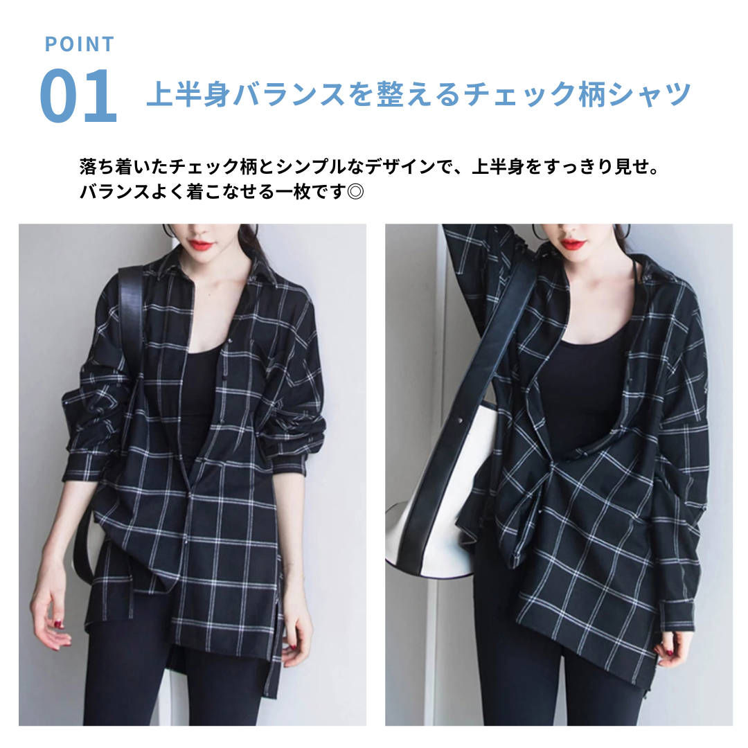 骨格ストレートさんの上半身をすっきり見せやすい、チェック柄のシャツトップス。ほどよくゆとりのあるシルエットと縦に流れるラインが上半身の印象を整え、落ち着いた大人のカジュアルスタイルにまとまります。シンプルなチェック柄がコーディネートに程よいアクセントを添え、デニムやスラックスとも合わせやすいデザイン。前を開けて羽織りとしても着られるため、コーディネートの幅が広がる一枚です。