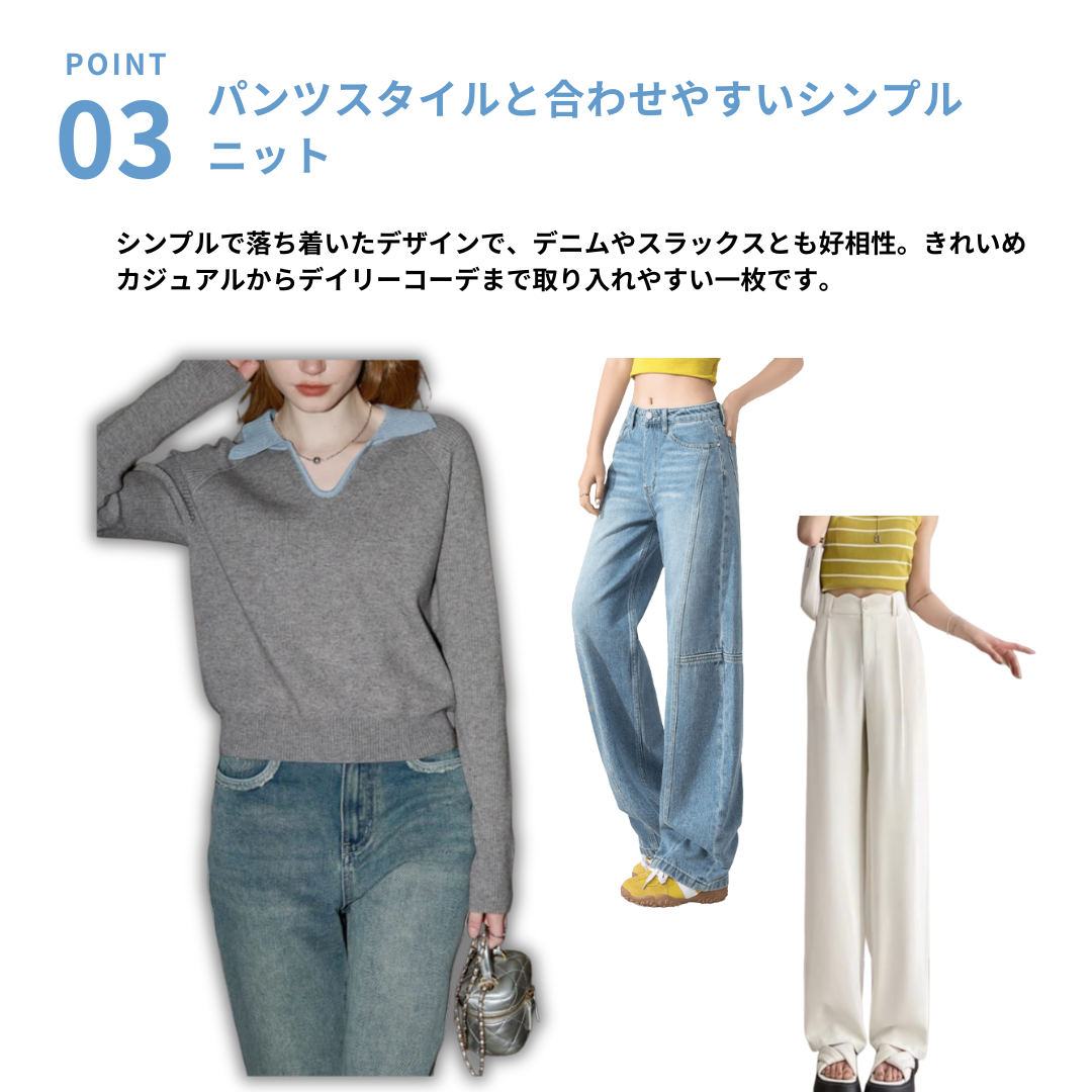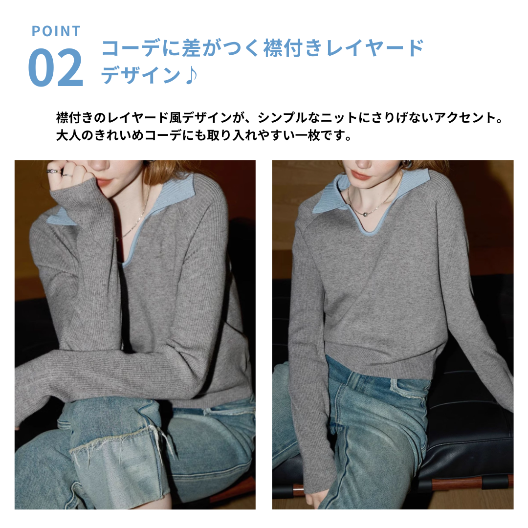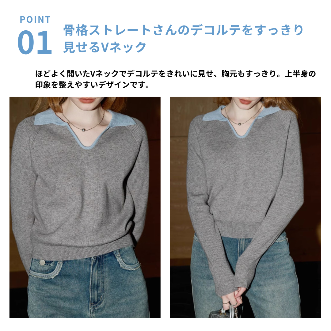 骨格ストレートさんの上半身をすっきり見せやすい、Vネックデザインの襟付きレイヤードニット。ほどよく開いたVネックがデコルテラインをきれいに見せ、上半身の印象を整えやすい一枚です。襟付きのレイヤード風デザインがシンプルなニットにアクセントを添え、きれいめカジュアルにも取り入れやすいデザイン。コンパクトなシルエットでパンツスタイルとも好相性。デニムやスラックスと合わせるだけで、落ち着いた大人のカジュアルコーデが整います。
