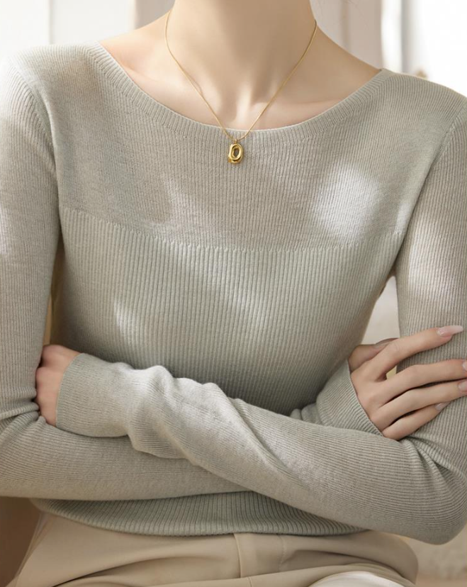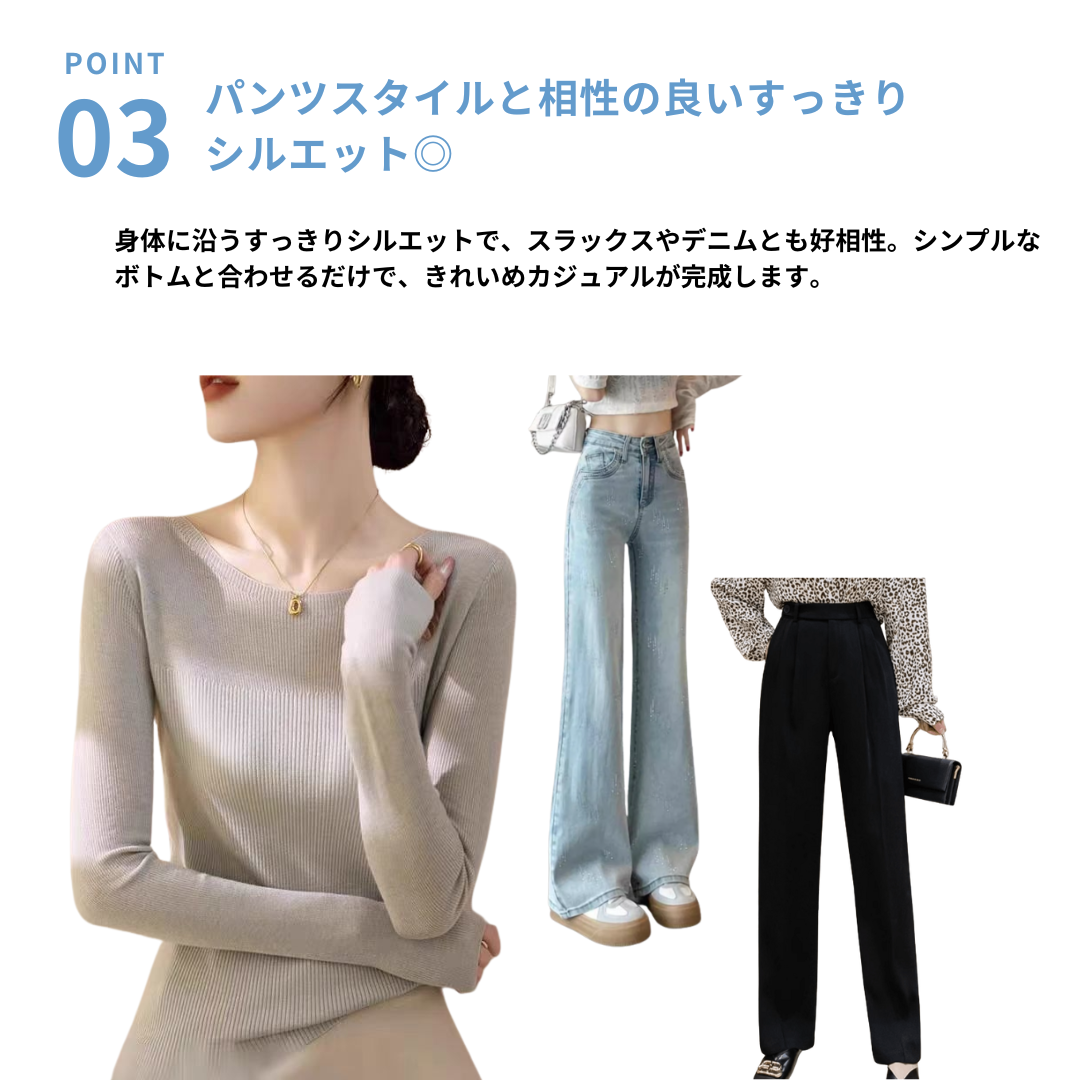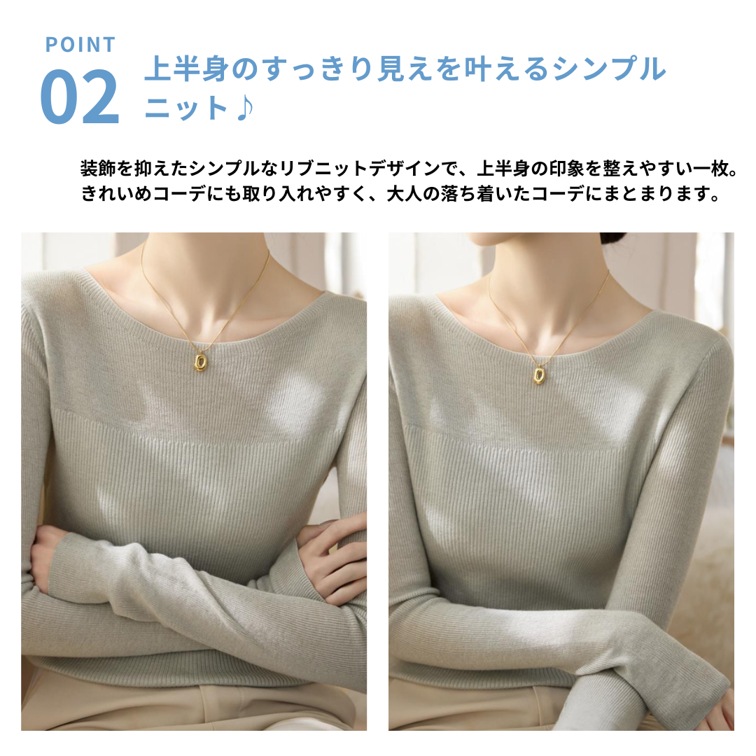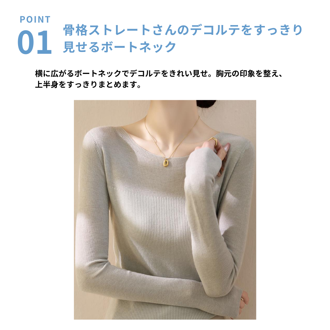 骨格ストレートさんの上半身をすっきり見せやすい、ボートネックデザインのニットトップス。横に広がるボートネックがデコルテラインをきれいに見せ、上半身の印象をバランスよく整えます。装飾を抑えたシンプルなリブニットで、落ち着いた大人のスタイルに取り入れやすい一枚。身体に沿うすっきりとしたシルエットでパンツスタイルとも好相性。デニムやスラックスと合わせるだけで、きれいめカジュアルなコーディネートが整います。
