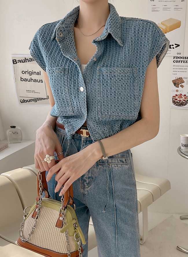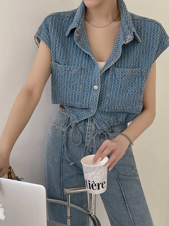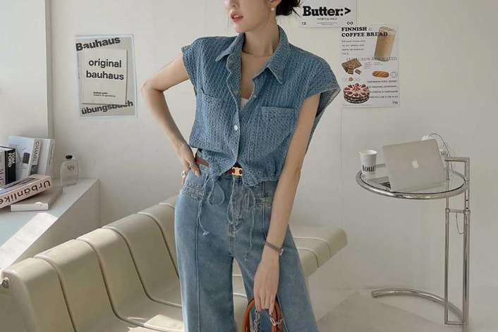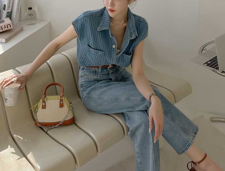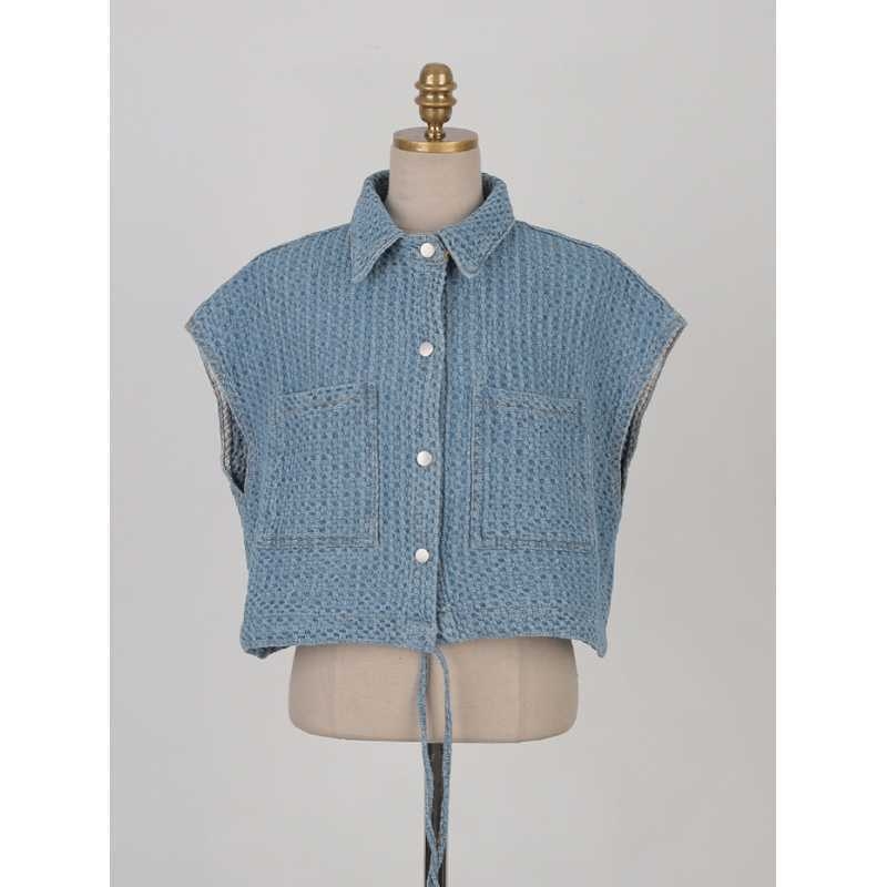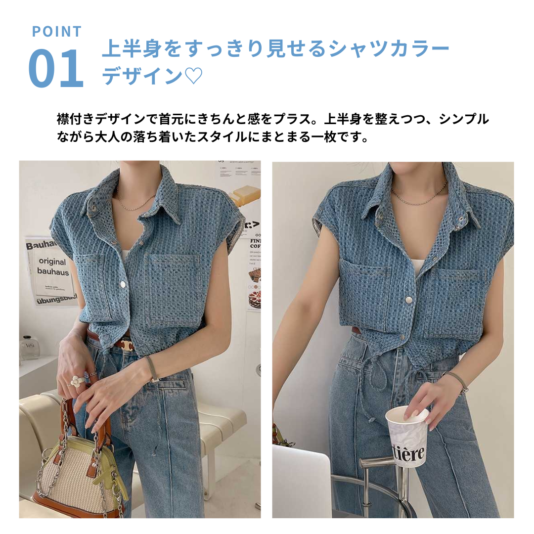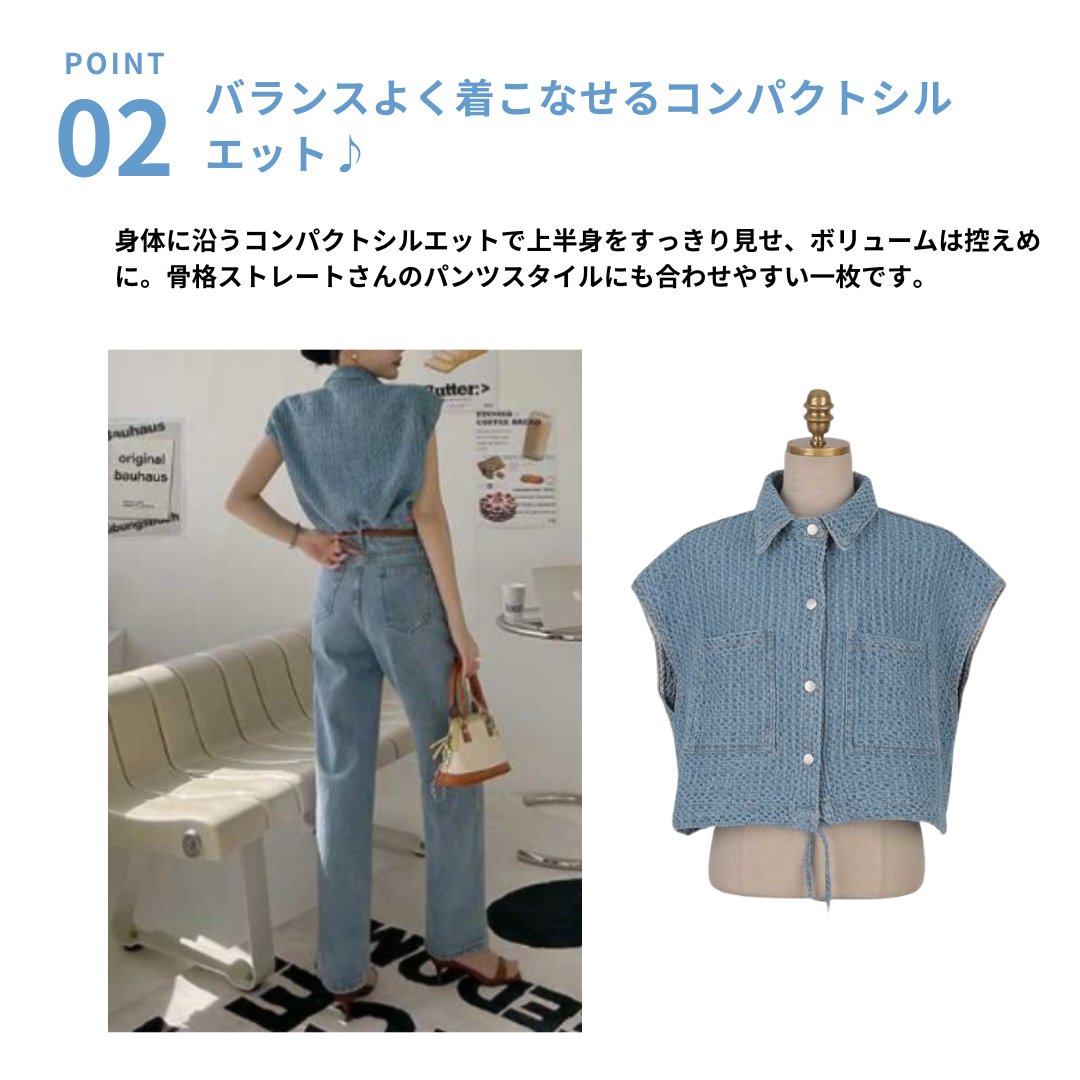 骨格ストレートさんの上半身をすっきり見せやすい、デニム風素材のサマーニットベスト。シャツカラーとフロントボタンのデザインがコーディネートにきちんと感を添え、大人のカジュアルスタイルにまとまります。コンパクトなシルエットで上半身の印象を整えやすく、パンツスタイルとも相性の良い一枚。デニムやスラックスと合わせるだけで、こなれた大人のカジュアルコーデが完成します。季節感のある素材で、軽やかな着こなしを楽しめるトップスです。
