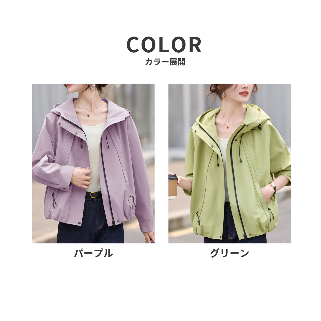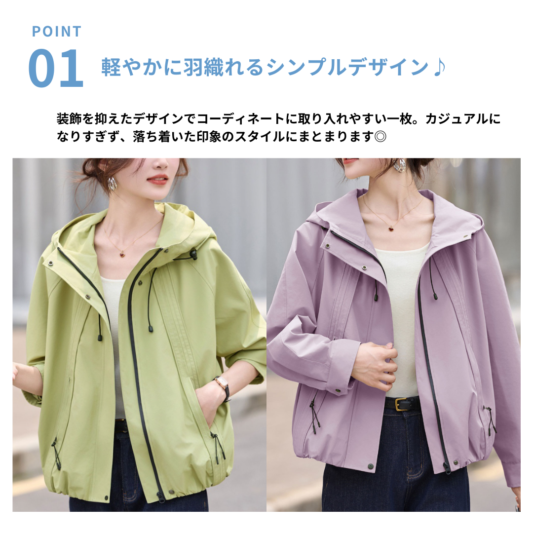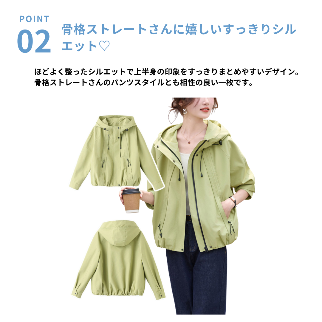 骨格ストレートさんの上半身をすっきり見せながら、カジュアルコーデに取り入れやすいフード付きウインドブレーカー。装飾を抑えたシンプルなデザインと軽やかな素材が、コーディネートの印象を整えた大人のスタイルにまとまります。ほどよい丈感でパンツスタイルともバランスよく、デイリーコーデにも取り入れやすい一枚。季節の変わり目にも活躍する軽やかなアウターです。