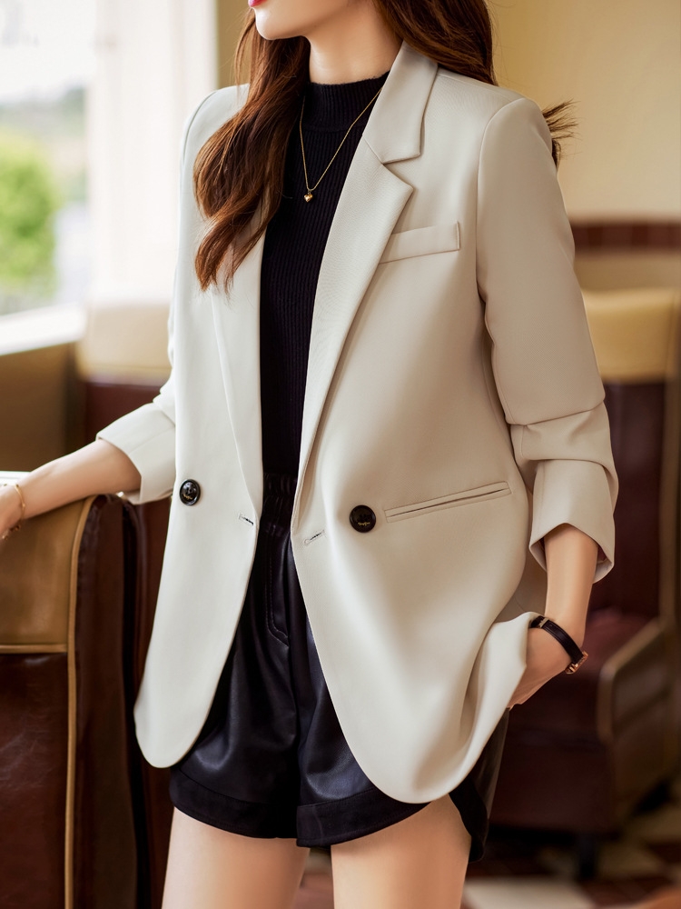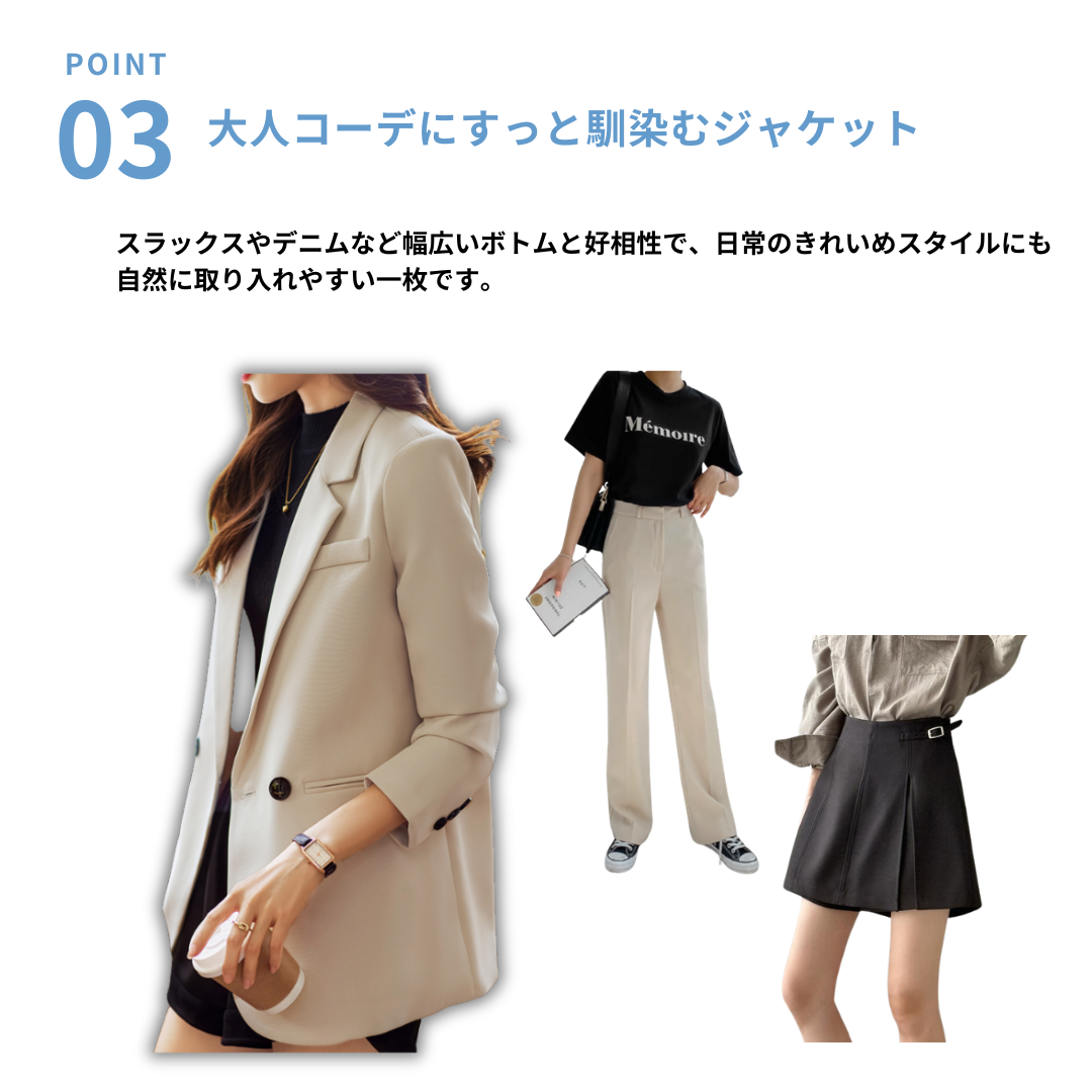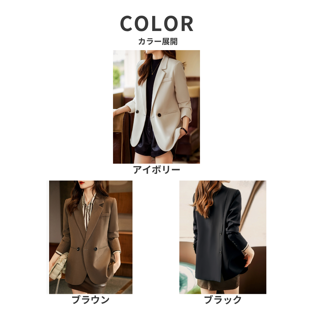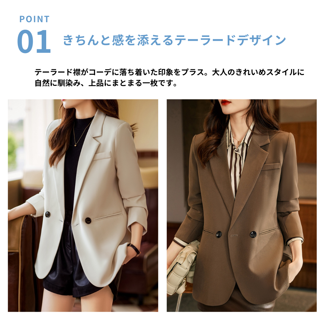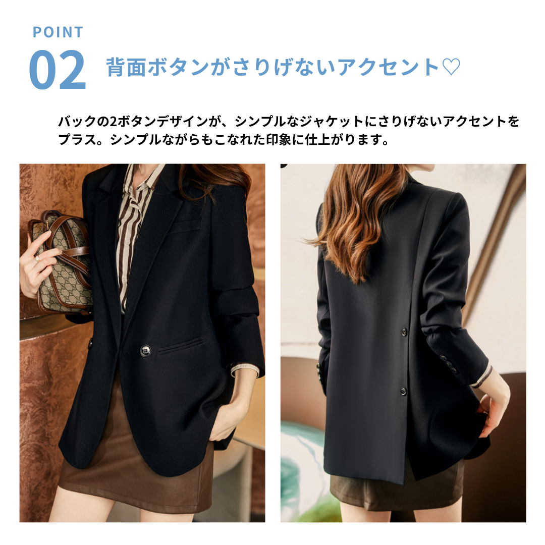 骨格ストレートさんのきれいめスタイルに取り入れやすい、バック2ボタンデザインのテーラードジャケット。シンプルなテーラードデザインに背面のボタンディテールがさりげないアクセントを添え、コーディネートの印象を整えます。スラックスやデニムと合わせることで、大人の落ち着いたスタイルにまとまる一枚です。