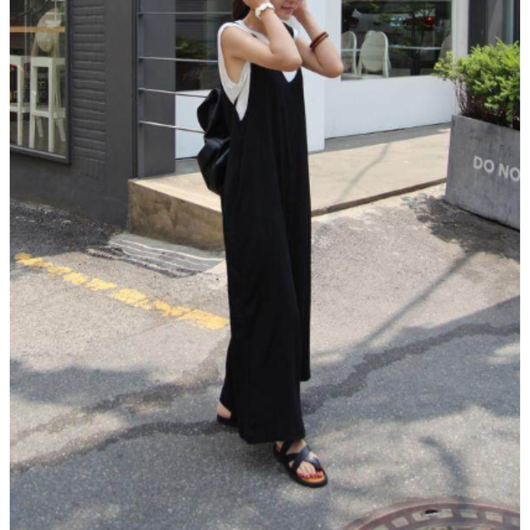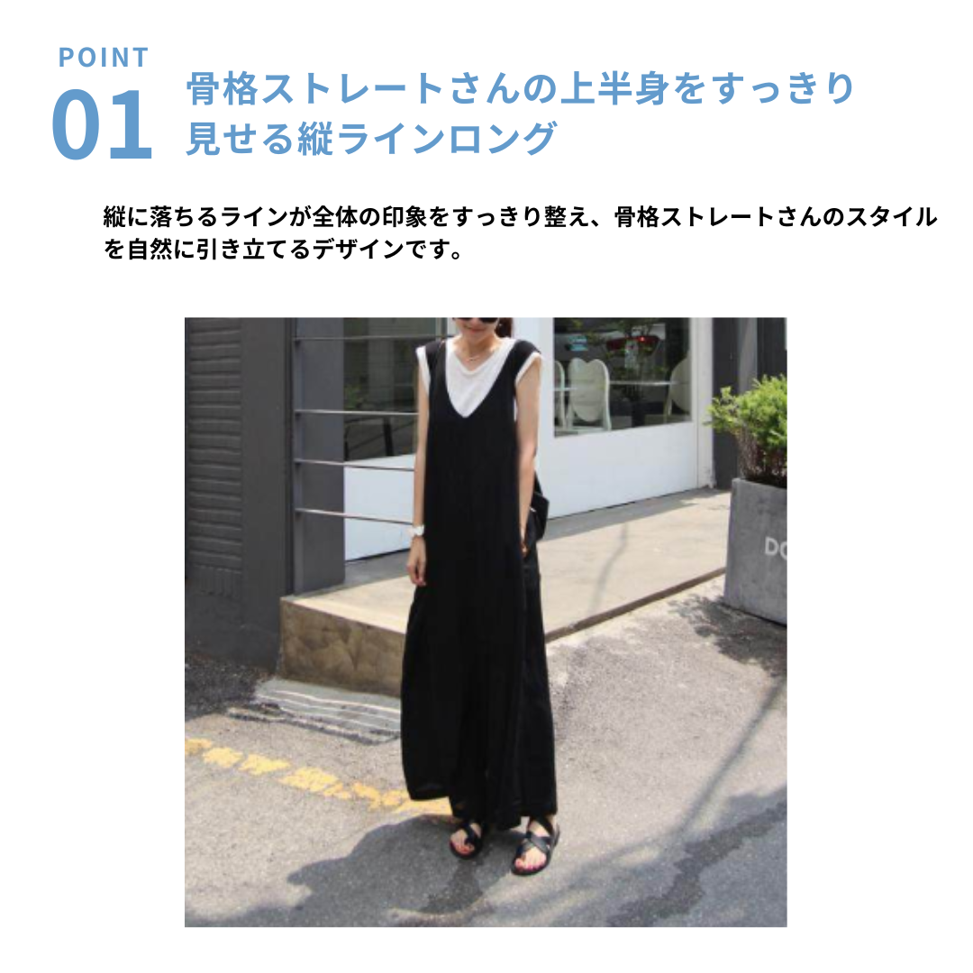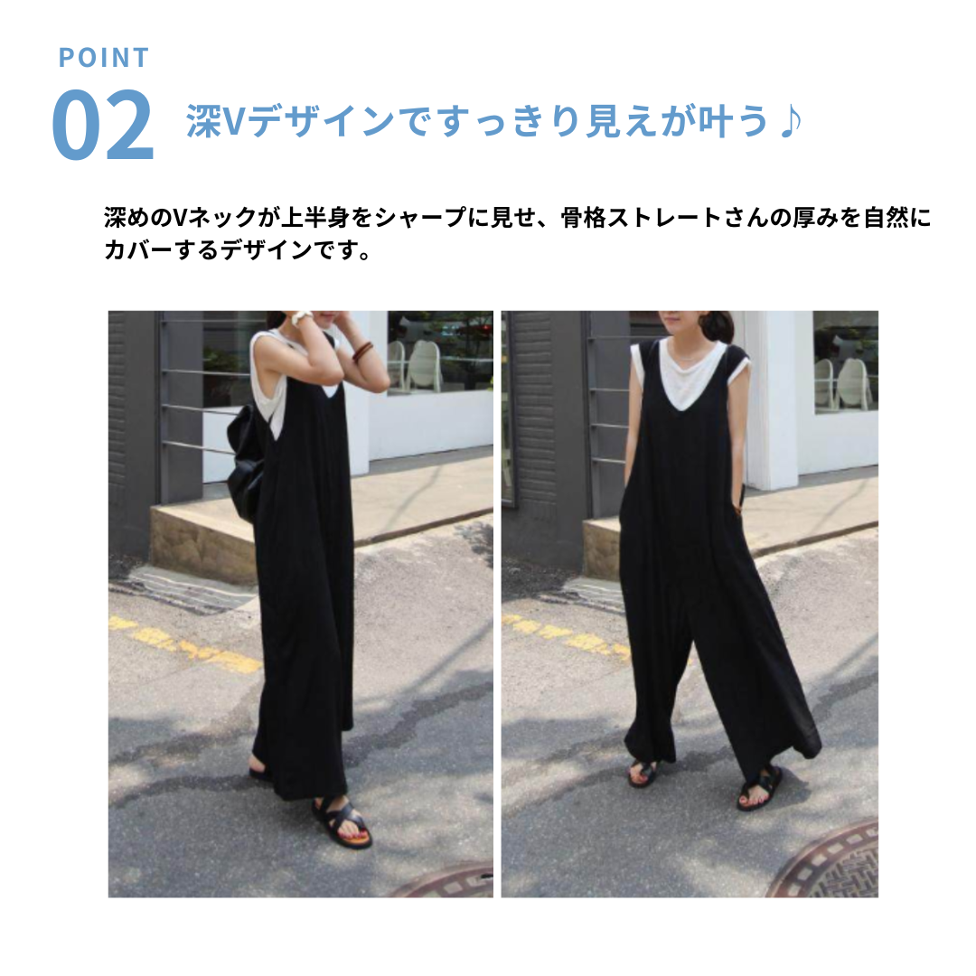 すとんと落ちるIラインシルエットが魅力のサスペンダーロングパンツ。深めのVラインデザインが上半身をすっきり見せ、骨格ストレートさんの立体的な体型をきれいに引き立てます。程よいゆとりのあるシルエットで体のラインを拾いにくく、シンプルなインナー合わせでも洗練された印象に。カットソーやブラウスを合わせるだけで、大人のきれいめカジュアルが完成する着回し力の高い一着です。