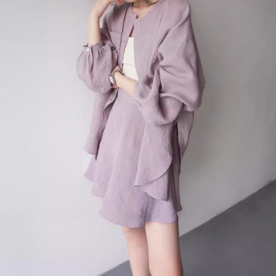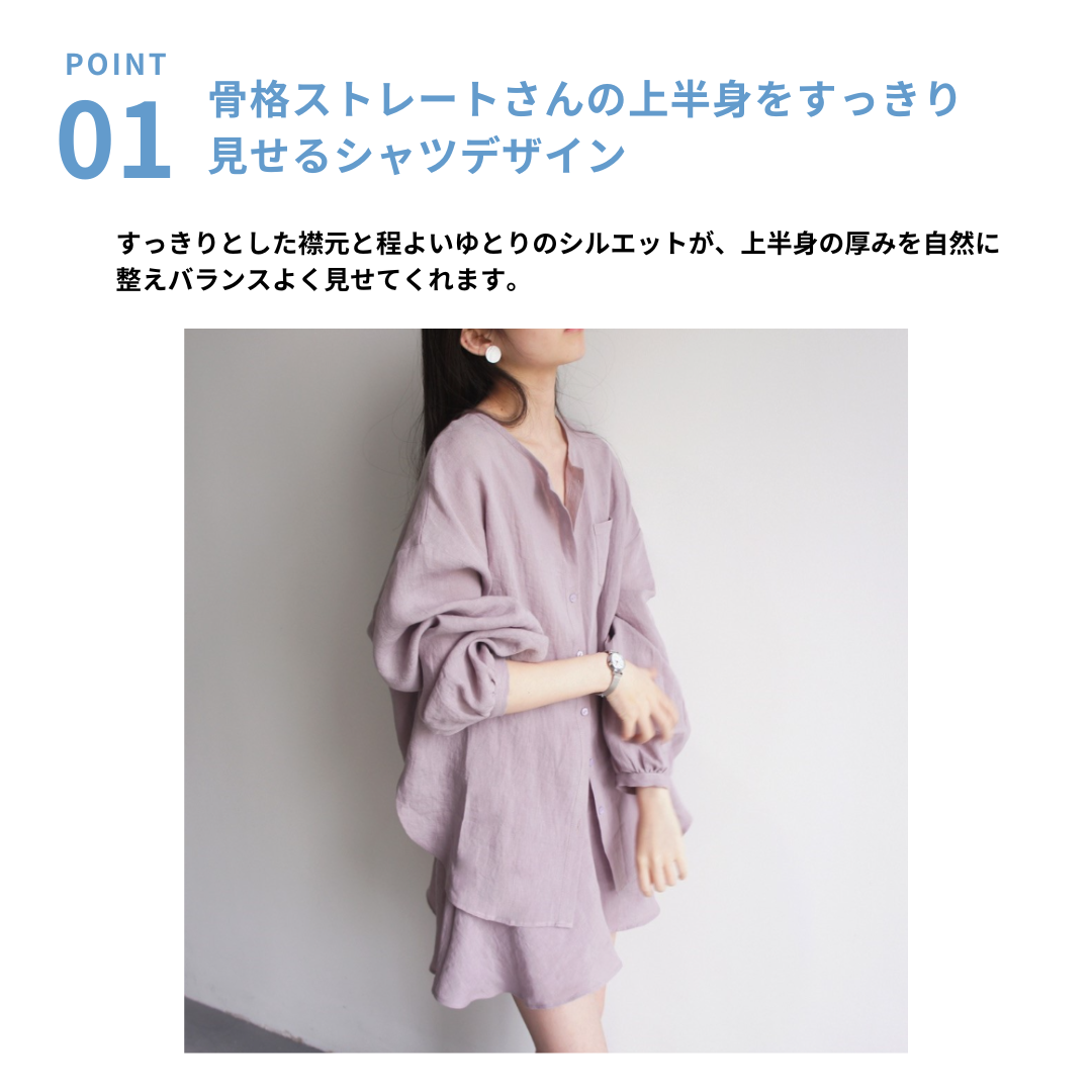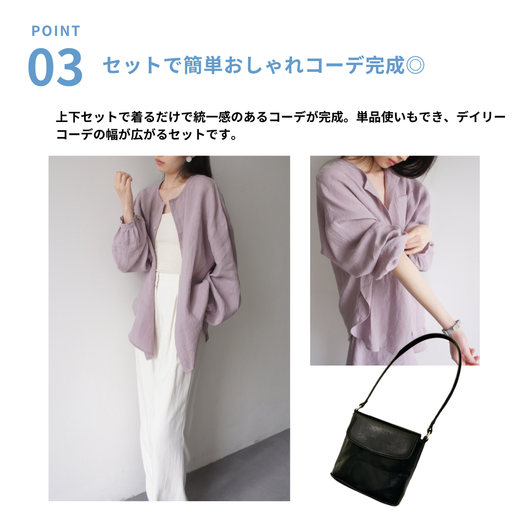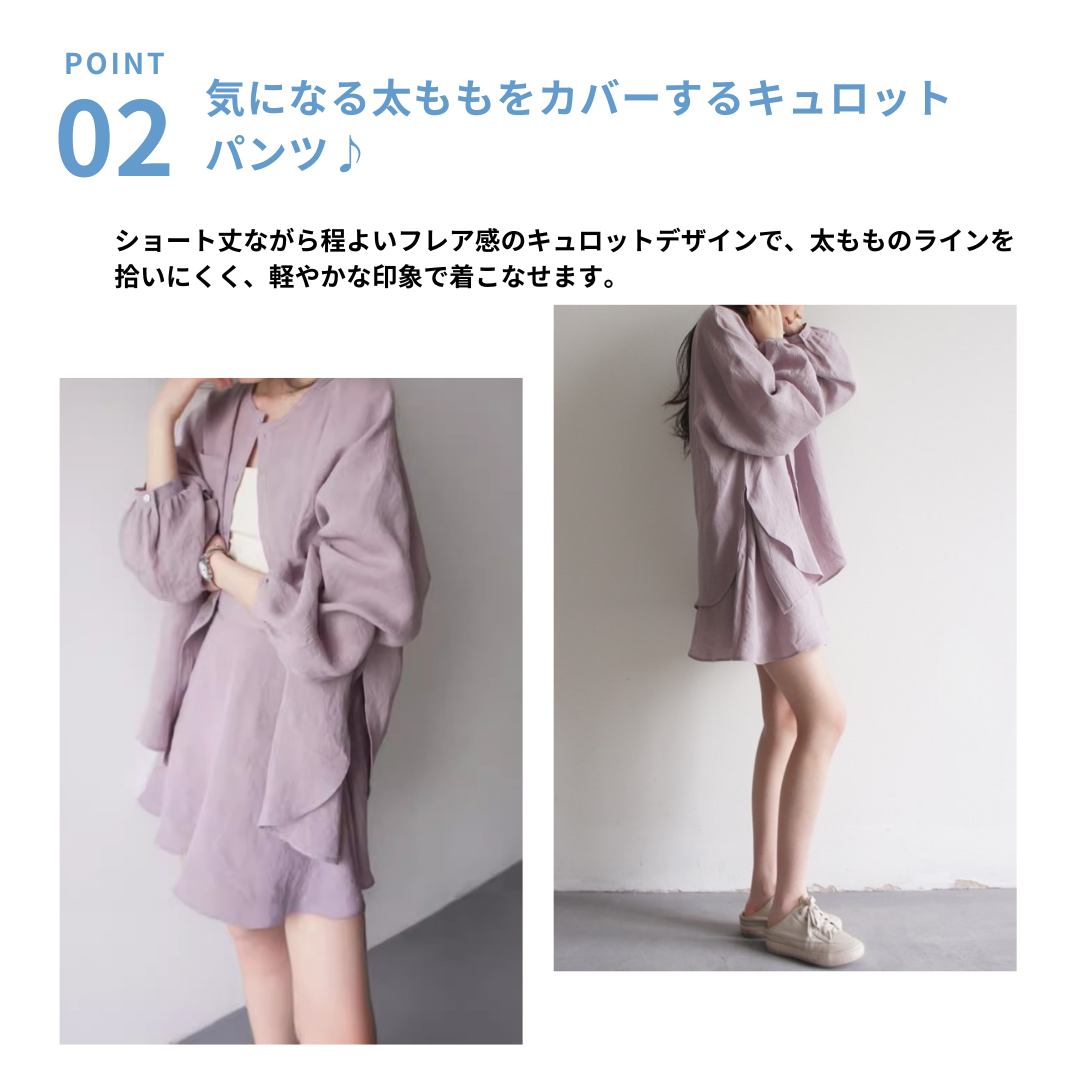 軽やかなパープルカラーが女性らしさを引き立てる、シャツブラウスとキュロットショートパンツのセット。程よくゆとりのあるシルエットが体のラインを拾いにくく、骨格ストレートさんの上半身の厚みや腰まわりを自然にカバーします。すっきりとしたVネック風の襟元がデコルテをきれいに見せ、抜け感のある印象に。セットで着るだけで、こなれ感のある大人カジュアルコーデが完成します。