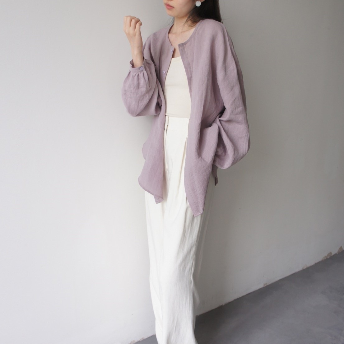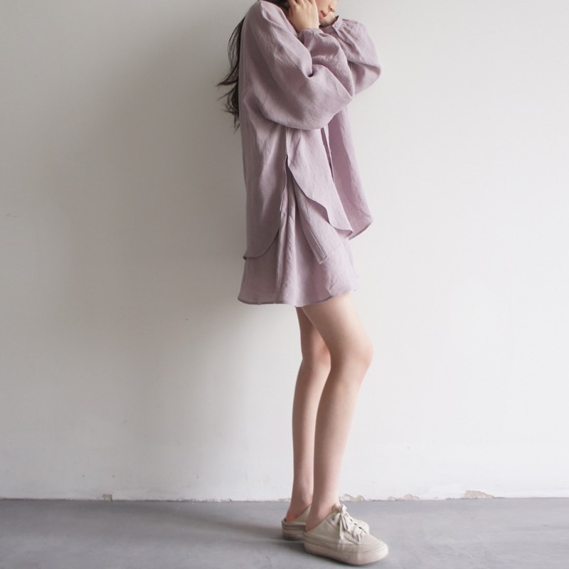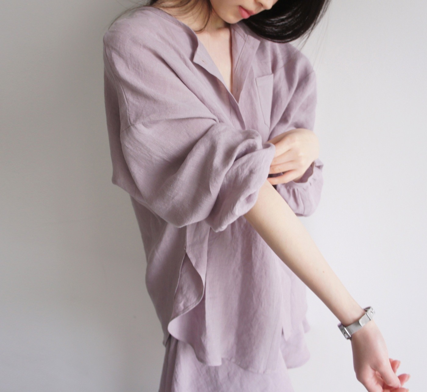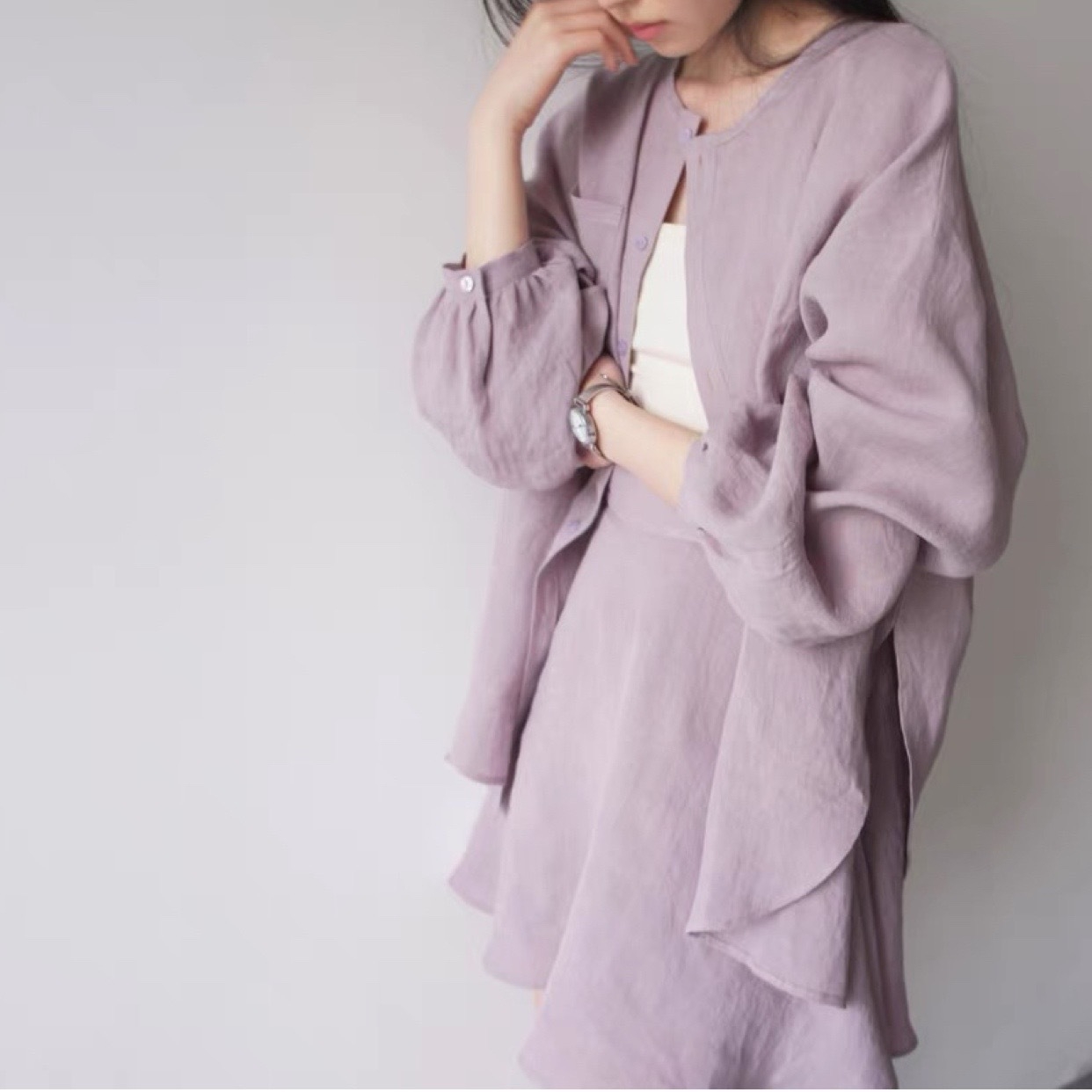 軽やかなパープルカラーが女性らしさを引き立てる、シャツブラウスとキュロットショートパンツのセット。程よくゆとりのあるシルエットが体のラインを拾いにくく、骨格ストレートさんの上半身の厚みや腰まわりを自然にカバーします。すっきりとしたVネック風の襟元がデコルテをきれいに見せ、抜け感のある印象に。セットで着るだけで、こなれ感のある大人カジュアルコーデが完成します。