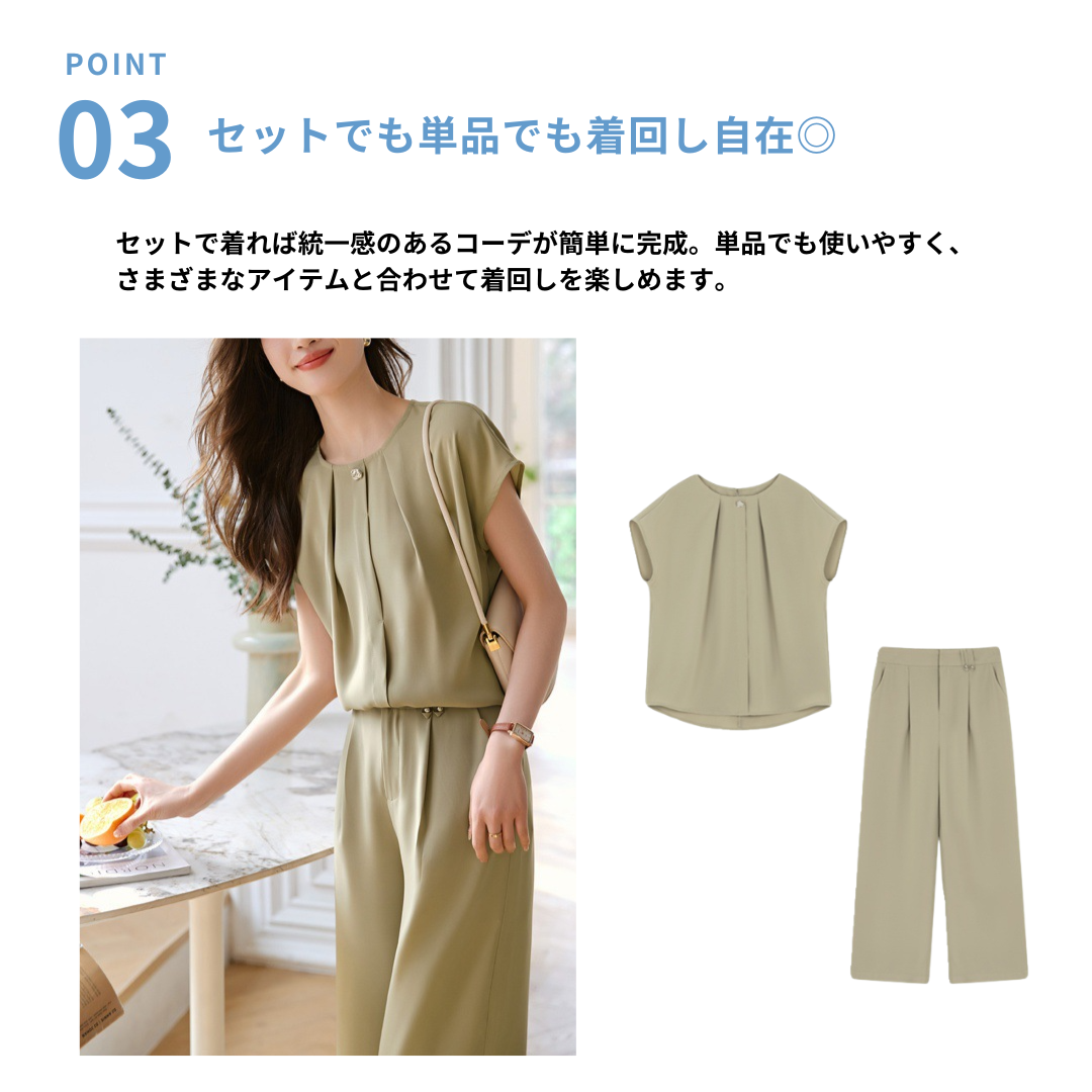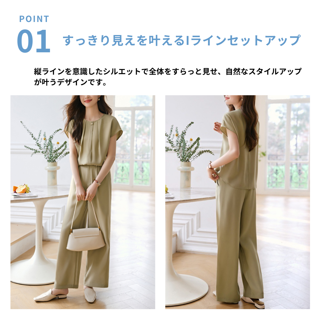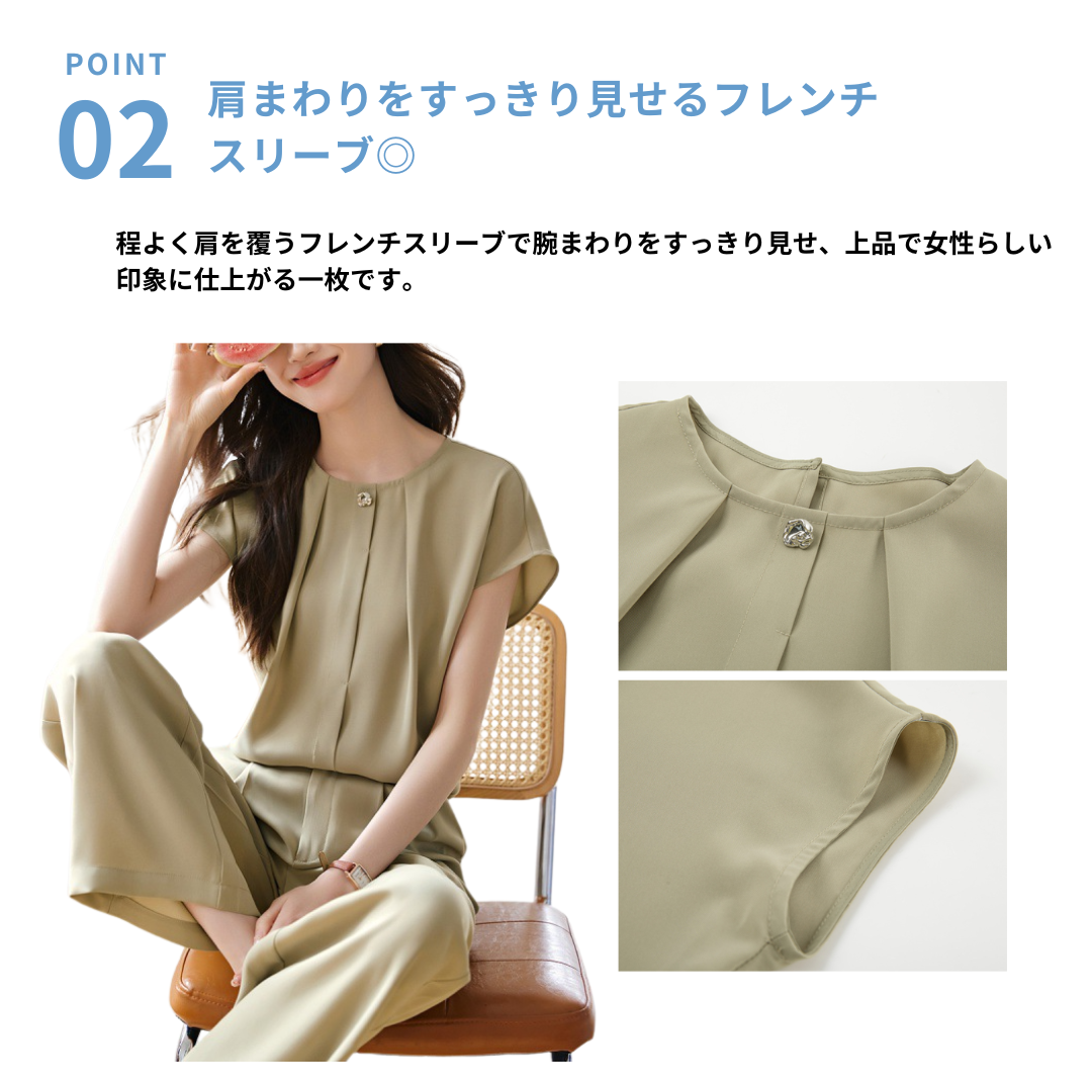 すっきりとしたシルエットで上品に決まる、フレンチスリーブブラウスとワイドパンツのセットアップ。肩まわりを自然にカバーするフレンチスリーブと、落ち感のあるパンツが縦のラインを強調し、骨格ストレートさんの体型をバランスよく引き立てます。シンプルながら洗練されたデザインで、きれいめにもカジュアルにも着回し可能。セットで着るだけで大人のこなれスタイルが完成する万能アイテムです。
