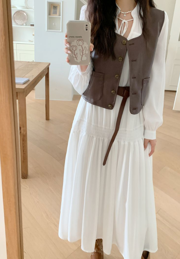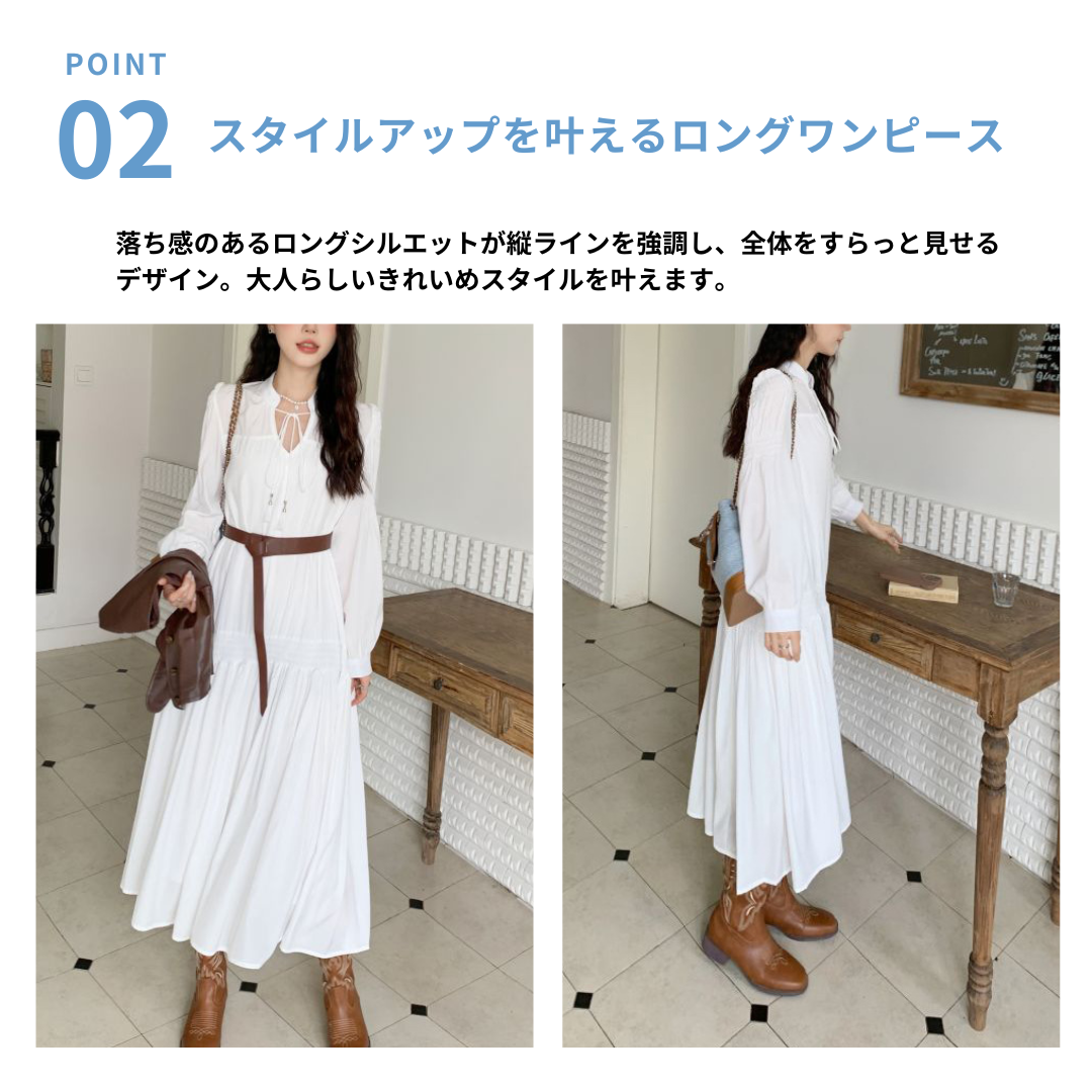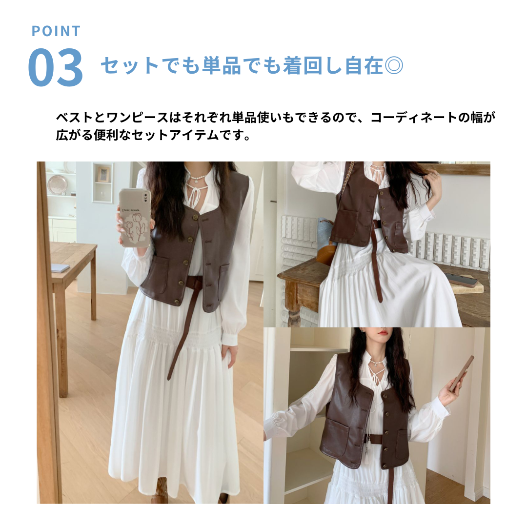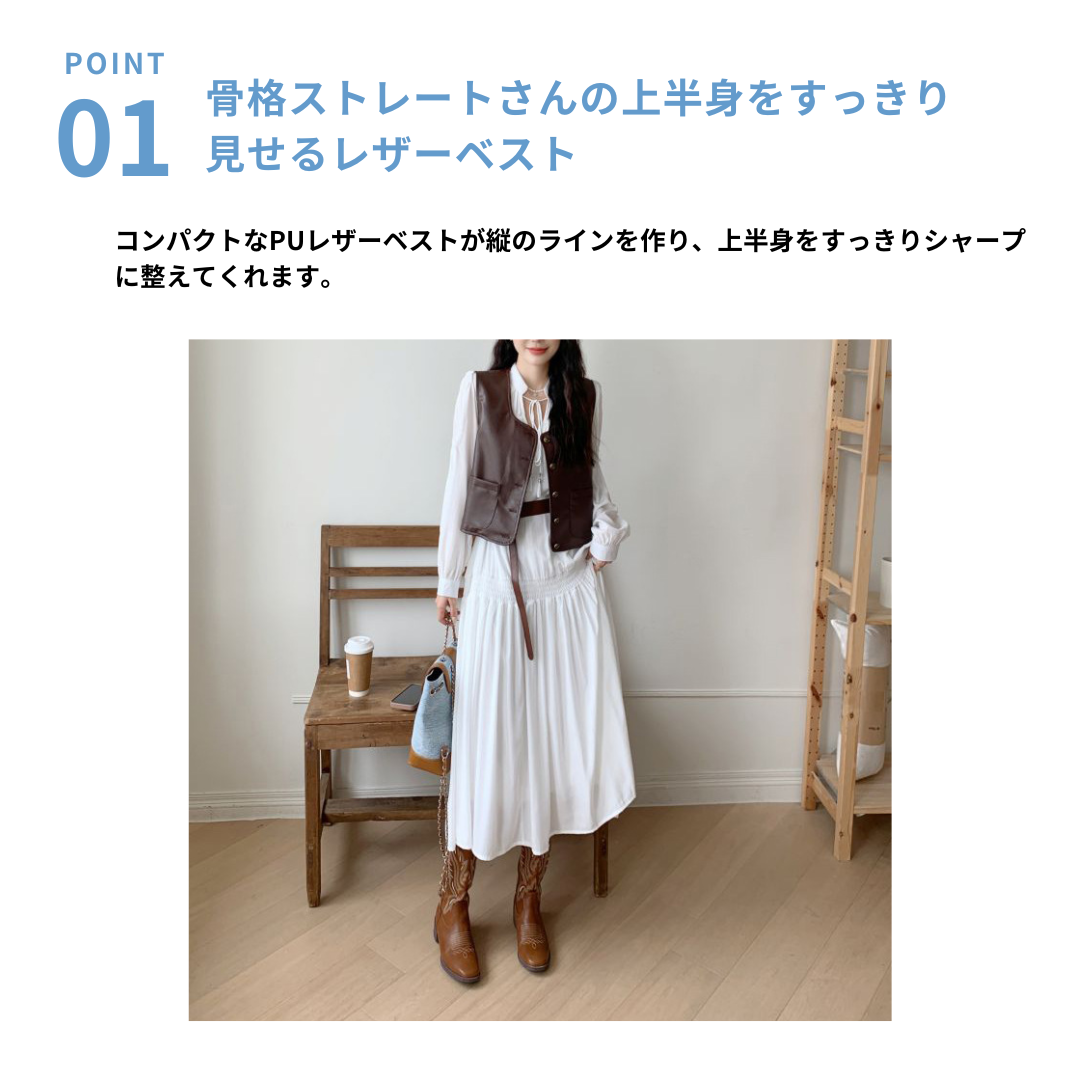 上品なロングワンピースにPUレザーベストを合わせた、大人カジュアルなセットアイテム。Vラインを作るベストデザインが骨格ストレートさんの上半身をすっきり見せ、全体のバランスを整えます。落ち感のあるロングワンピースが縦のラインを強調し、自然なスタイルアップも◎。セットで着るだけでこなれたレイヤードコーデが完成し、それぞれ単品でも着回しが楽しめる万能セットです。